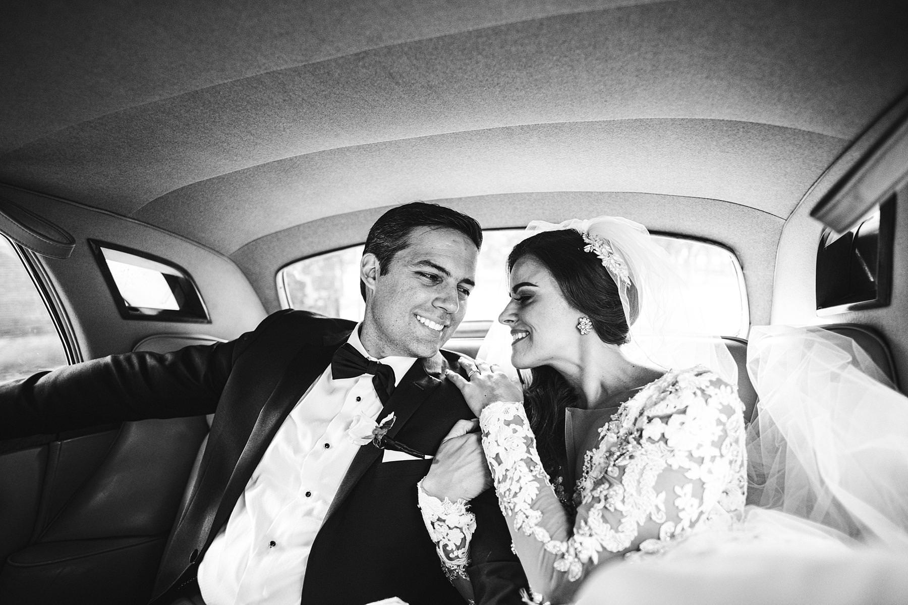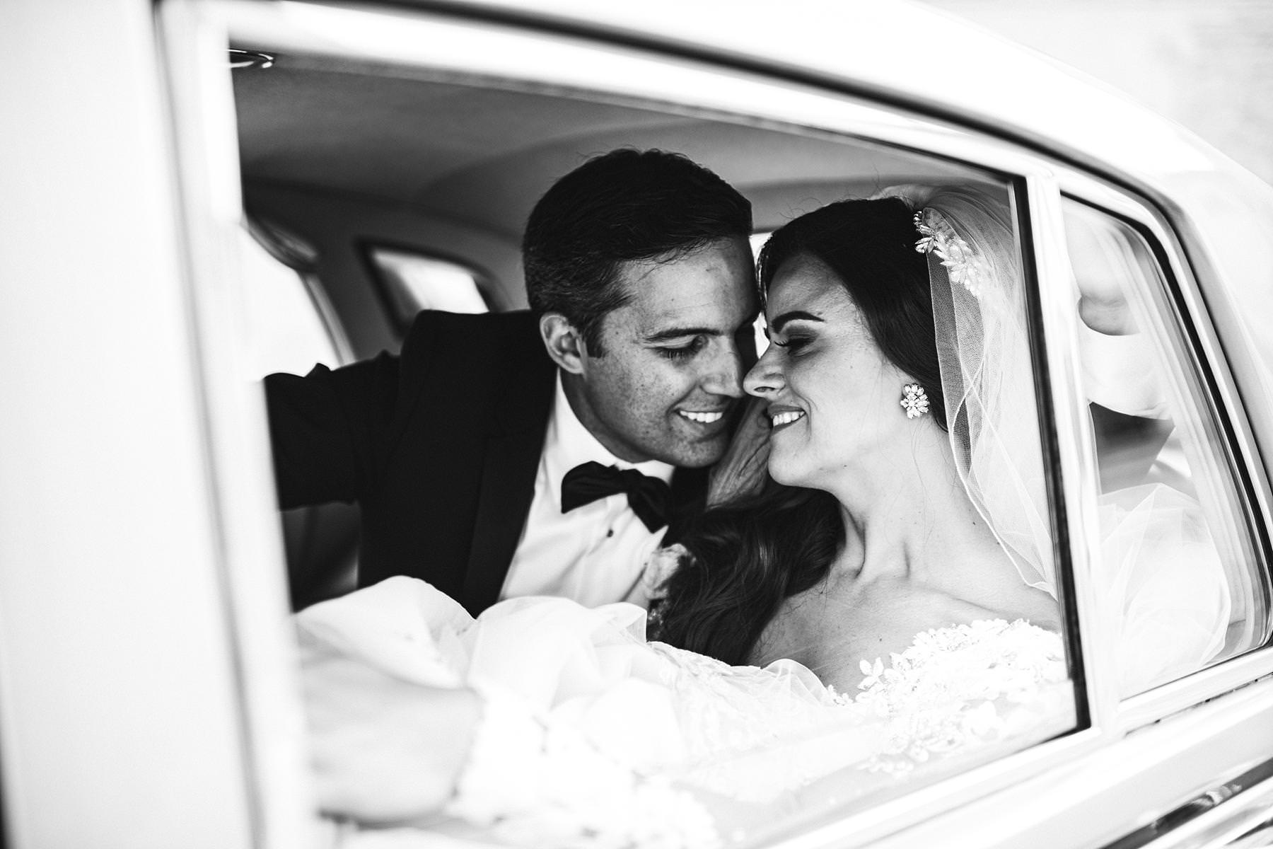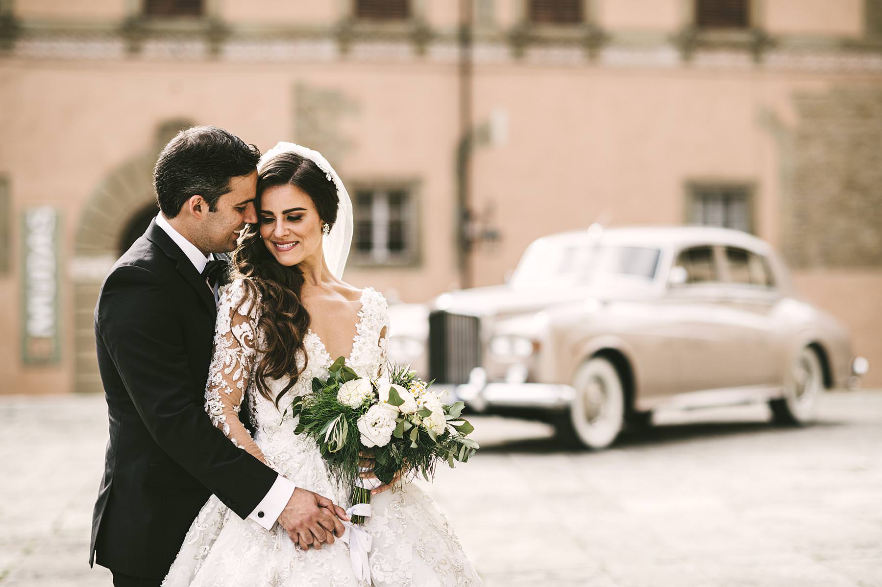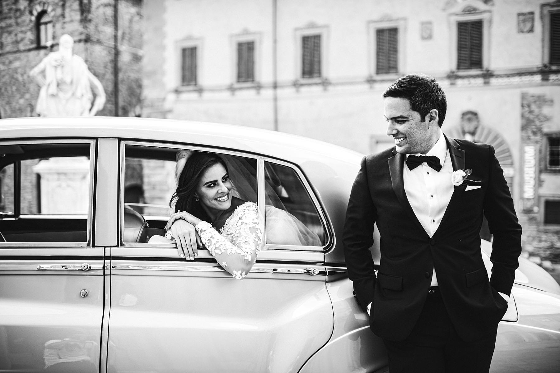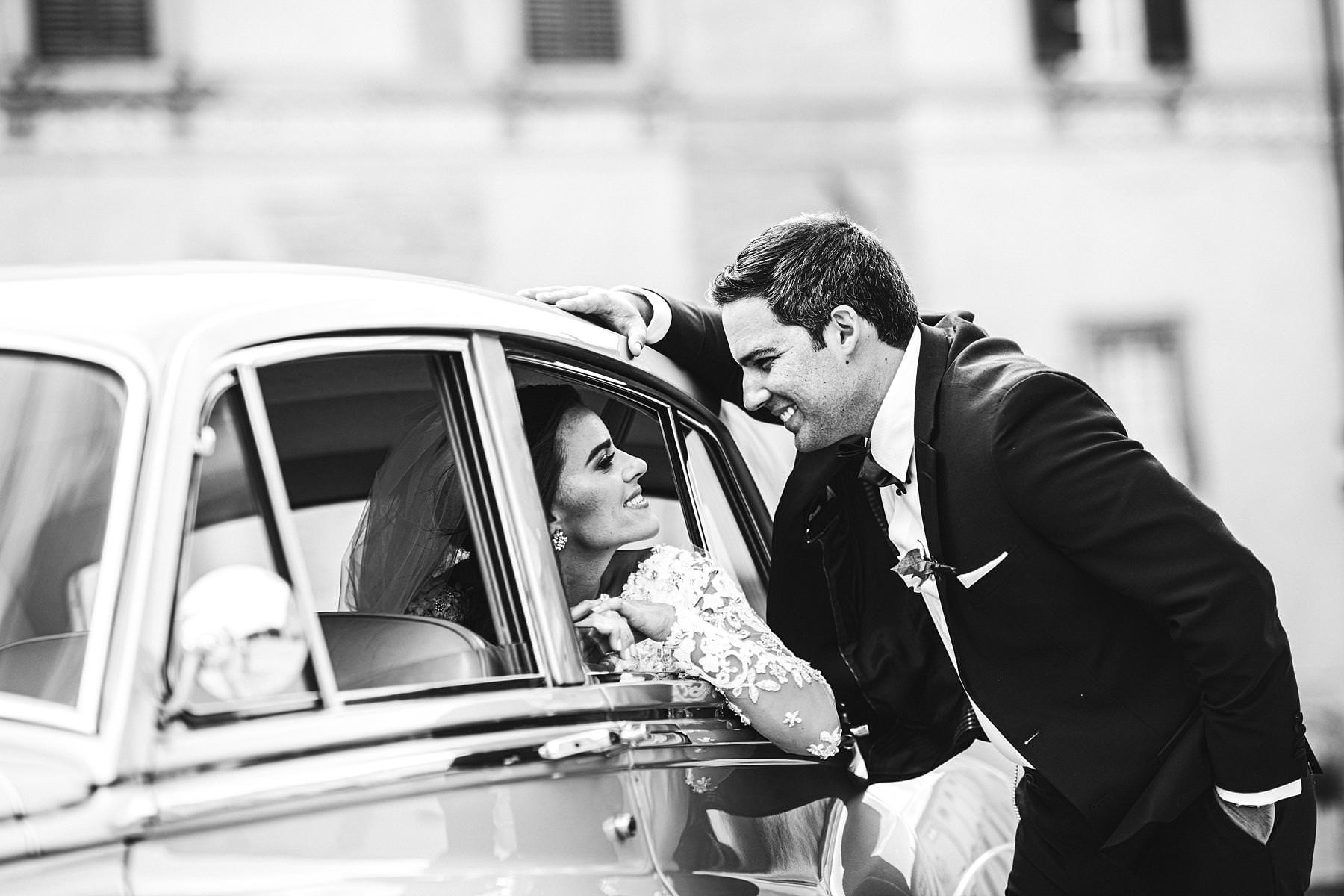 Elegant and intimate bride and groom wedding portrait inside vintage Rolls Royce at Arezzo near the Cathedral. Destination wedding in Tuscany with reception at Valenzano Castle. Photo by the Italian elegant modern wedding photographer in Tuscany based Florence Gabriele Fani
