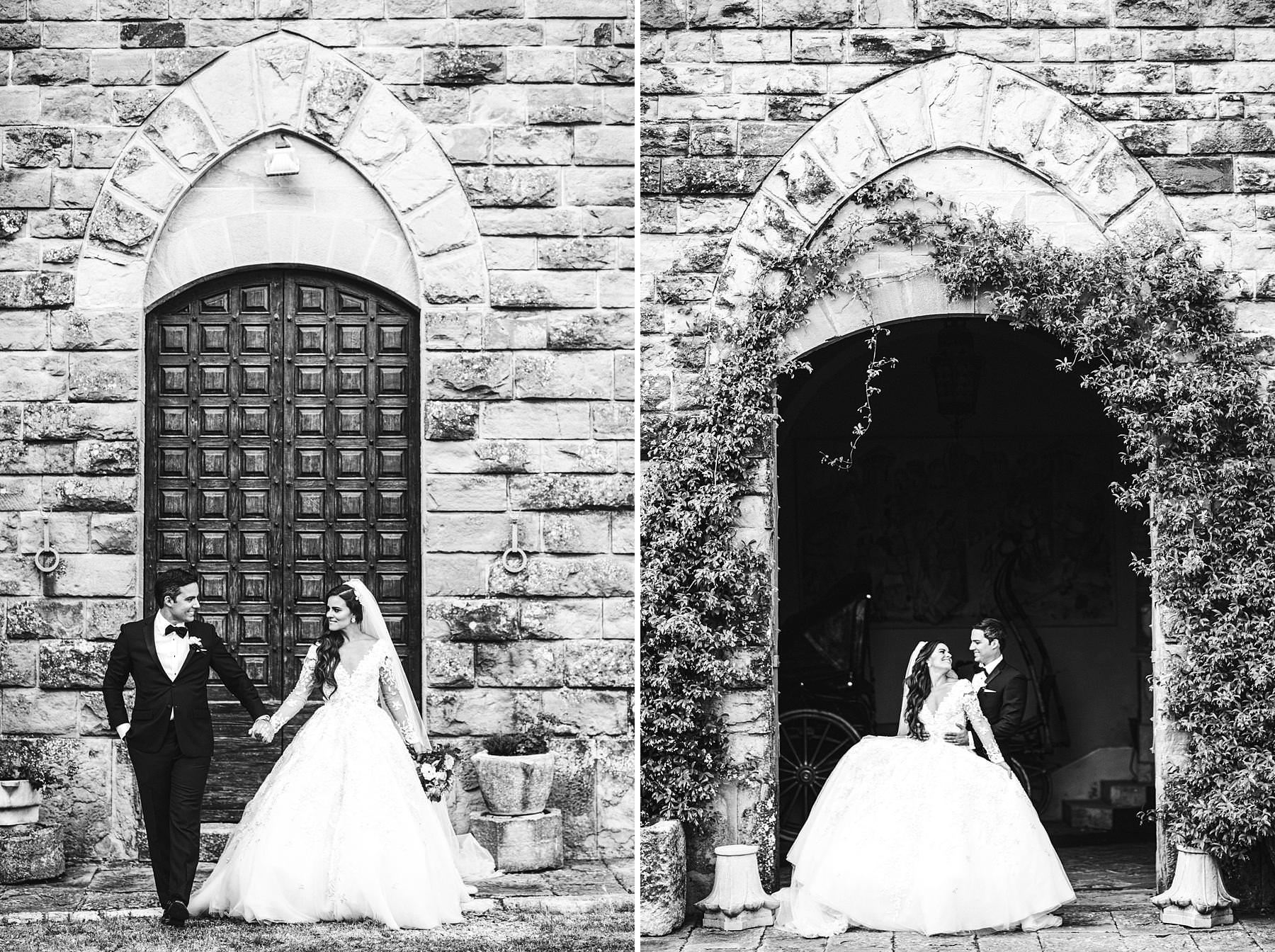 Bride and groom portrait at Valenzano Castle in Tuscany near Arezzo. Photo by the Italian elegant modern wedding photographer in Tuscany based Florence Gabriele Fani