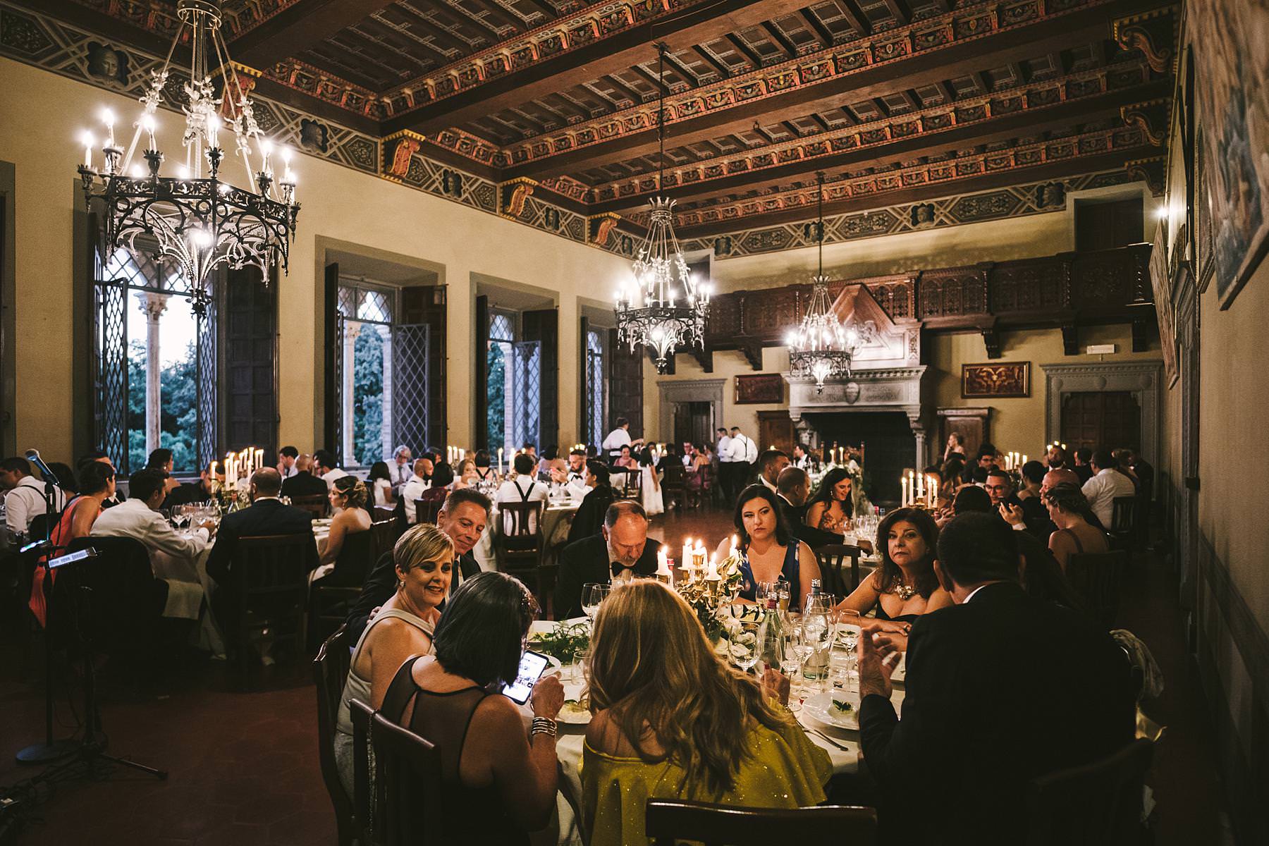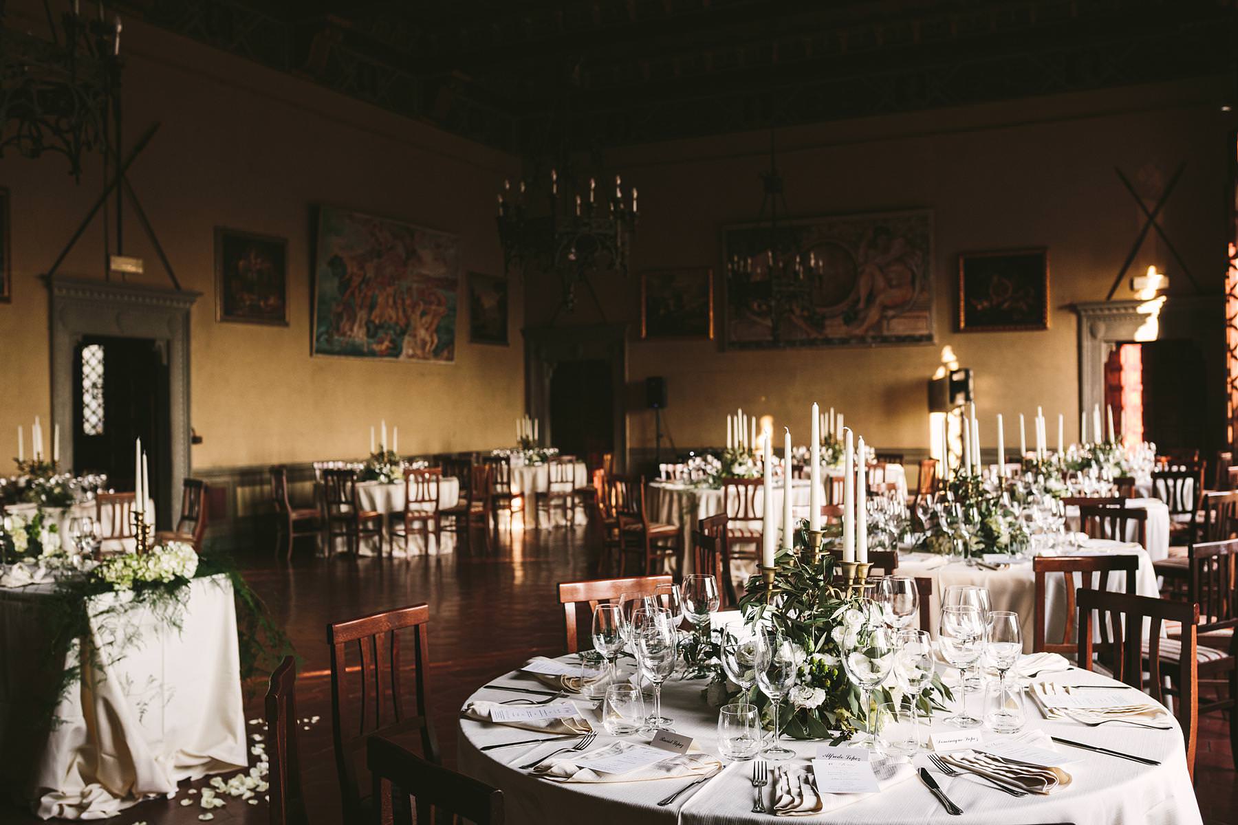 Lovely and elegant dinner decor at Valenzano Castle wedding near Arezzo in the Tuscany countryside. Photo by the Italian elegant modern wedding photographer in Tuscany based Florence Gabriele Fani