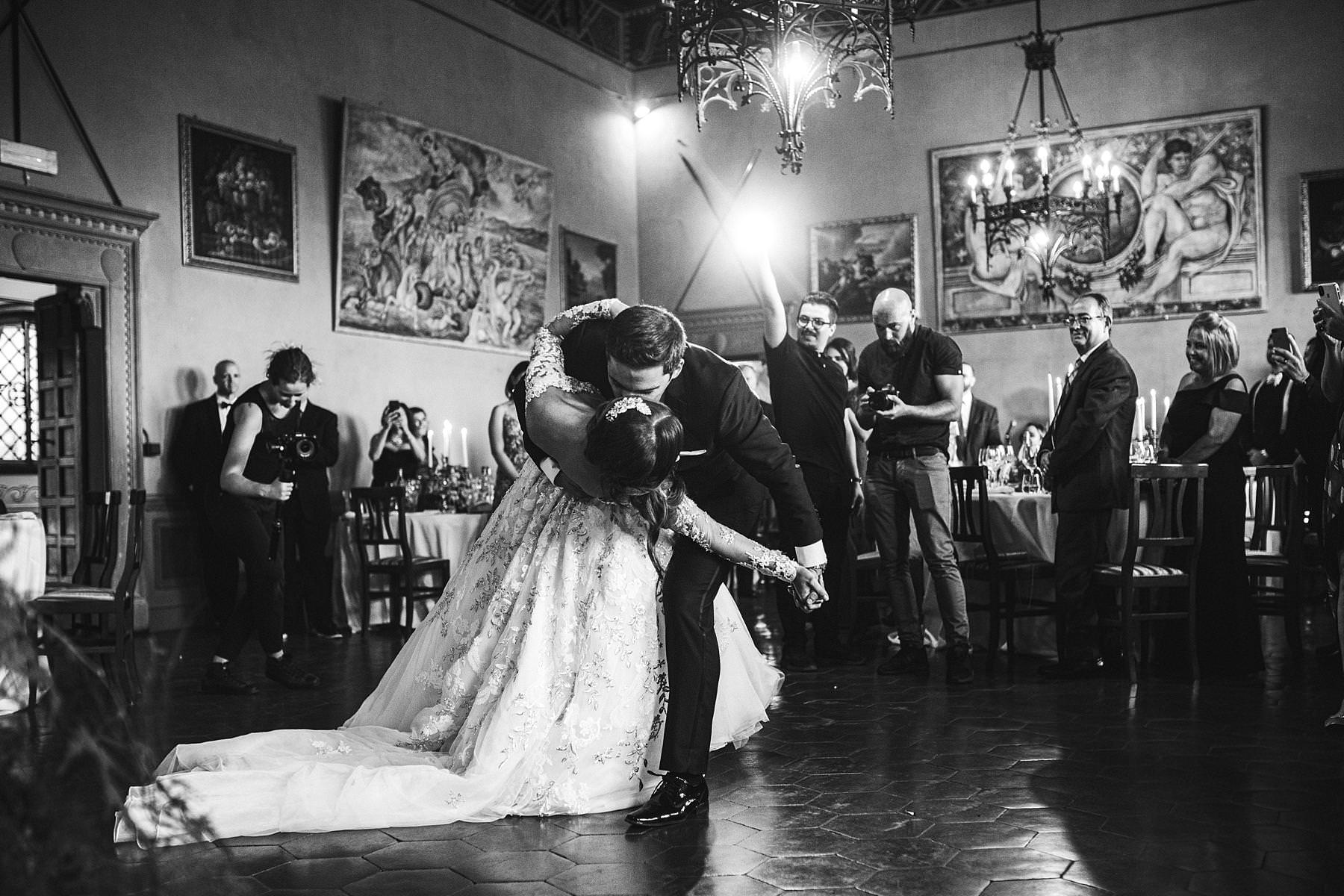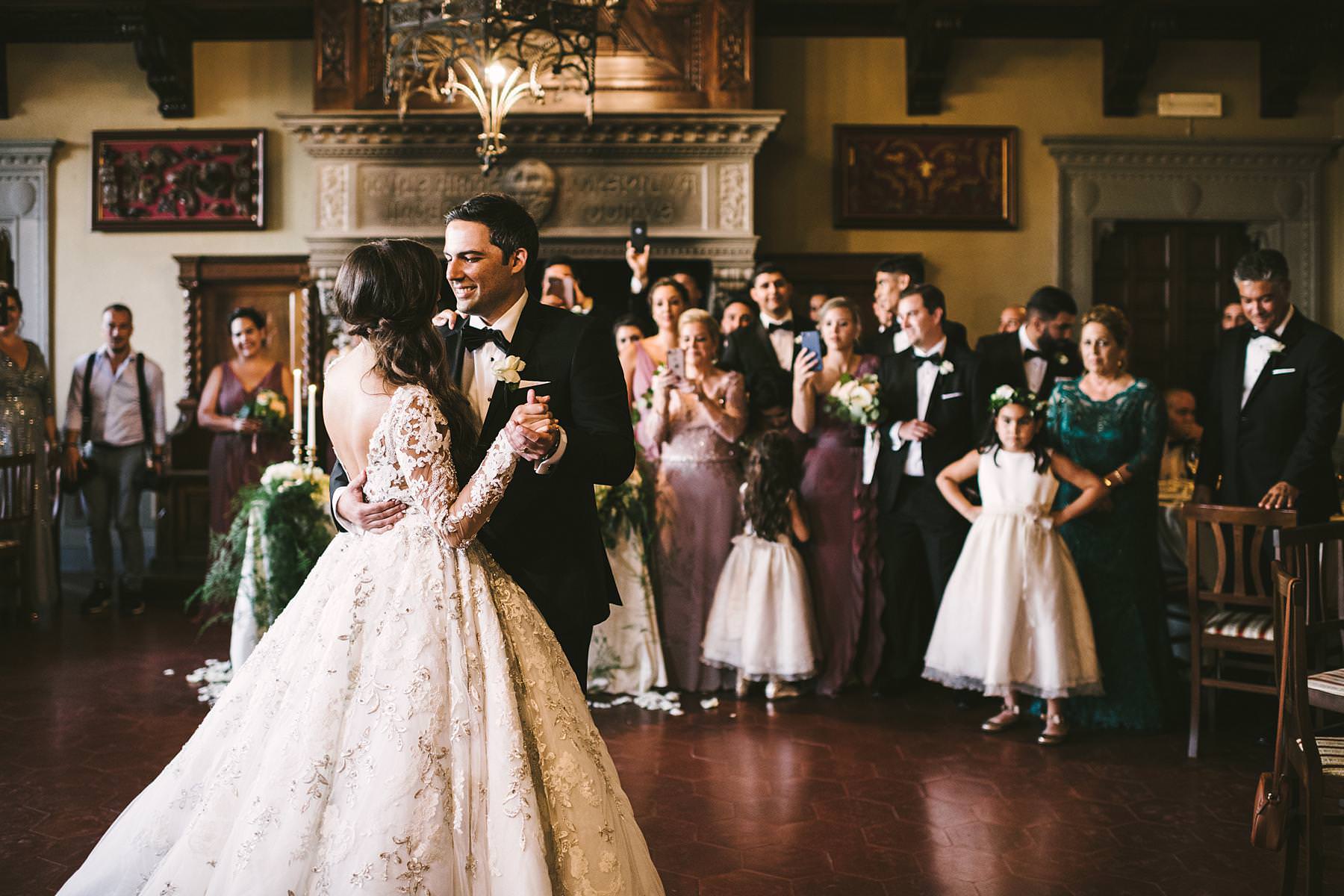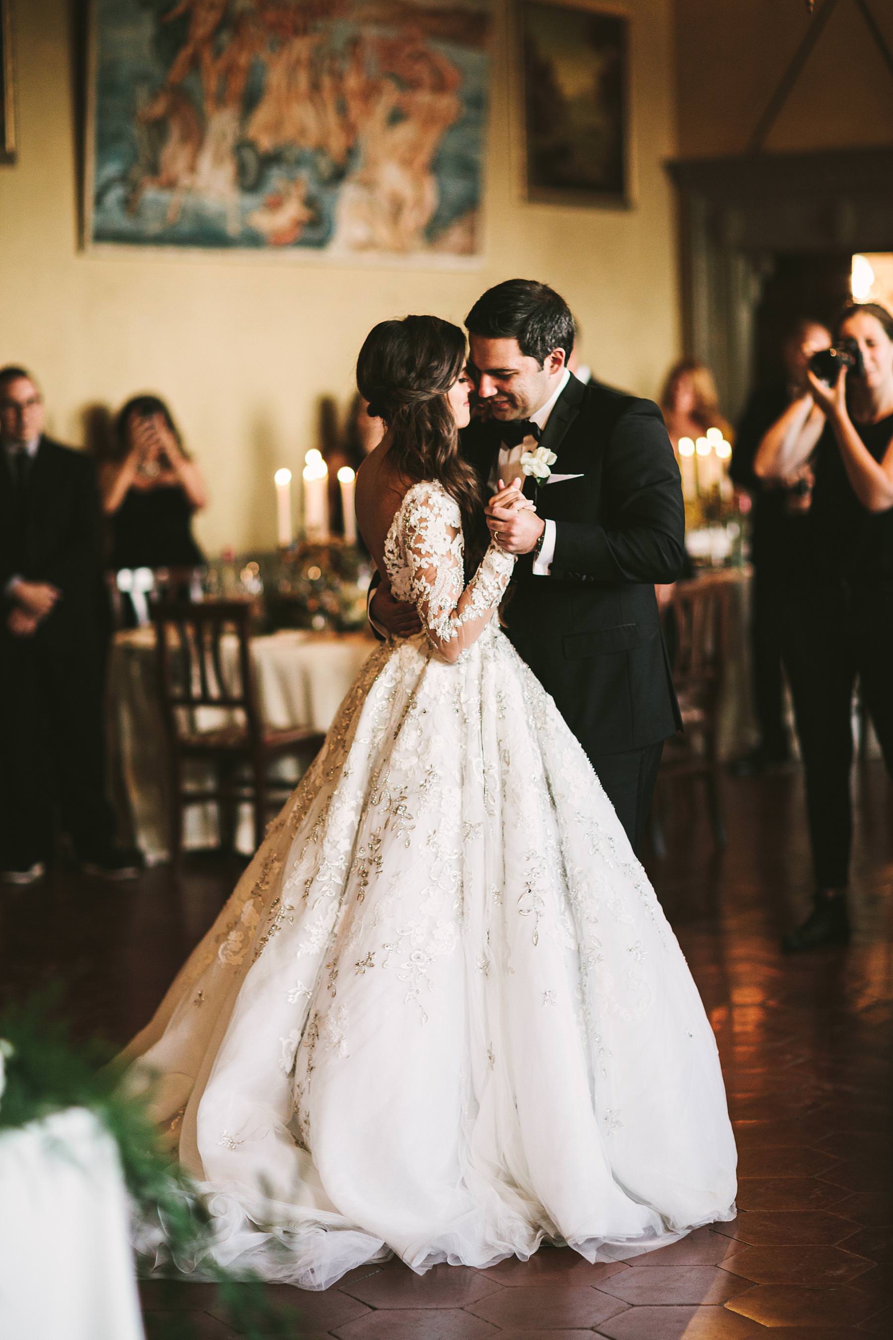 Bride and groom emotional first dance at Valenzano Castle in Tuscany near Arezzo. Destination wedding in Italy Photo by the Italian elegant modern wedding photographer in Tuscany based Florence Gabriele Fani