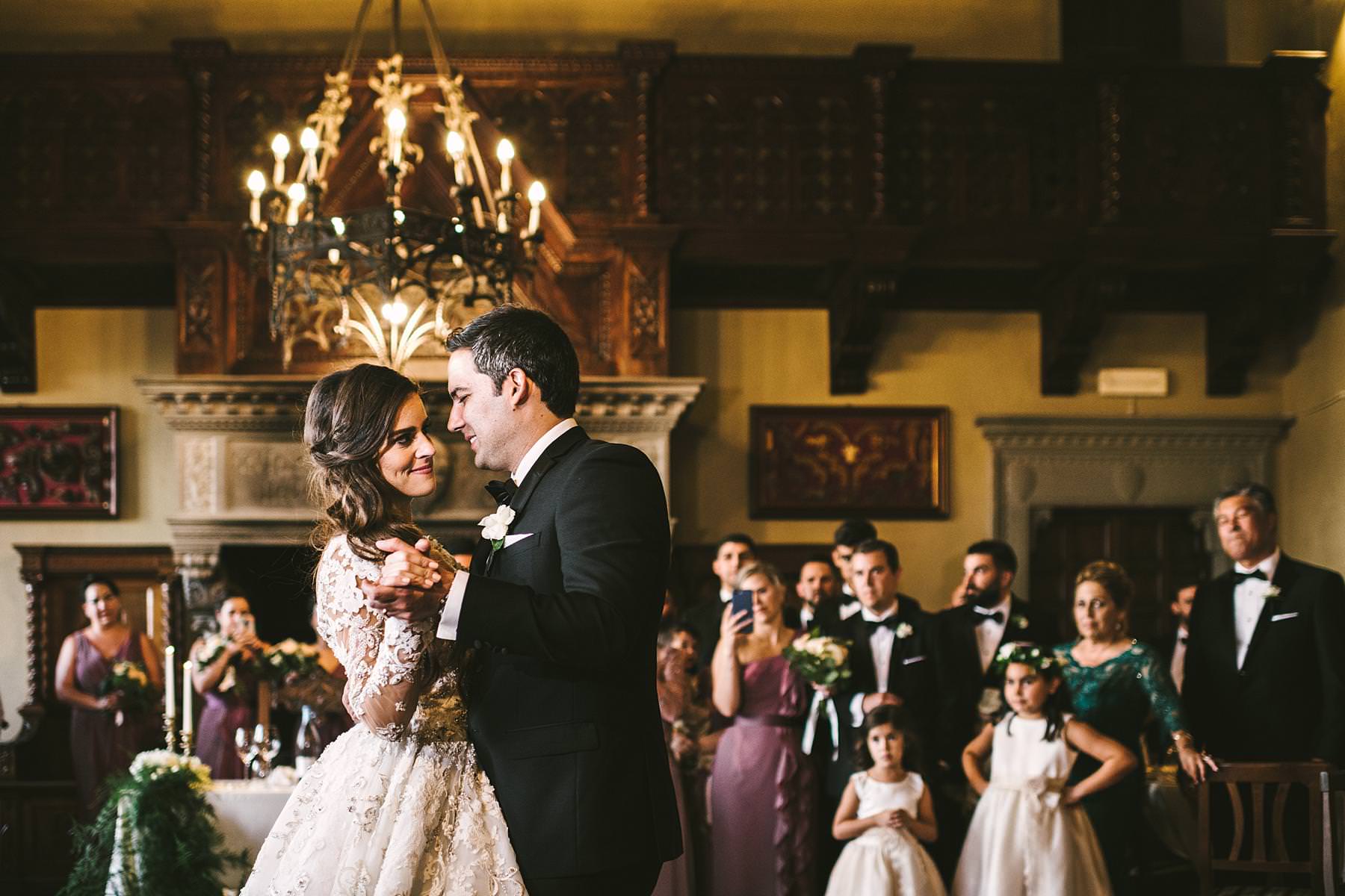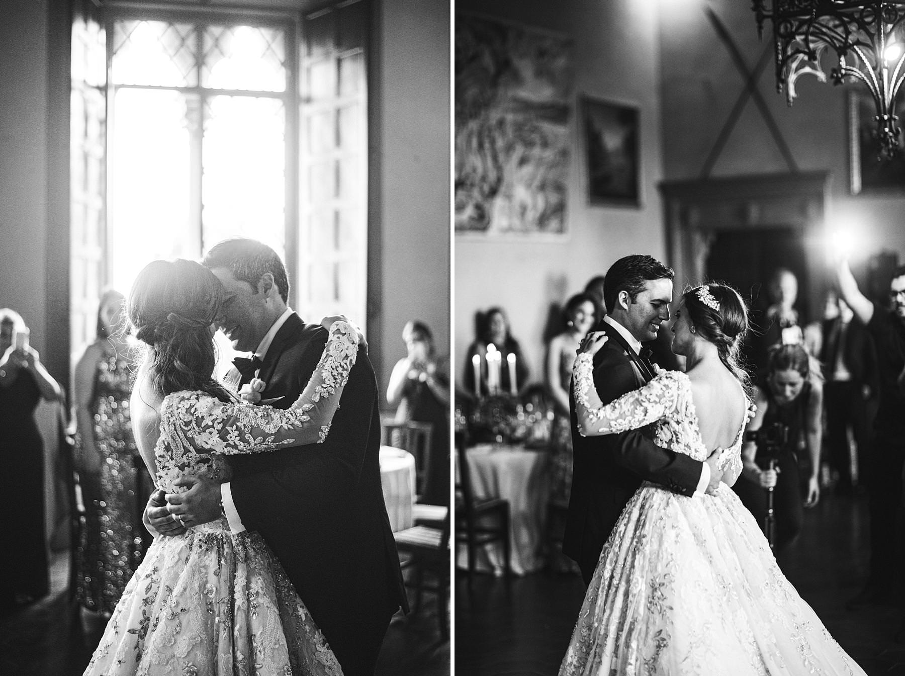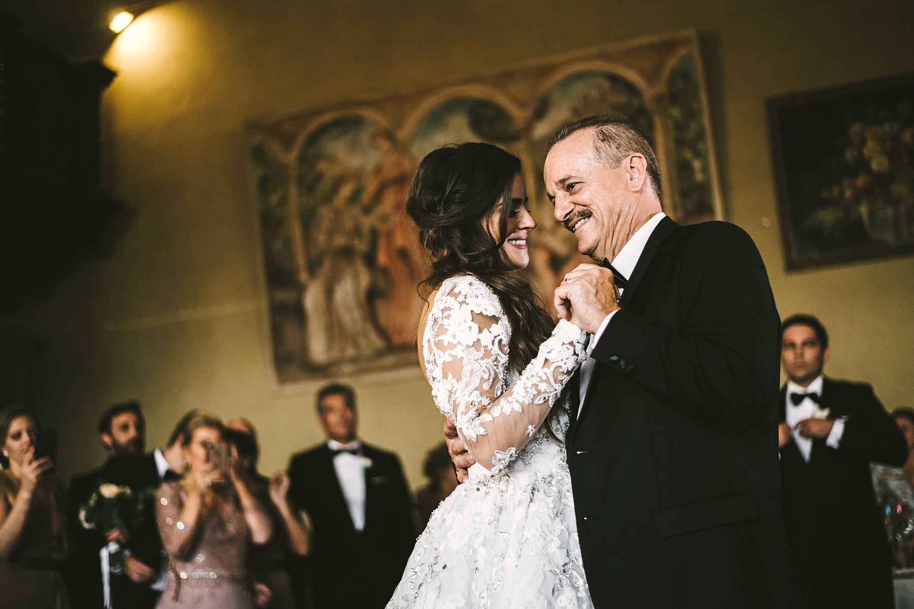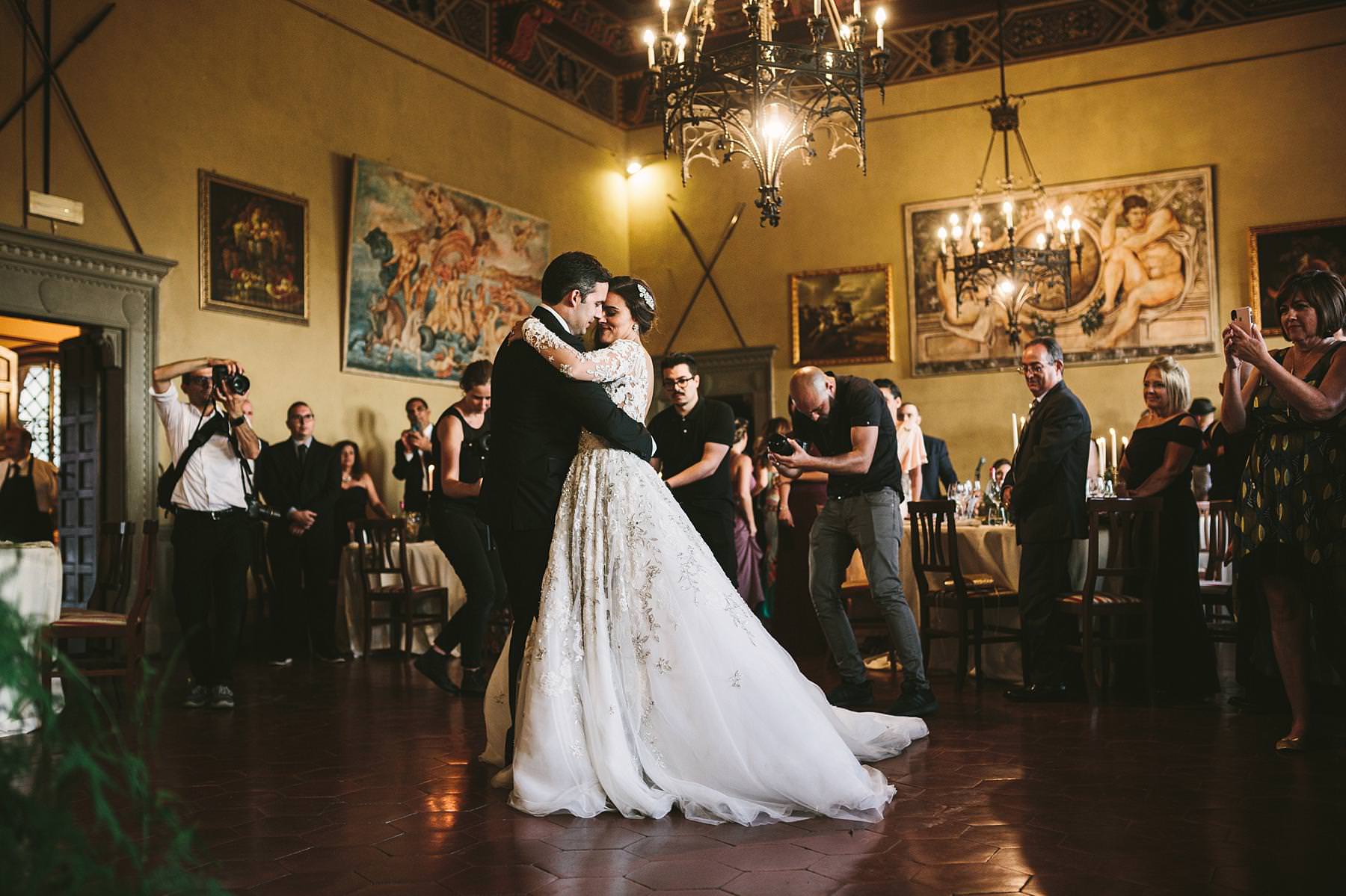 Bride and groom emotional first dance at Valenzano Castle in Tuscany near Arezzo. Destination wedding in Italy Photo by the Italian elegant modern wedding photographer in Tuscany based Florence Gabriele Fani