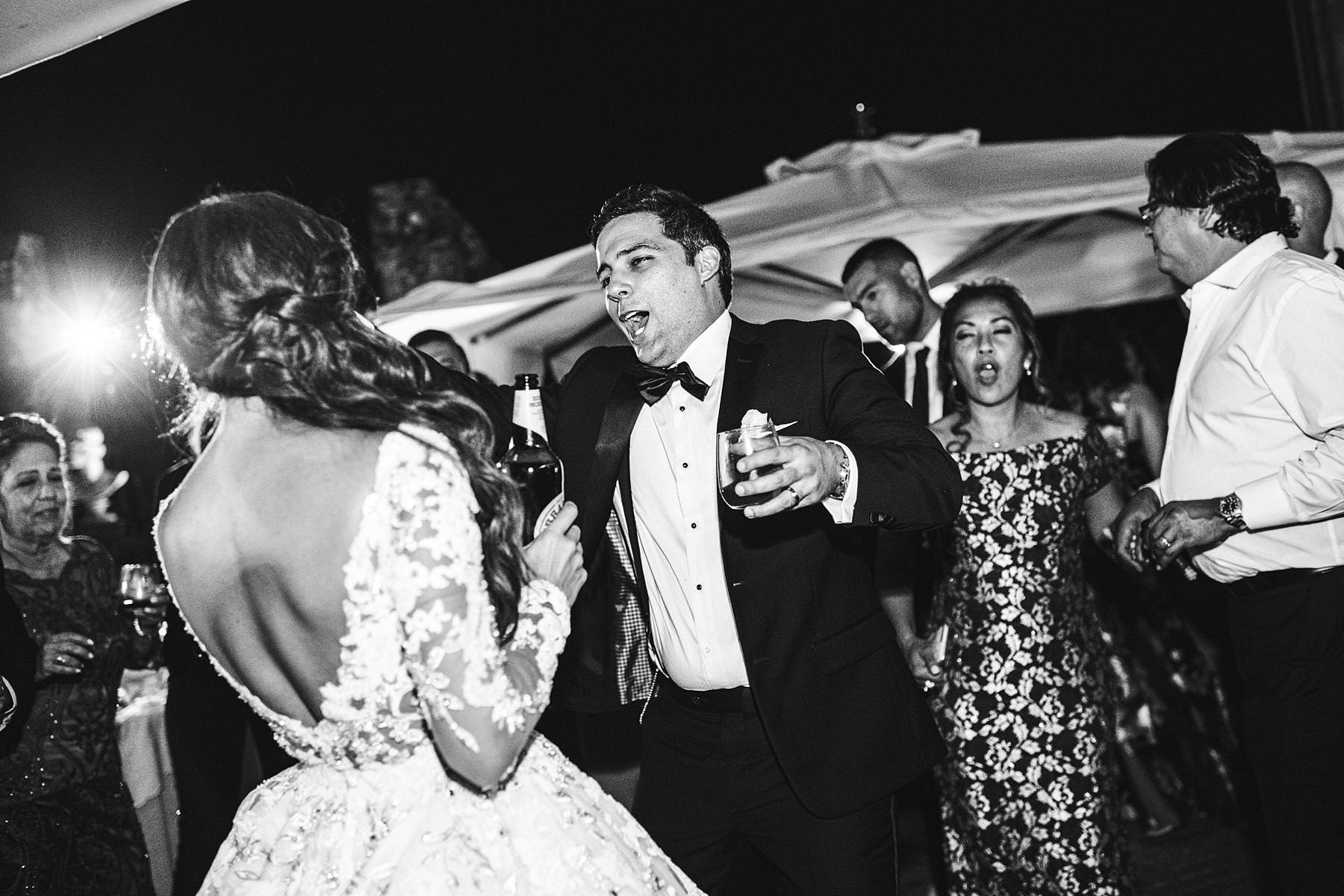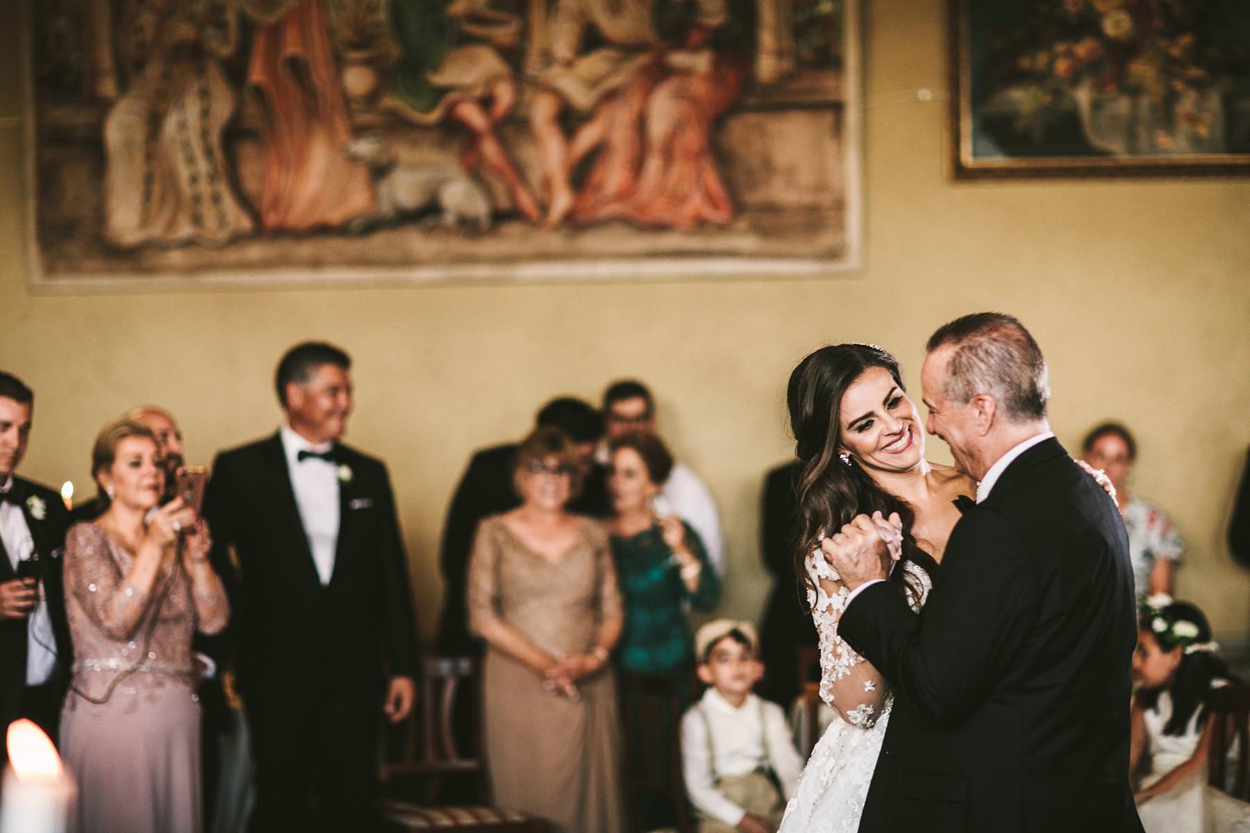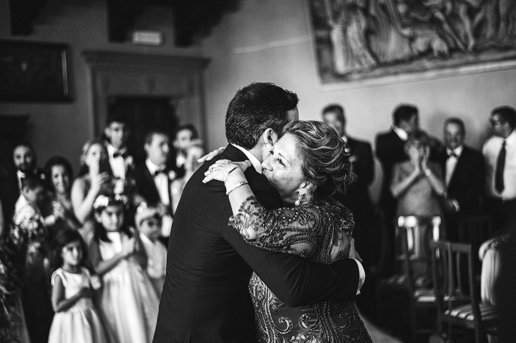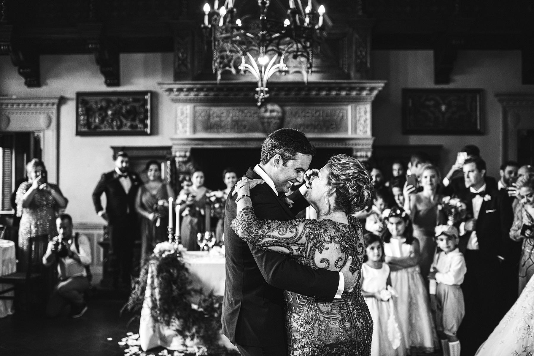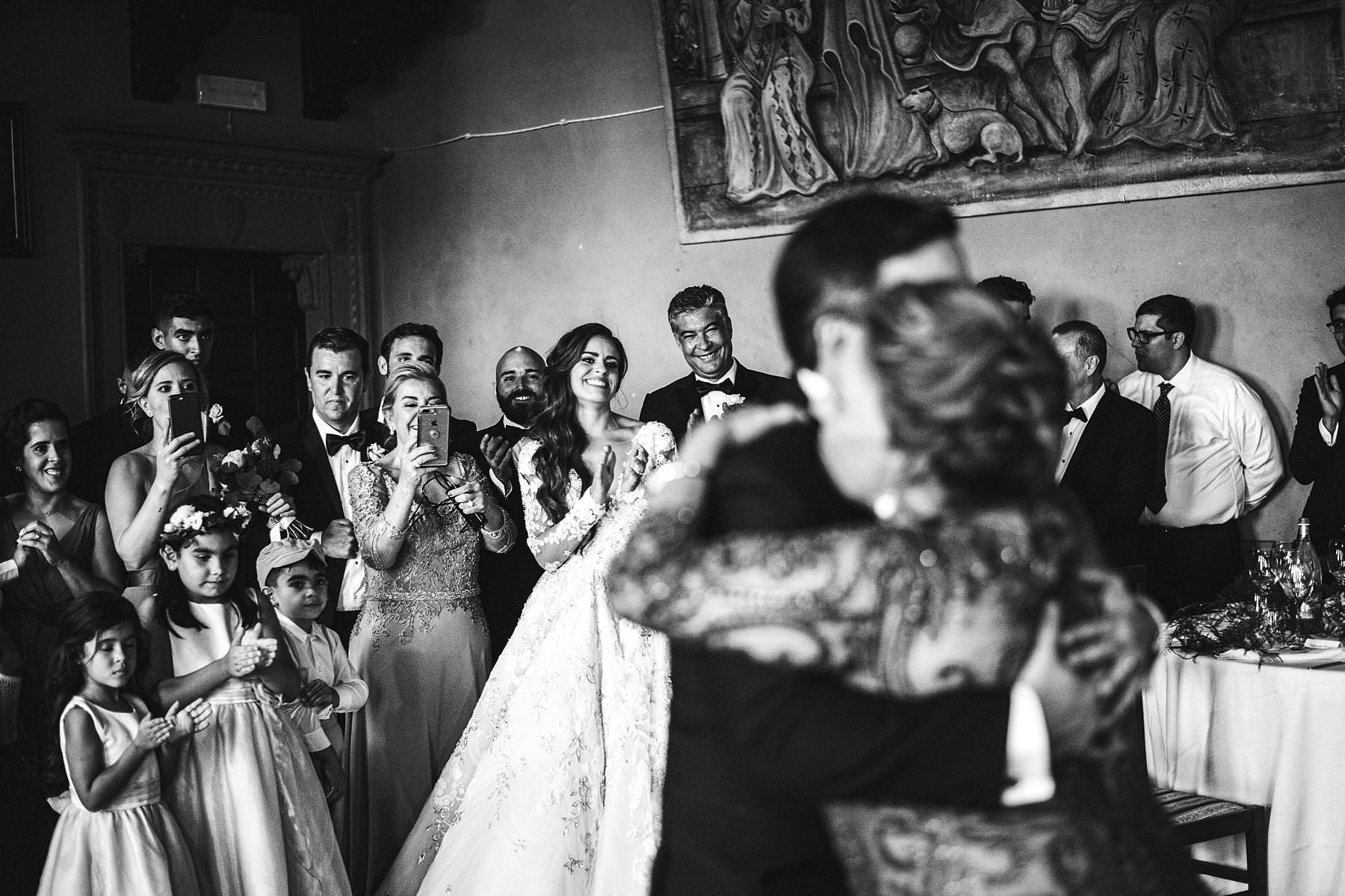 Reportage destination wedding photographer in Tuscany at Valenzano Castle. Groom and mother dance with bride reaction. Photo by the Italian elegant modern wedding photographer in Tuscany based Florence Gabriele Fani
