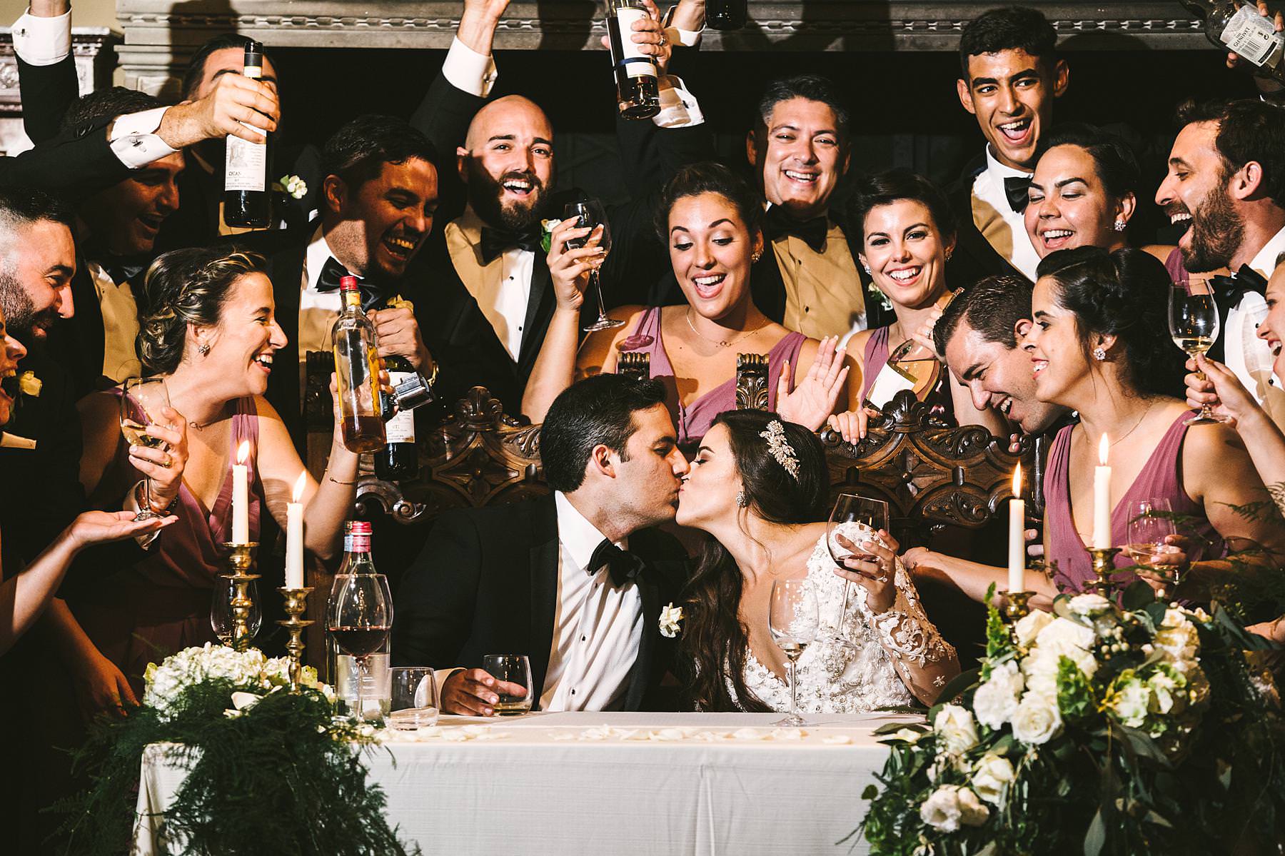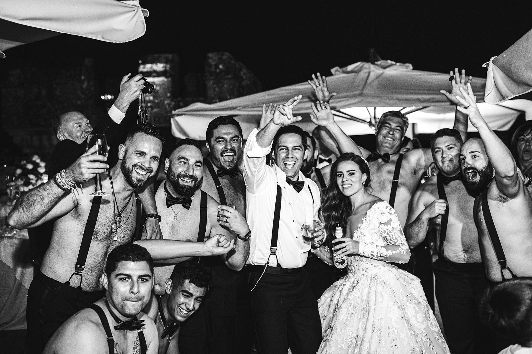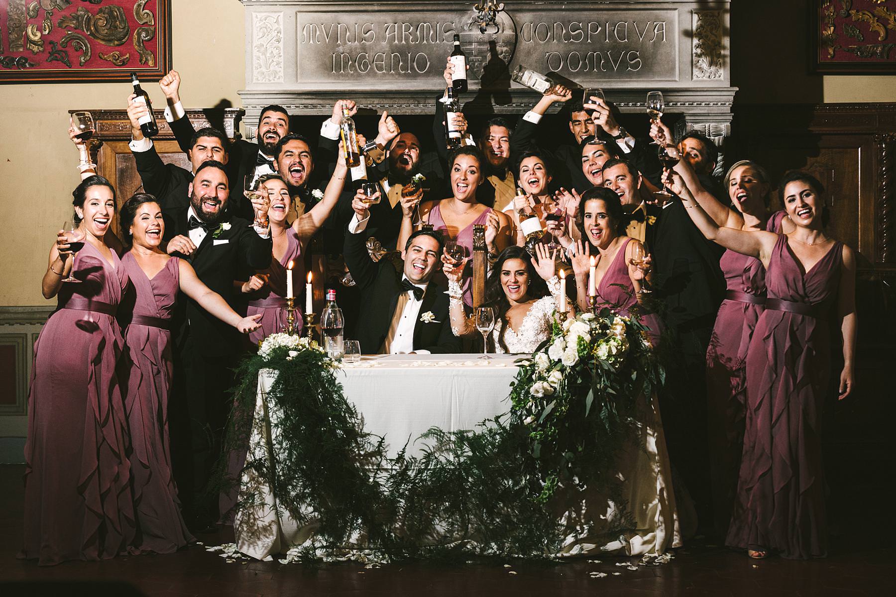 Gorgeous memorie during destination wedding reception at Castle of Valenzano in Tuscany near Arezzo. Bride and groom with bridal party! Photo by the Italian elegant modern wedding photographer in Tuscany based Florence Gabriele Fani