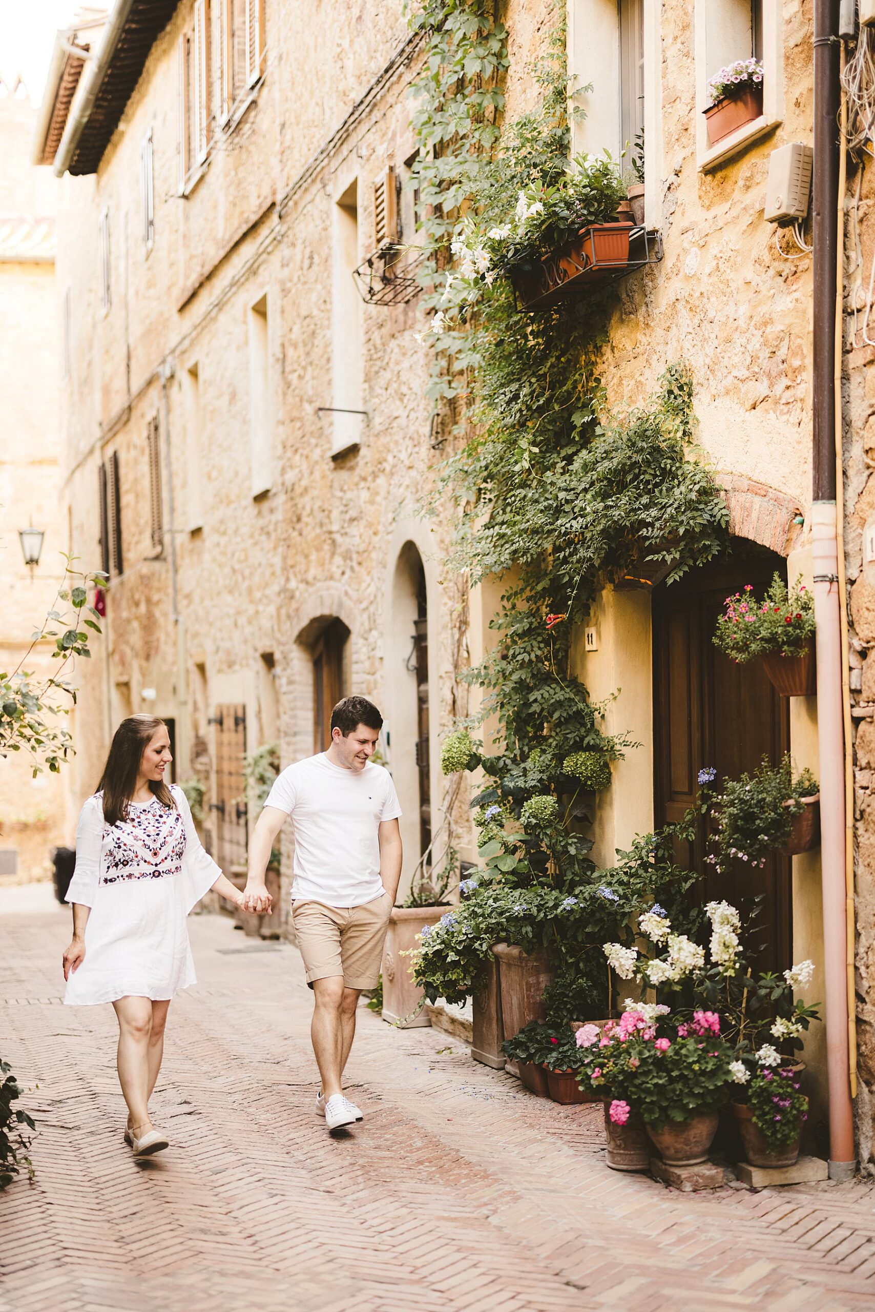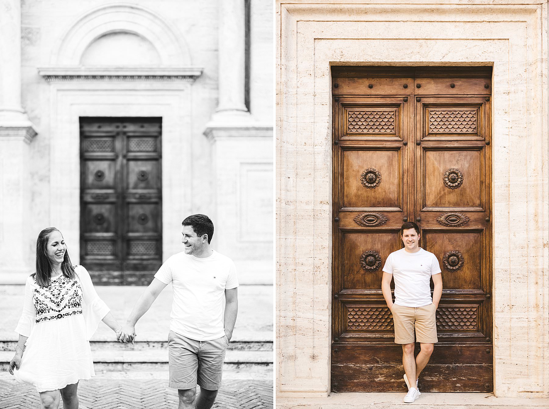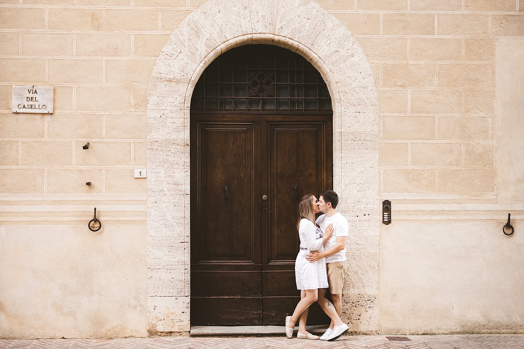 We started the romantic couple photoshoot in Pienza, a Medieval hamlet near Siena, tucked among the picturesque hills. Roaming its alleys and stopping in front of historic wooden doors, we had the chance to break the ice and get to know each other.
