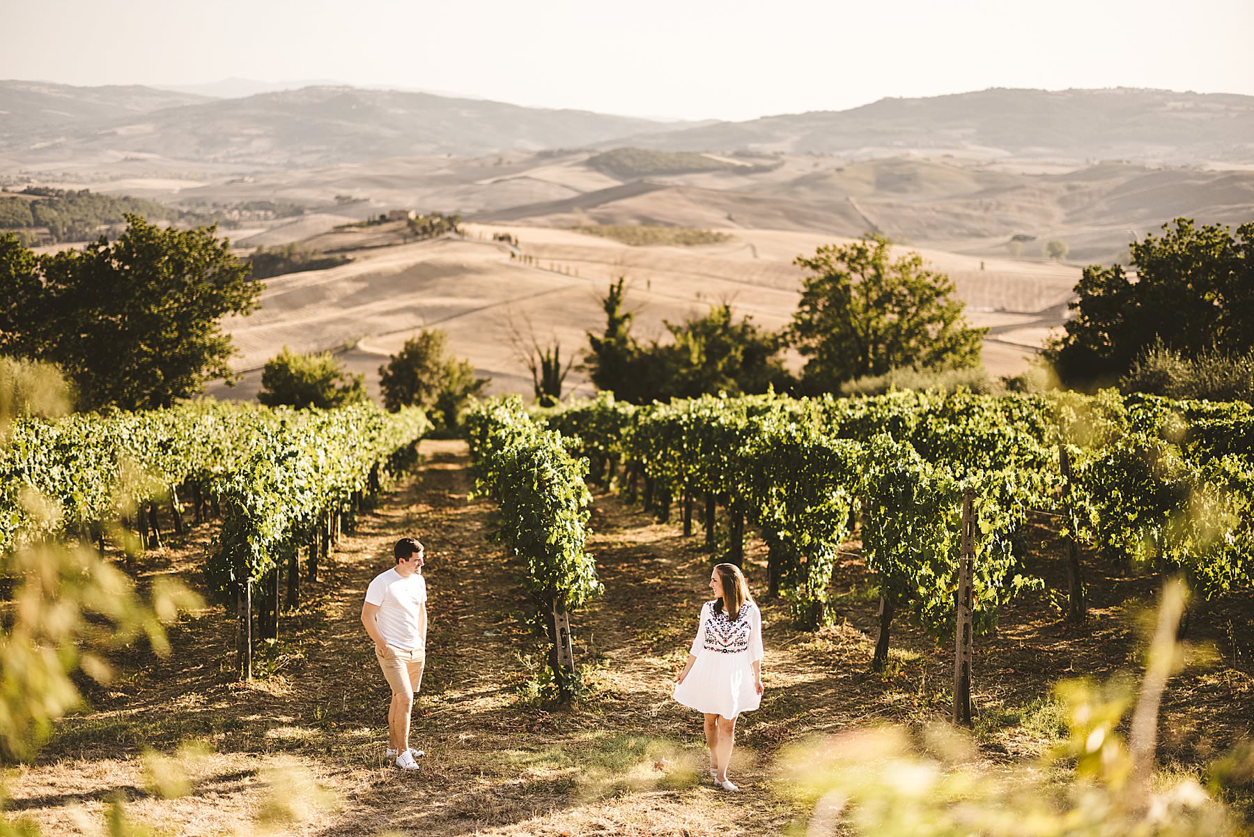 Summer vacation honeymoon photo shoot in the magic vineyards of Val d’Orcia, Tuscany. Photo by the Italian creative, elegant and modern engagement photographer in Tuscany Gabriele Fani.