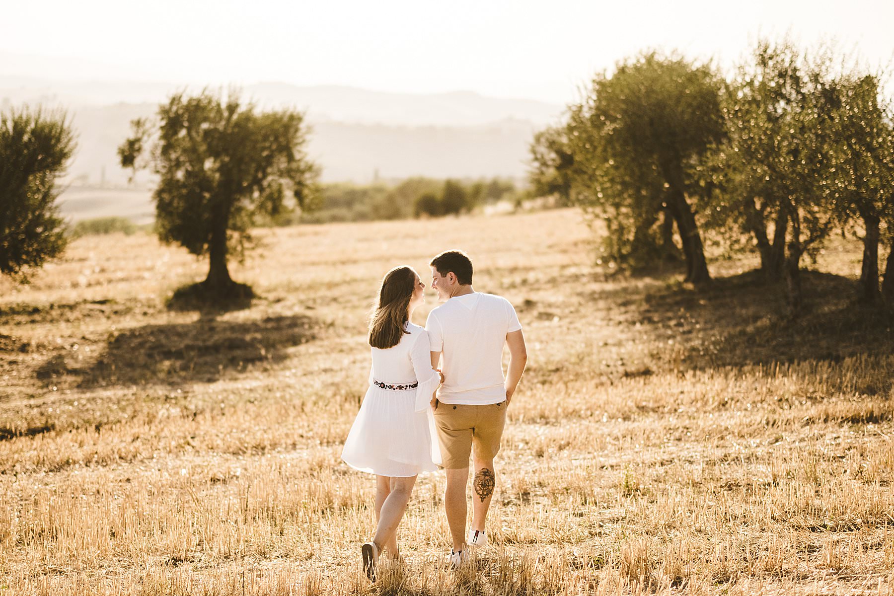 Romantic couple photoshoot in the scenic countryside of Tuscany near Pienza. Beautiful walk tour in the olive groves of the Val D’Orcia. Photo by the Italian creative, elegant and modern engagement photographer in Tuscany Gabriele Fani.