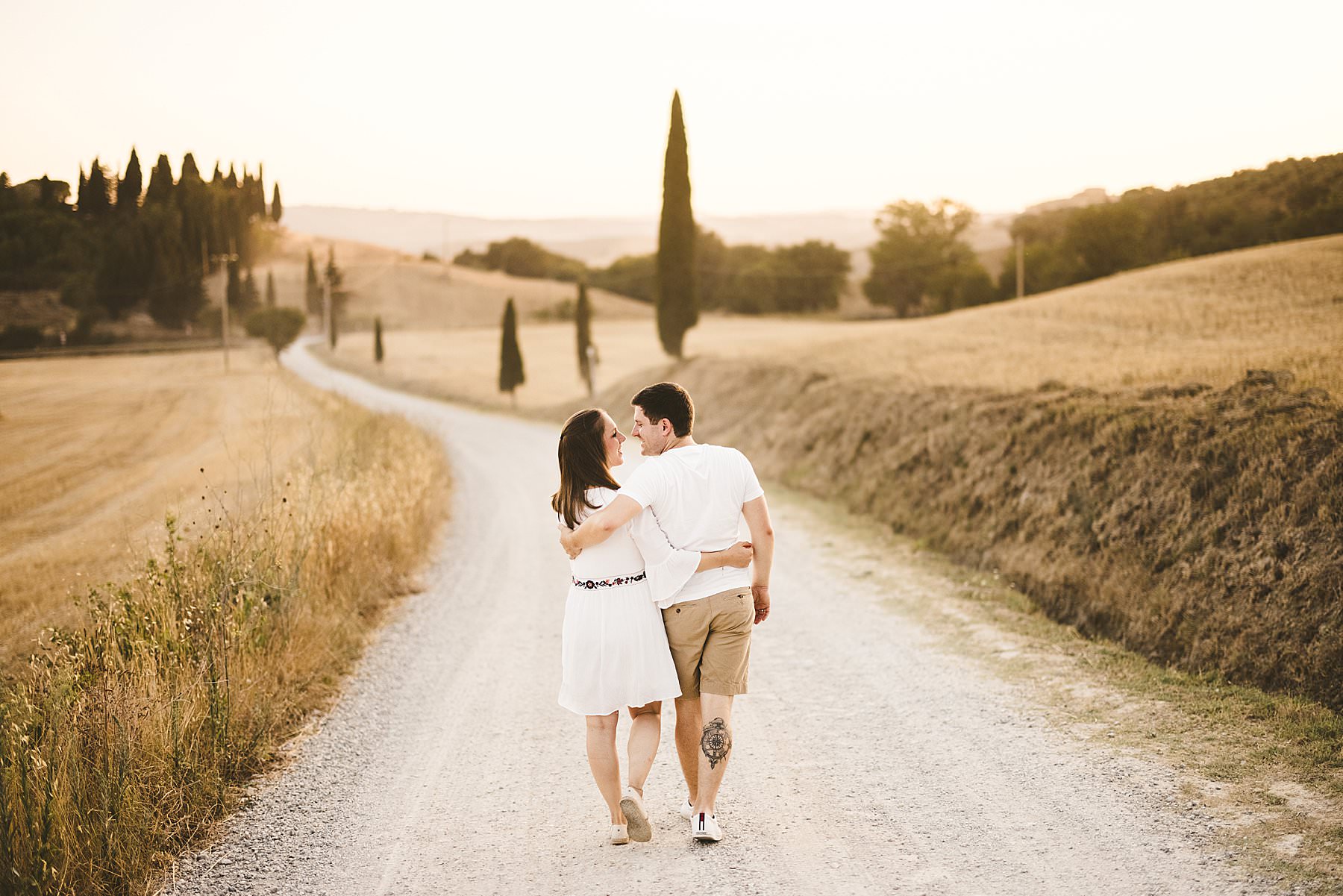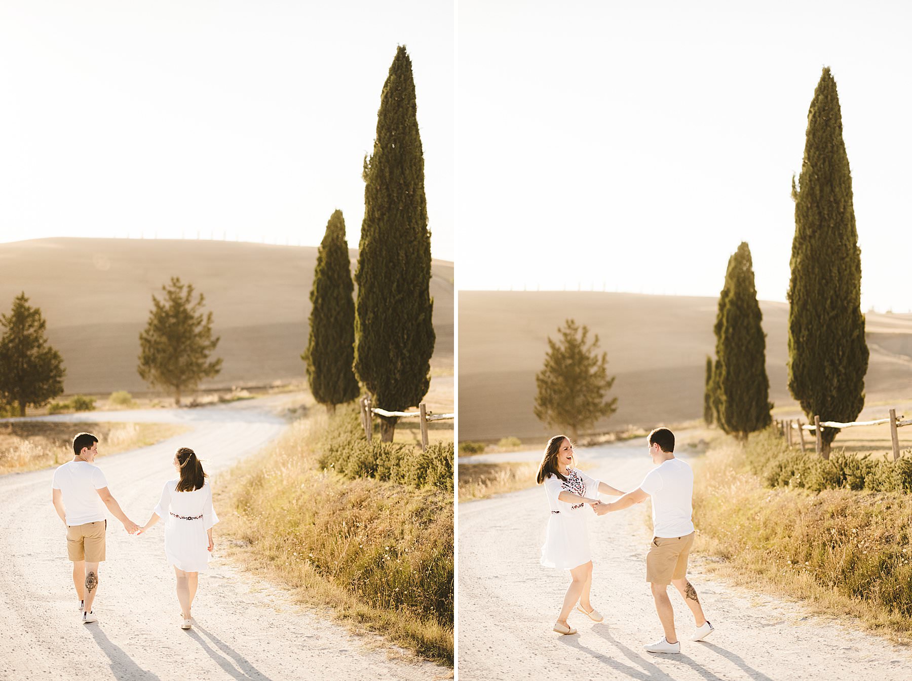 Lovely couple photo shoot in Tuscany countryside near Pienza with rolling hills and cypresses streets. Photo by the Italian creative, elegant and modern engagement photographer in Tuscany Gabriele Fani.