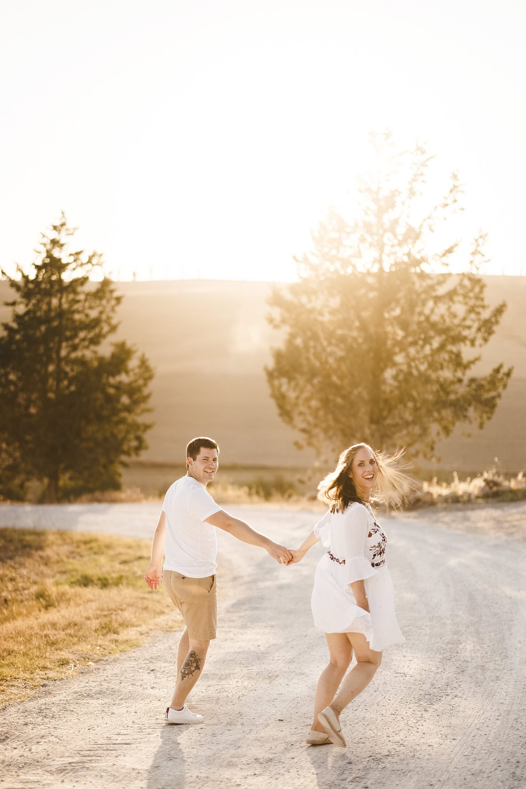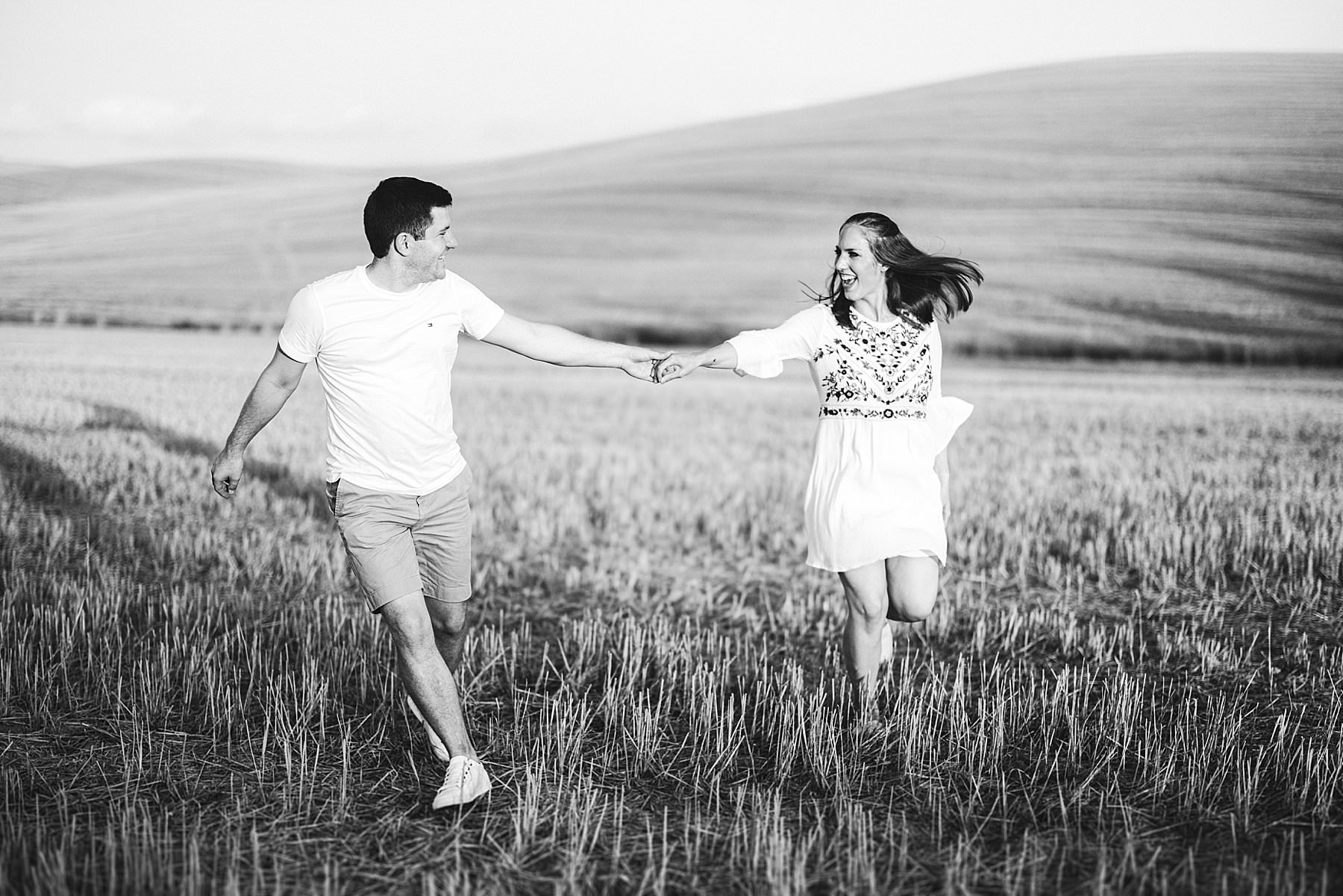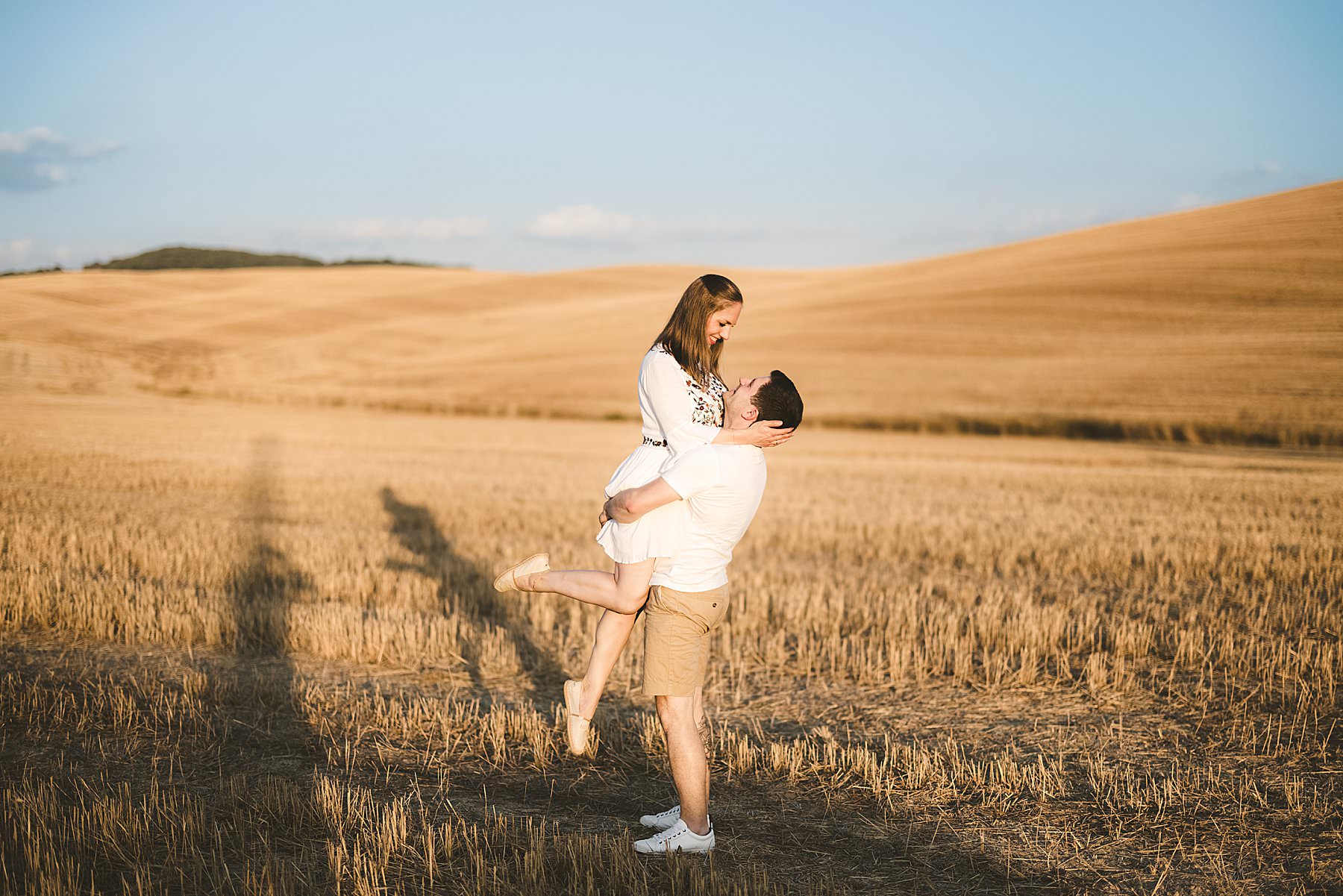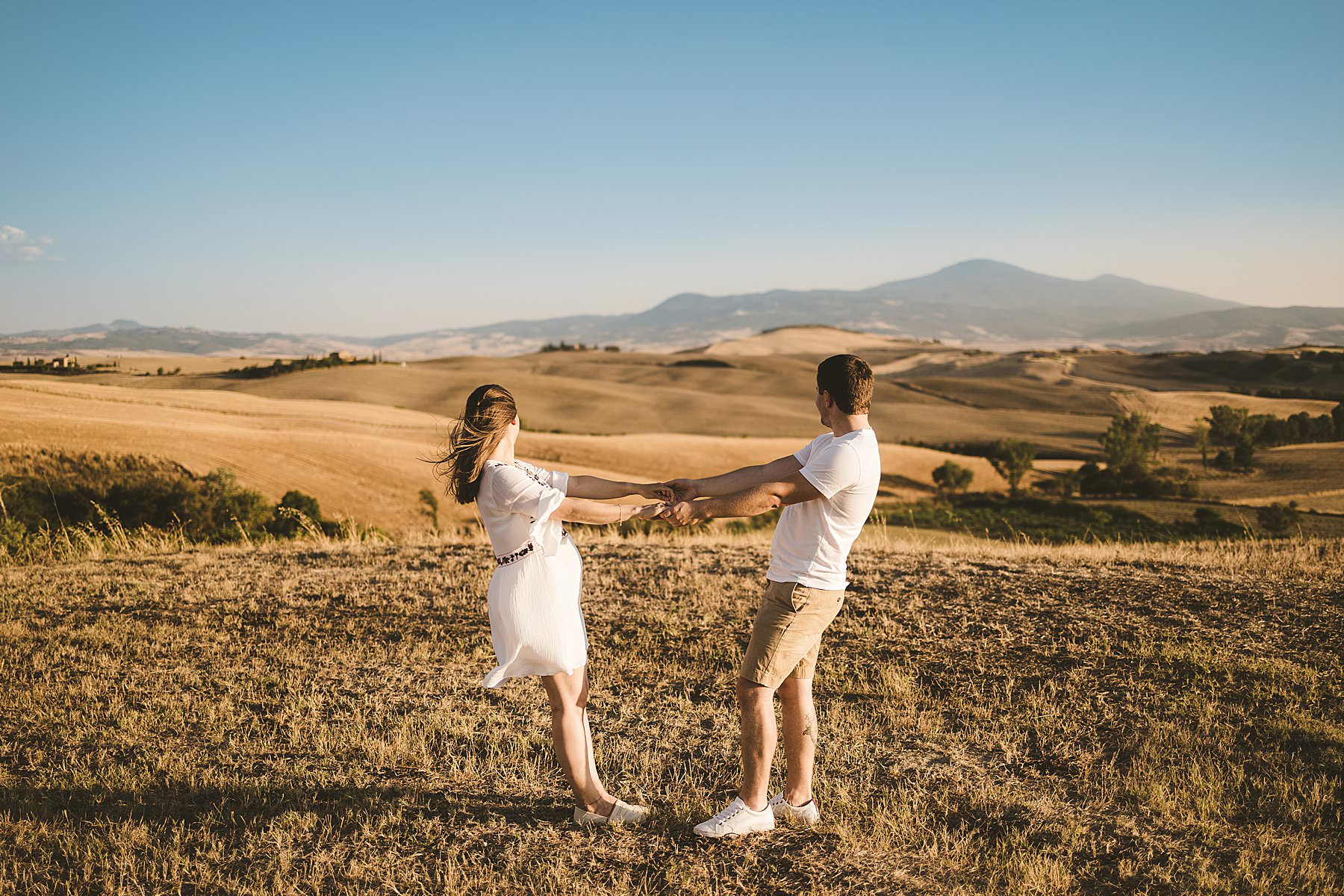 Exciting and funny couple photo shoot in Tuscany countryside near Pienza with iconic rolling hills background. Photo by the Italian creative, elegant and modern engagement photographer in Tuscany Gabriele Fani.