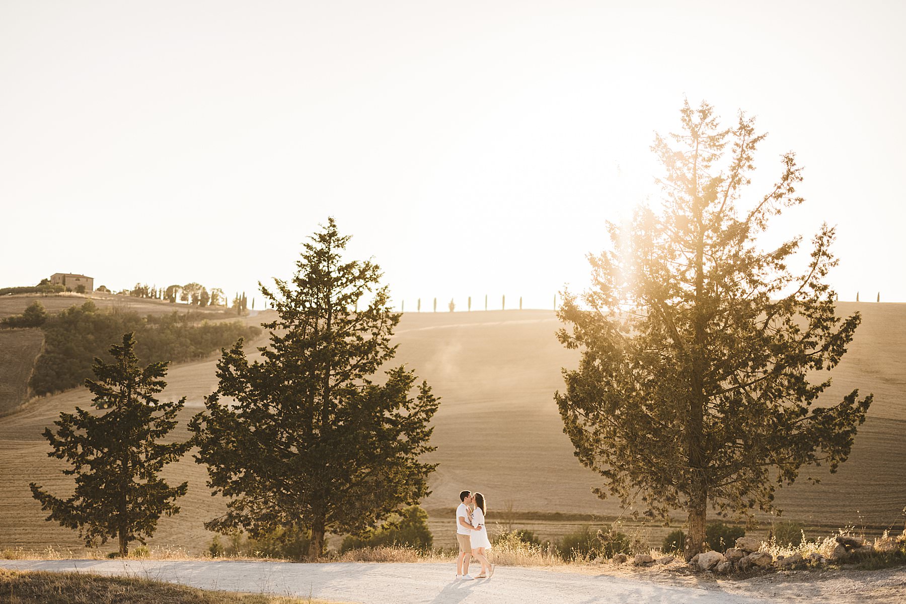 Honeymoon photo shoot in Tuscany countryside of Pienza with rolling hills scenery. Photo by the Italian creative, elegant and modern engagement photographer in Tuscany Gabriele Fani.