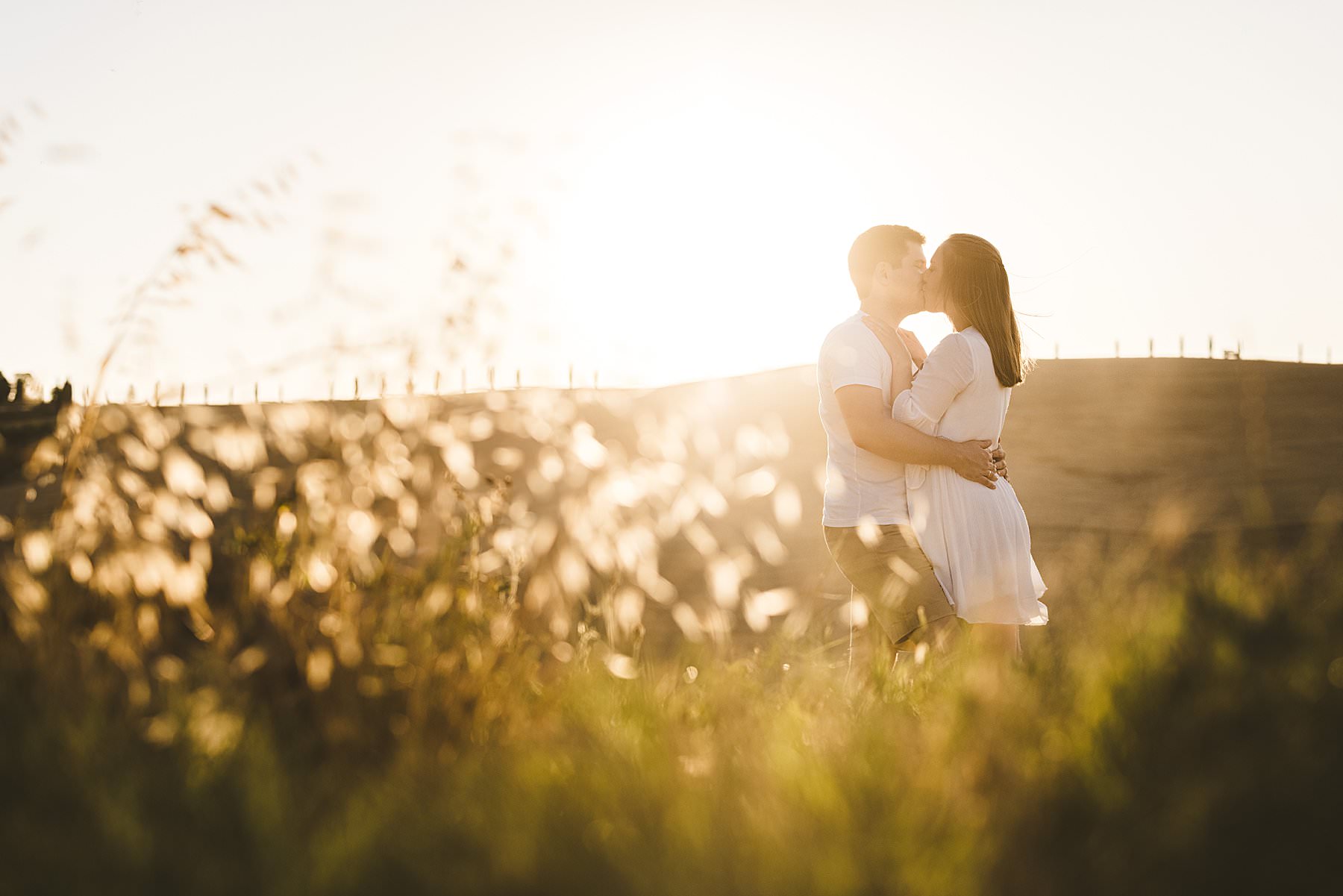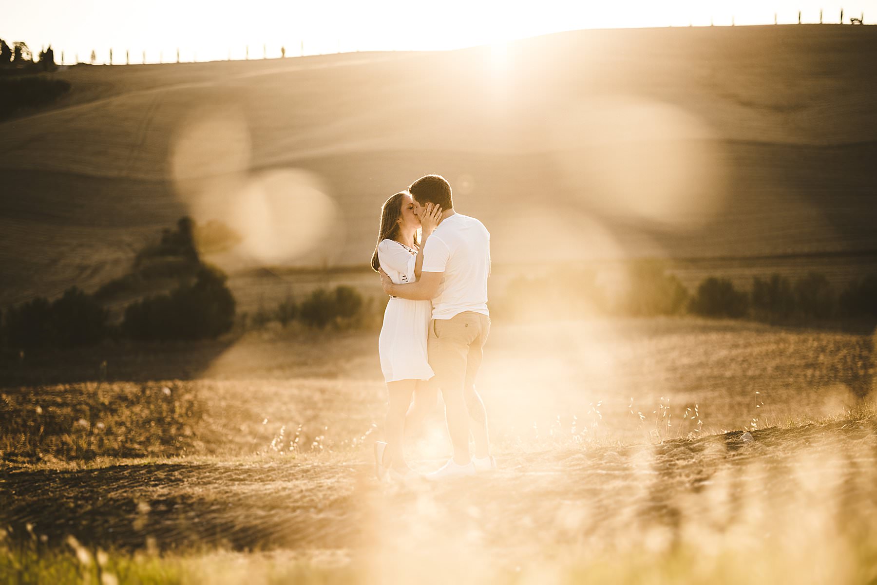 Romantic couple photos in the evocative countryside of Pienza the magic of Val d’Orcia in Tuscany. Photo by the Italian creative, elegant and modern engagement photographer in Tuscany Gabriele Fani.