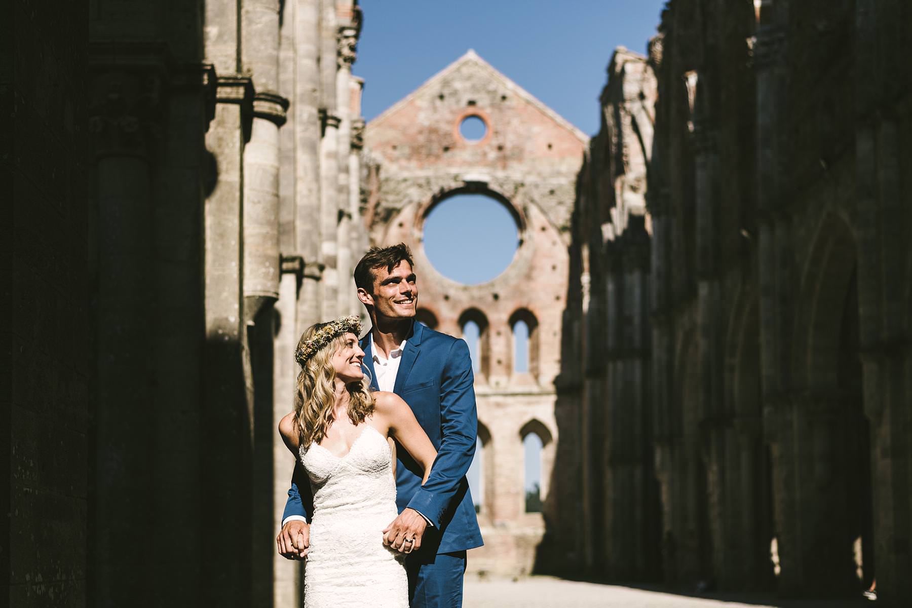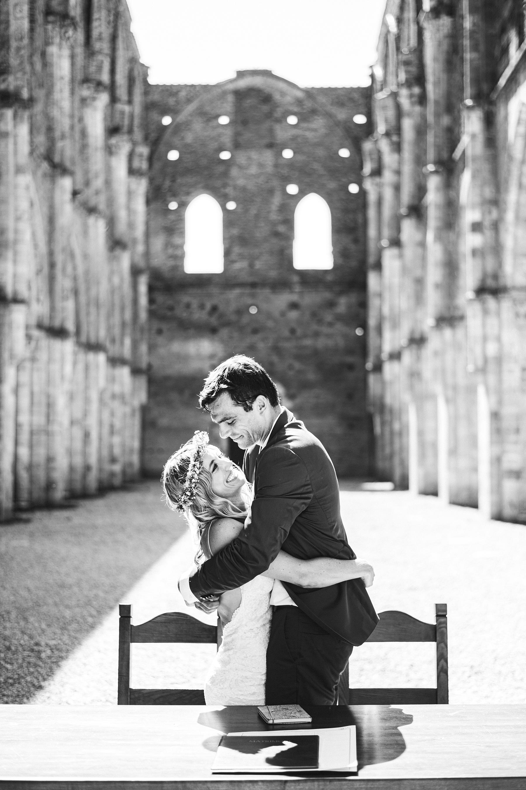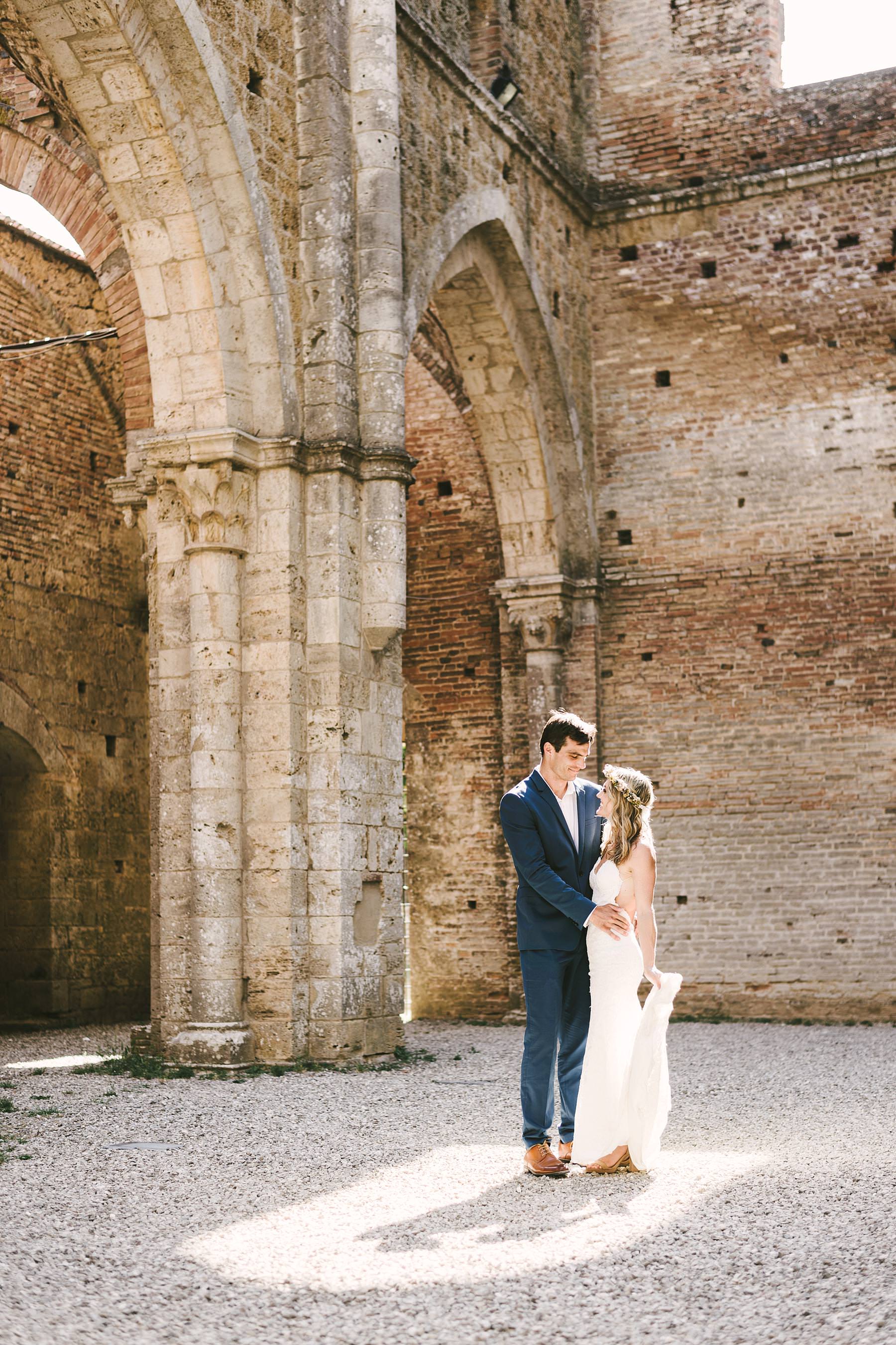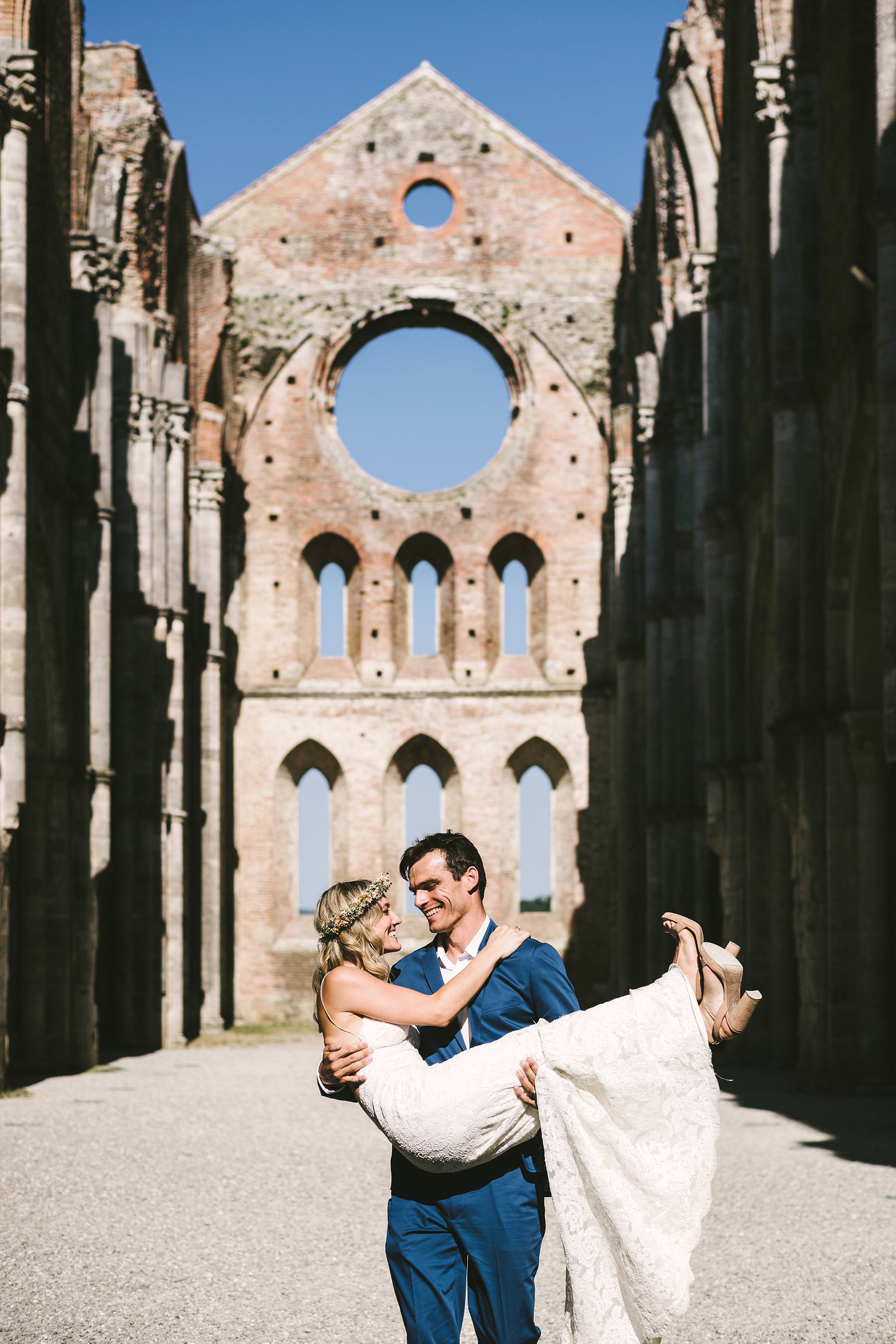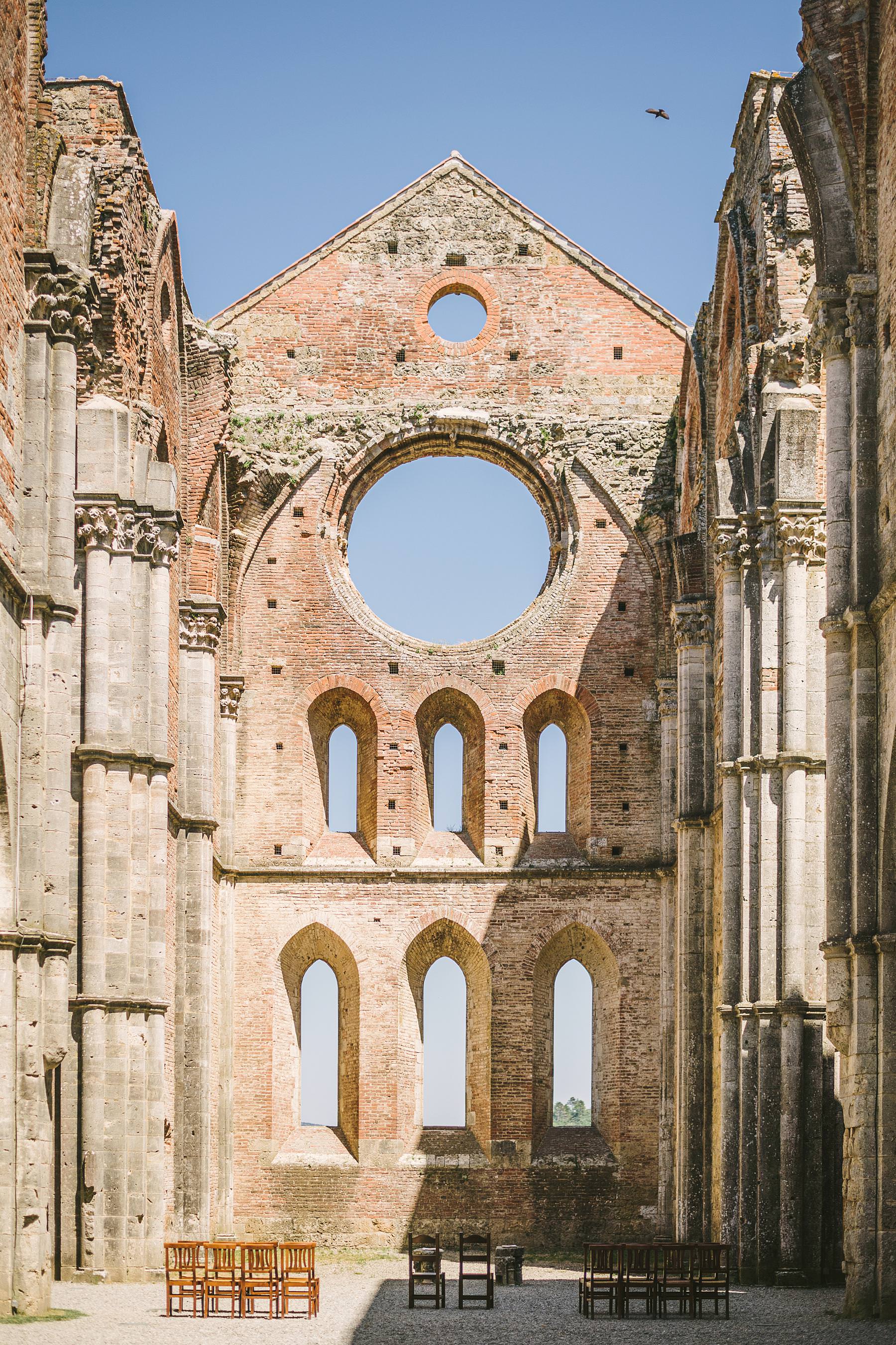 Well, that and the location where they would promise to love one another for eternity. They chose San Galgano, a roofless abbey tucked among the rolling hills of Siena that would leave anyone breathless.
