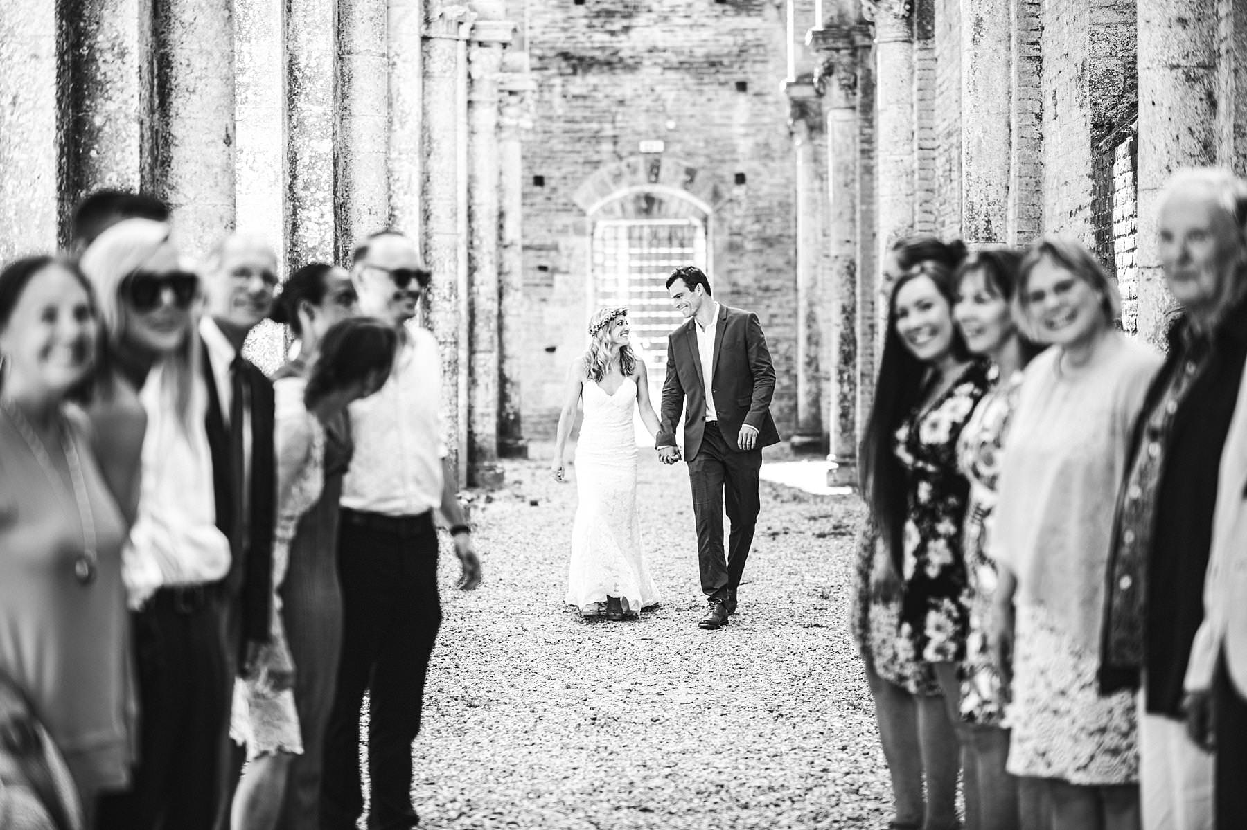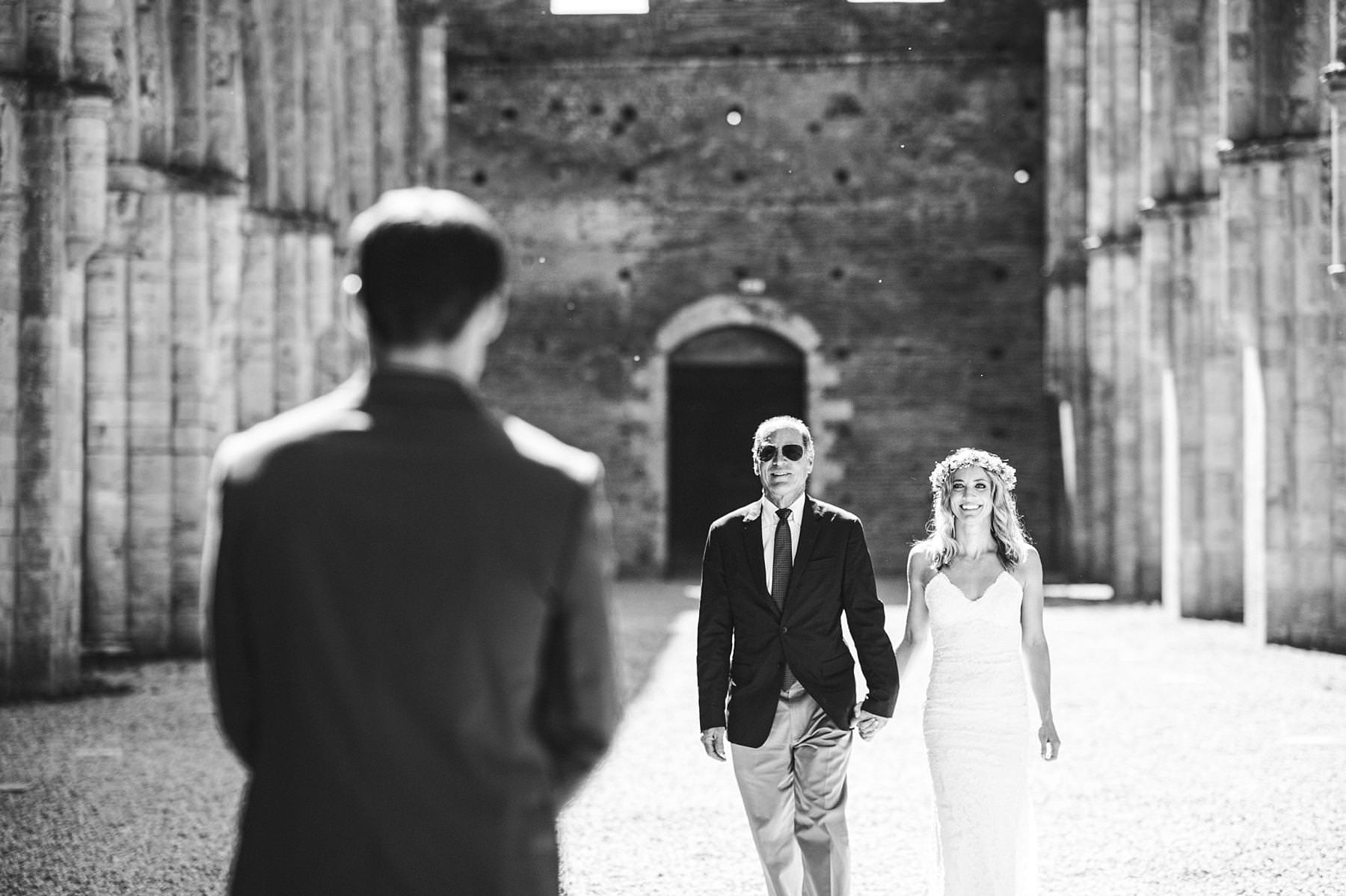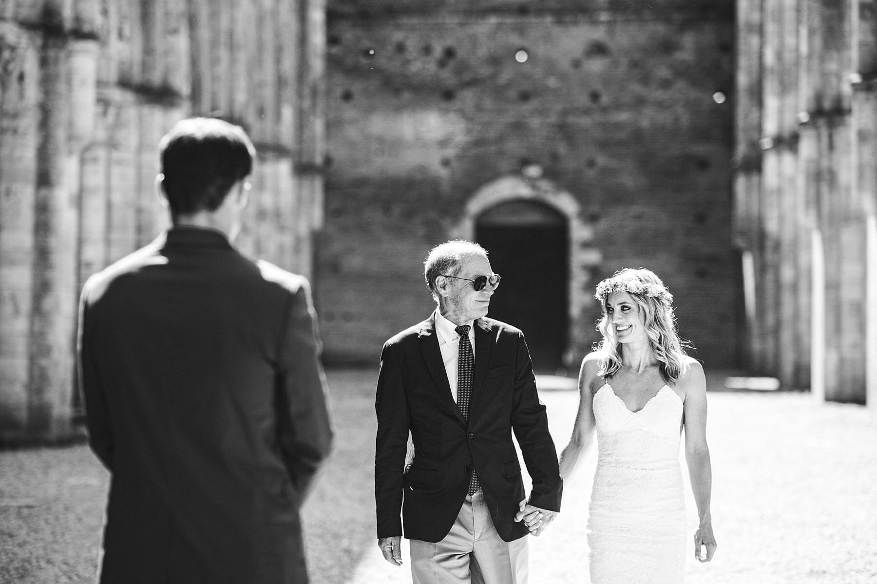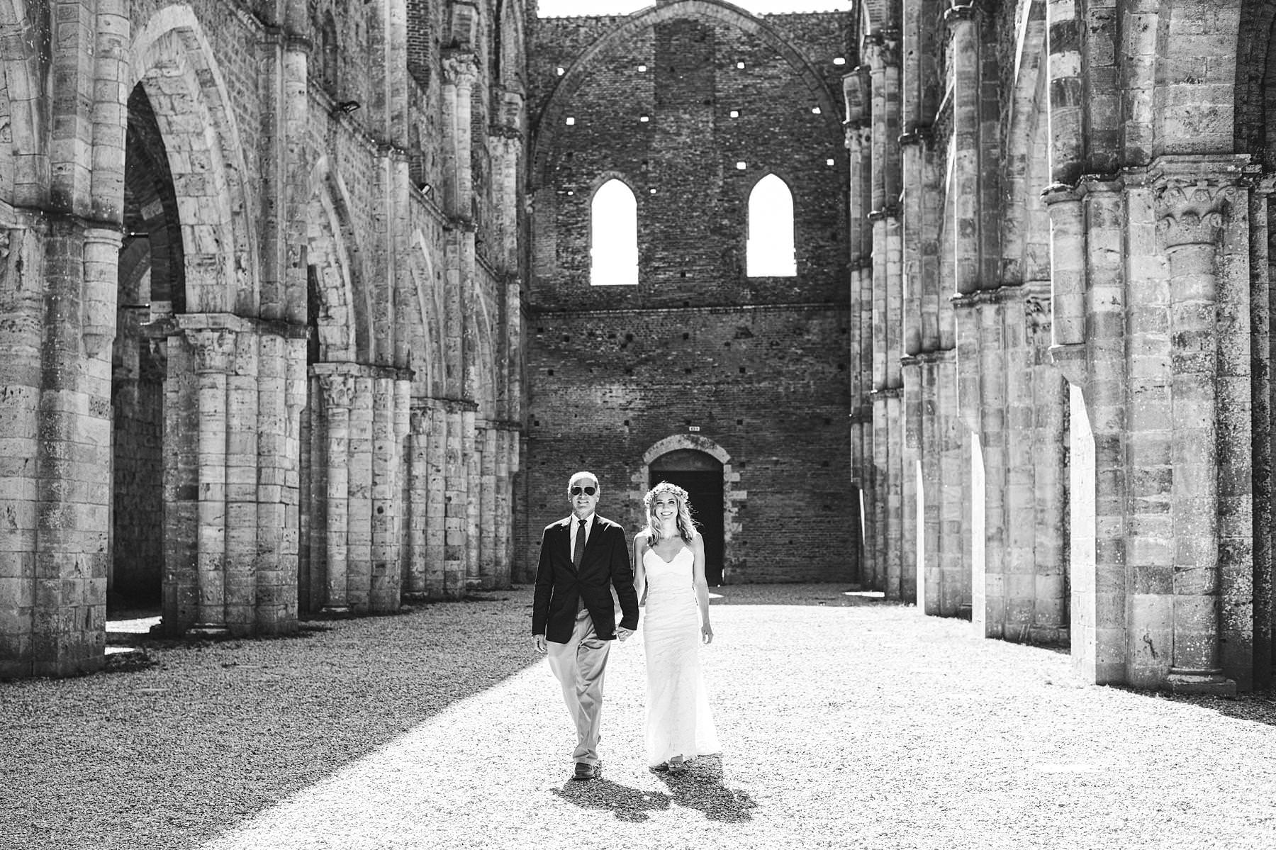 Bride Amelia walks down the aisle of the roofless abbey of San Galgano intimate wedding in Tuscany. Photo by the Italian elegant and modern wedding photographer in Tuscany based Florence Gabriele Fani