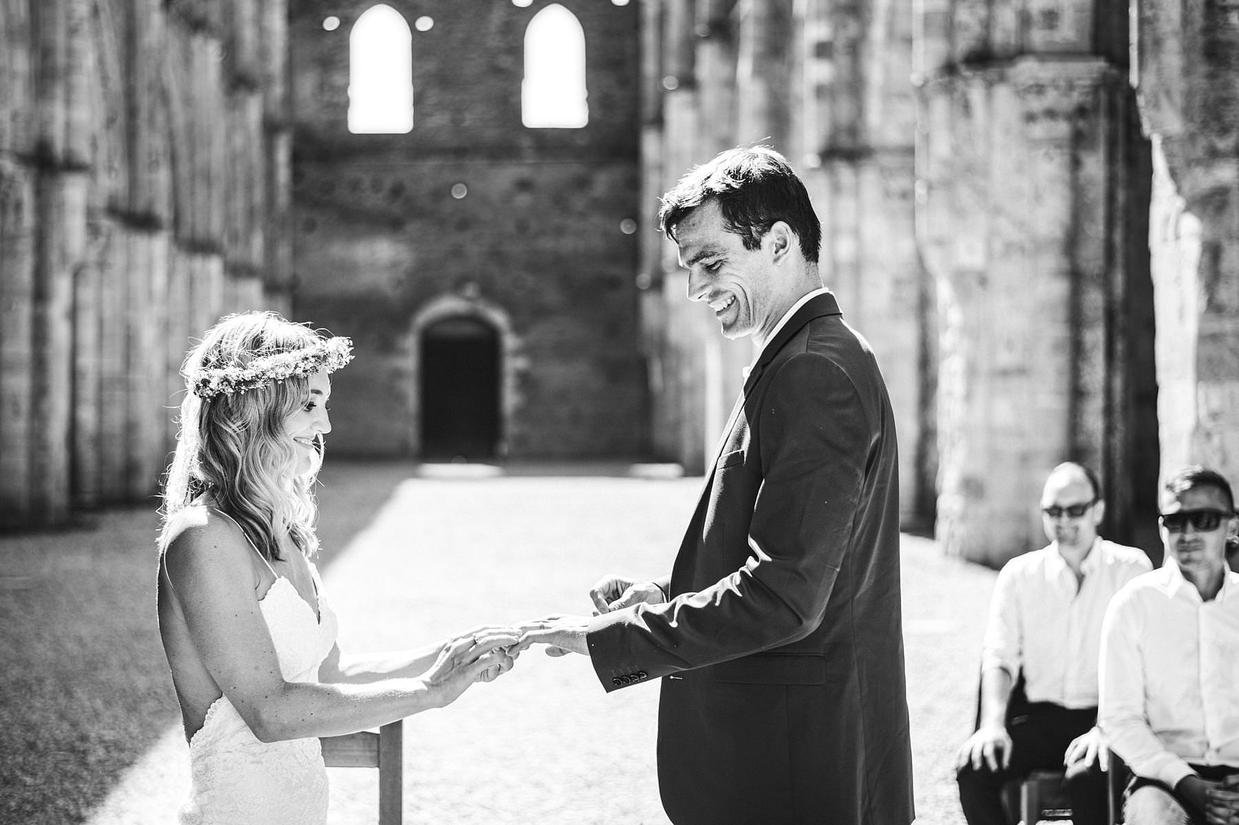 Roofless abbey of San Galgano, an unforgettable frame for your intimate civil destination marriage in Tuscany. Photo by the Italian elegant and modern wedding photographer in Tuscany based Florence Gabriele Fani