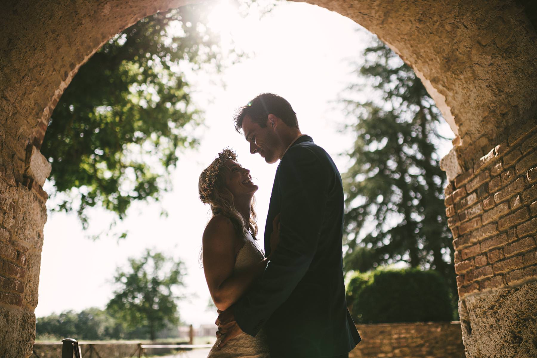 Intimate destination wedding portrait in the warm, golden light of sunset at Villa La Torre country house located in the Montechiaro countryside area. Photo by the Italian elegant and modern wedding photographer in Tuscany based Florence Gabriele Fani