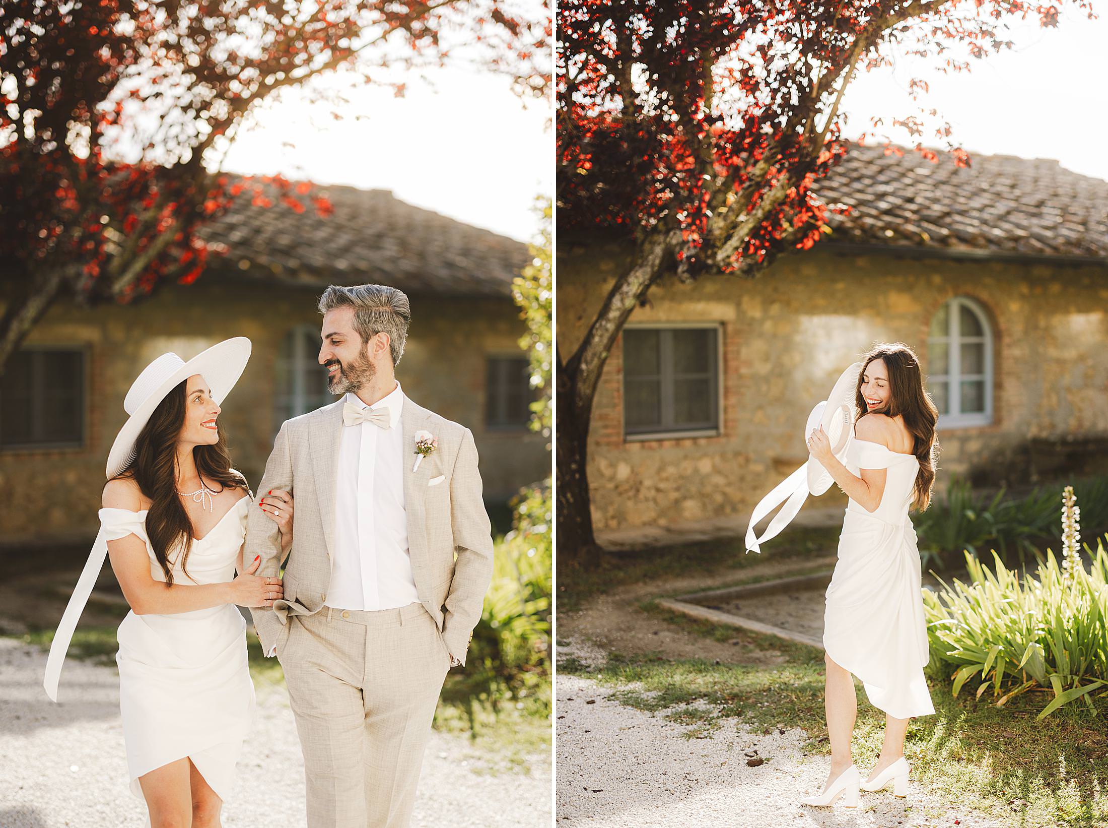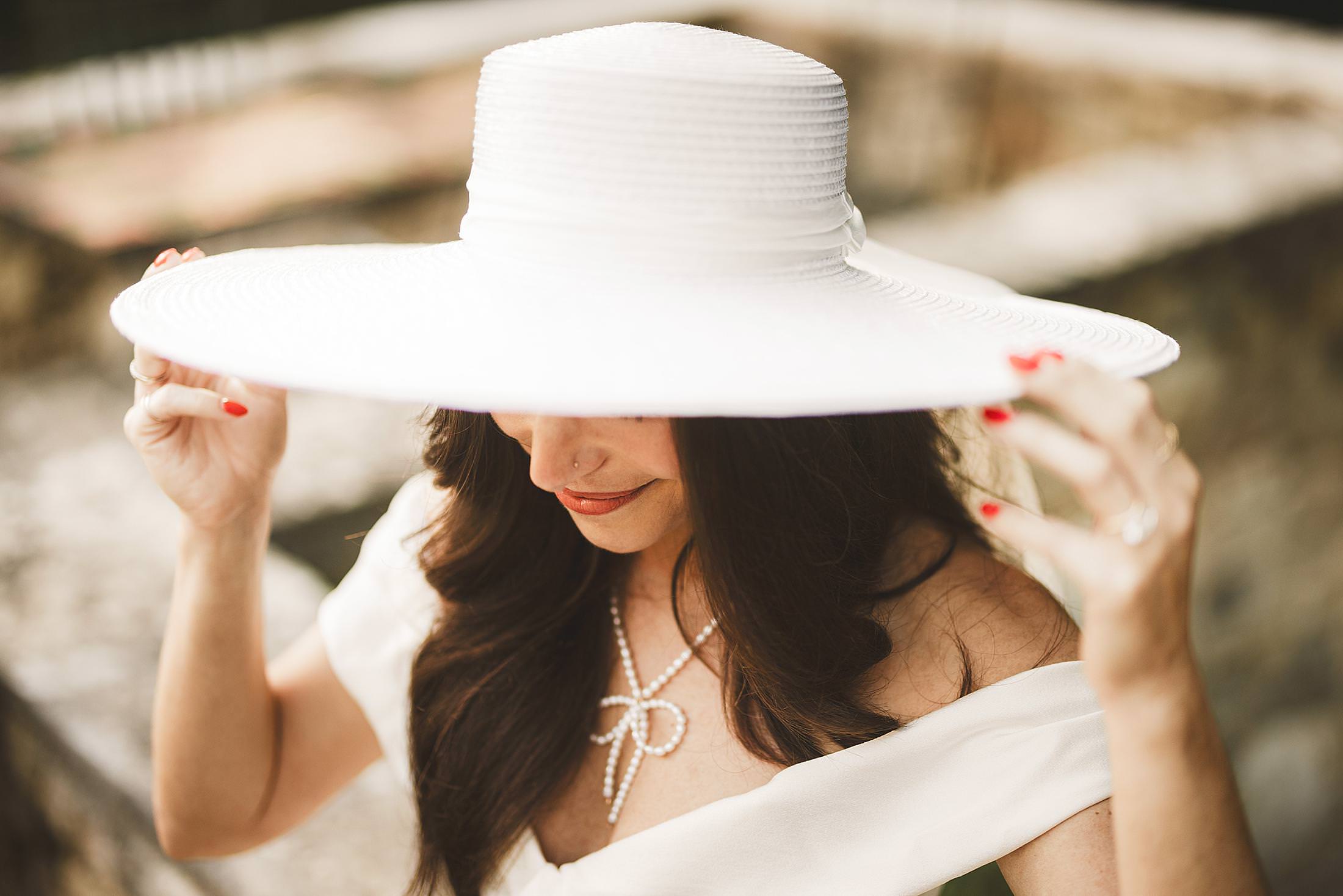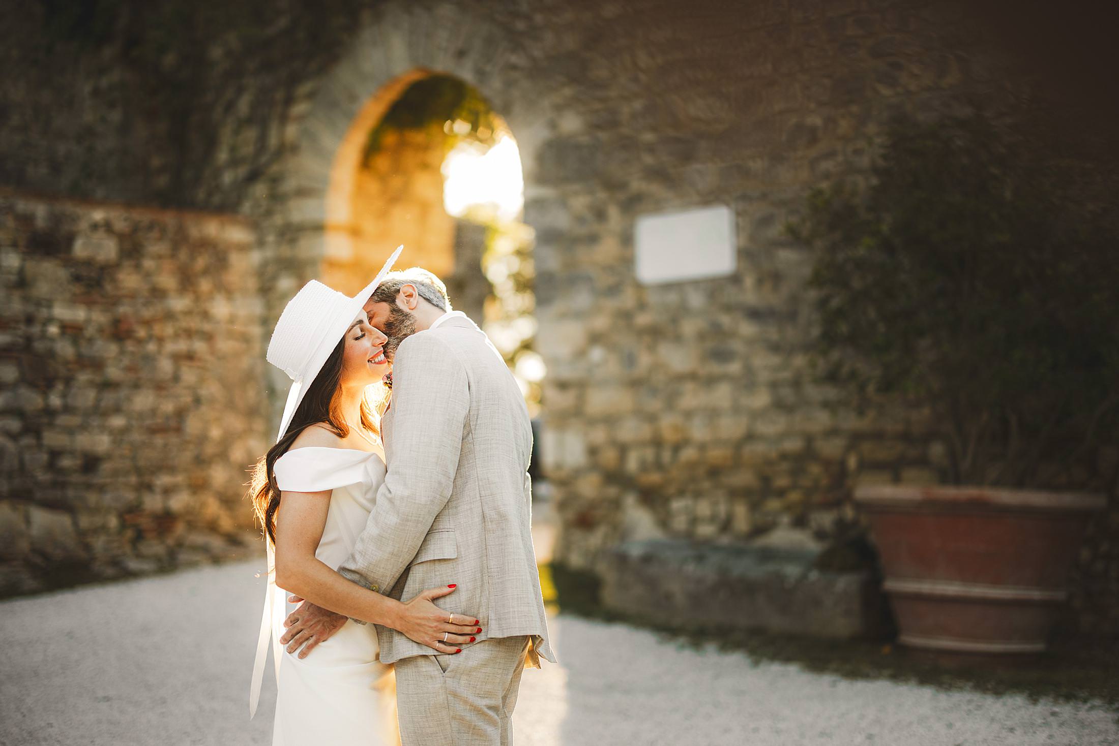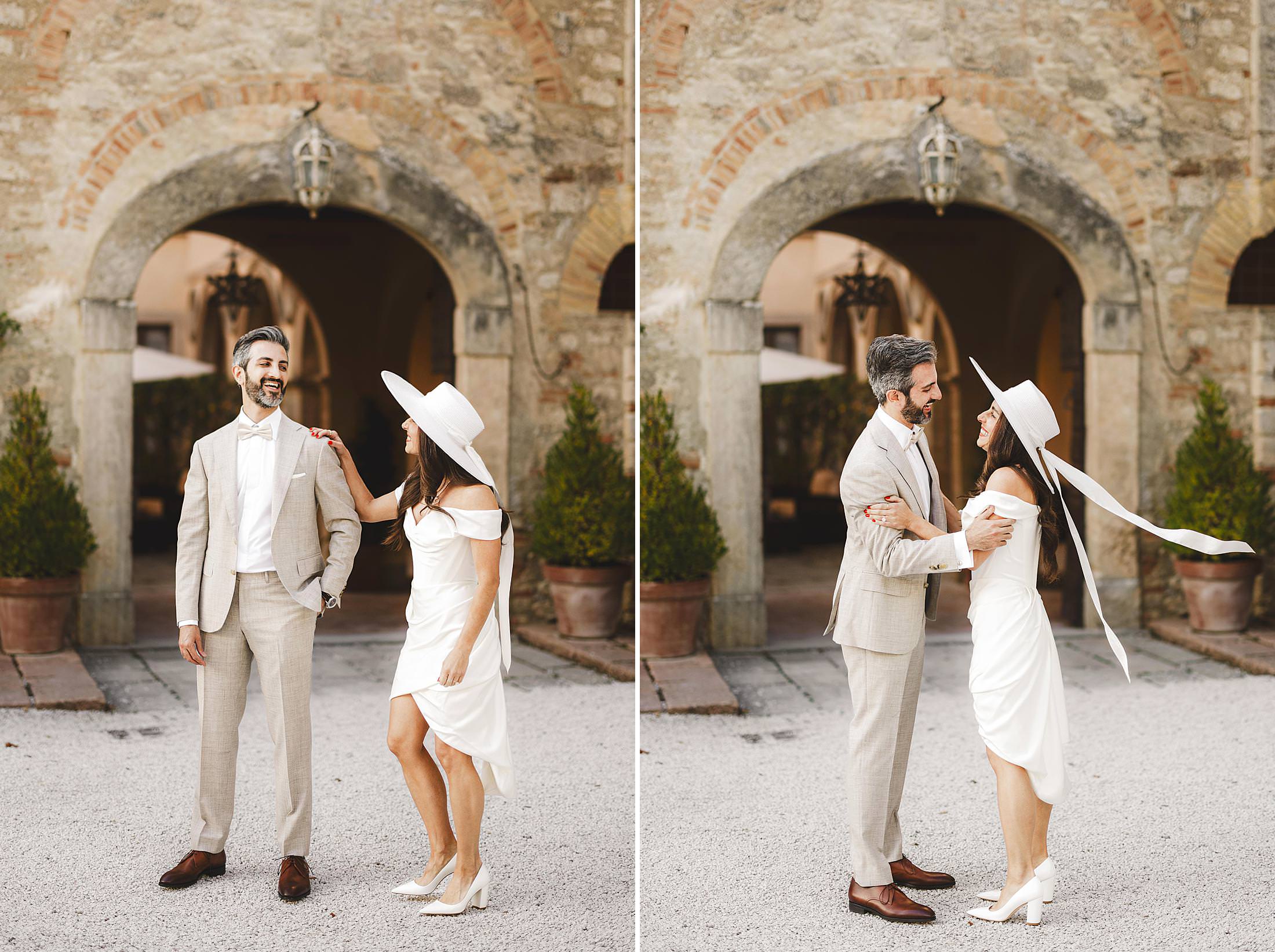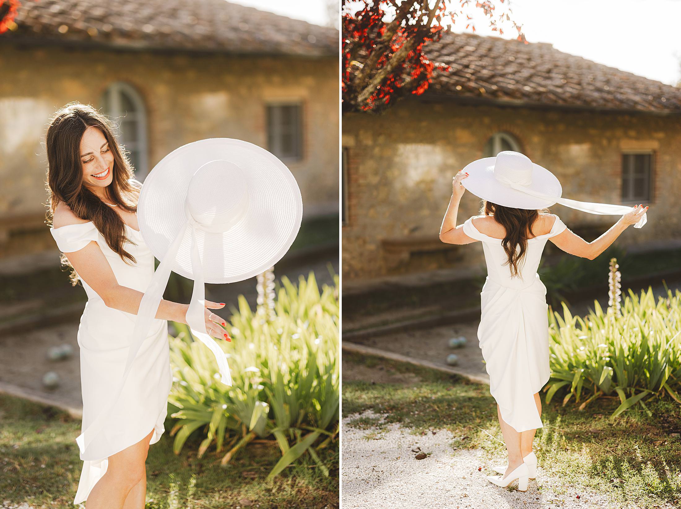 Stylish and elegant elopement portrait with hat at iconic Borgo Pignano in the heart of Chianti countryside. Photo by the Italian elegant and creative elopement photographer in Tuscany Gabriele Fani