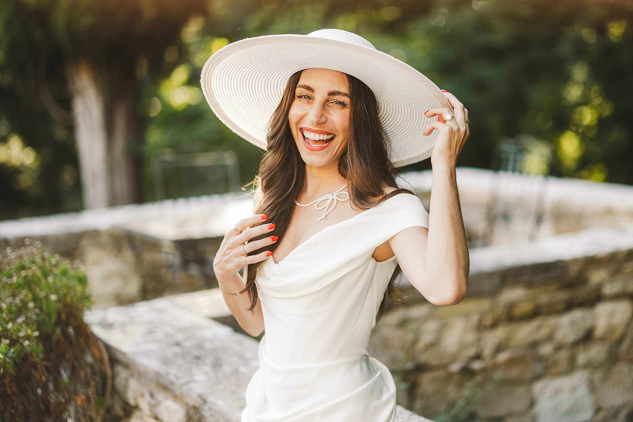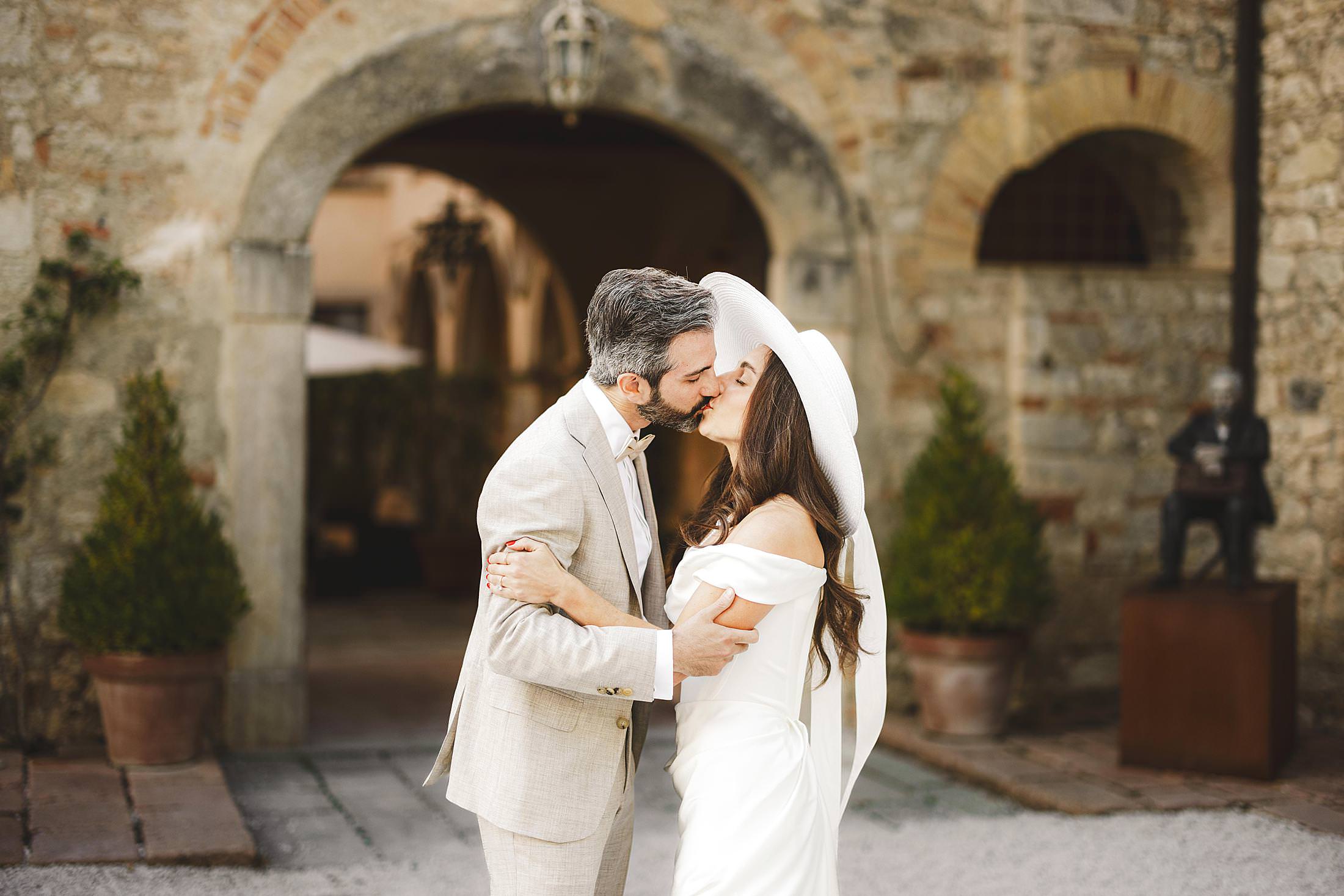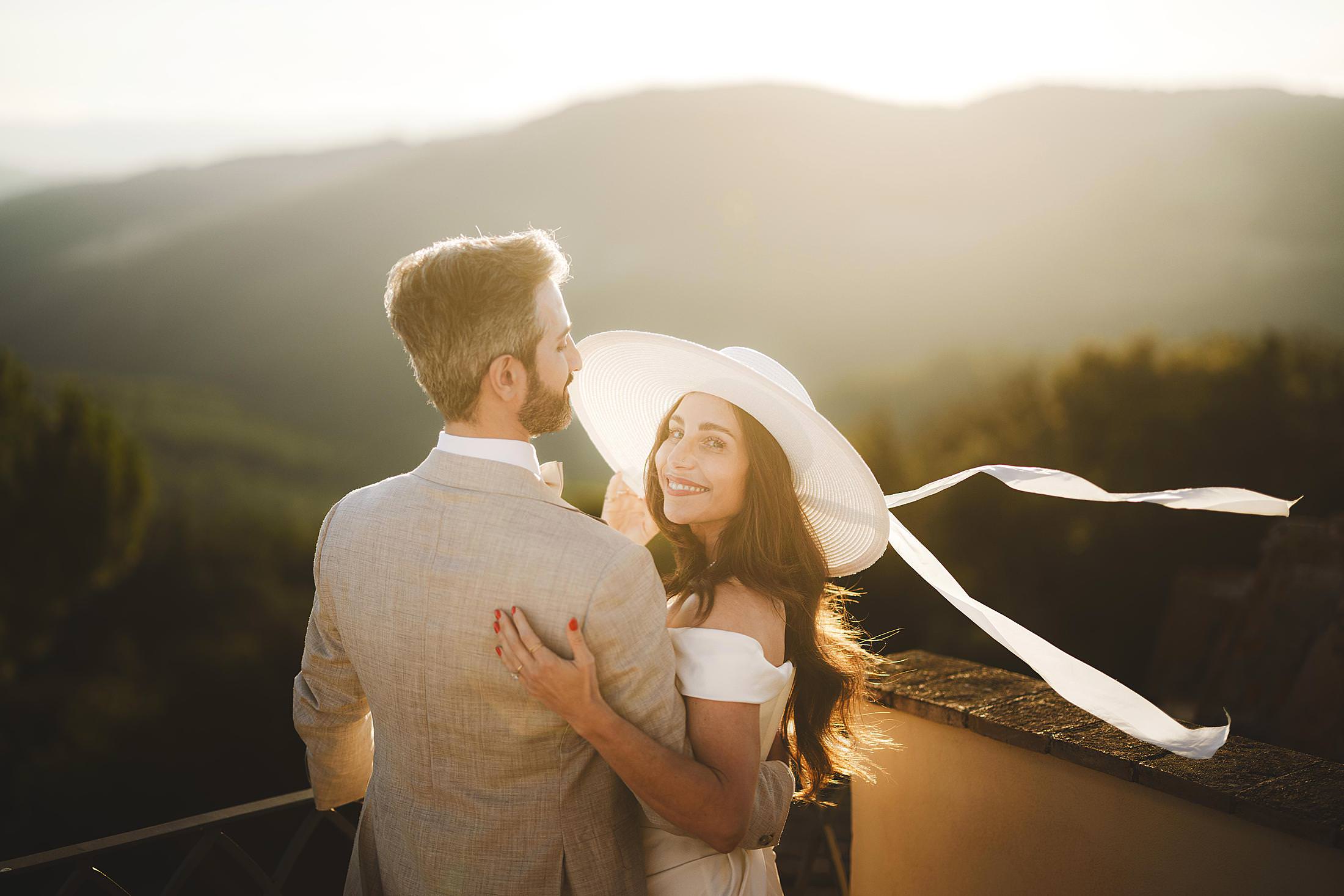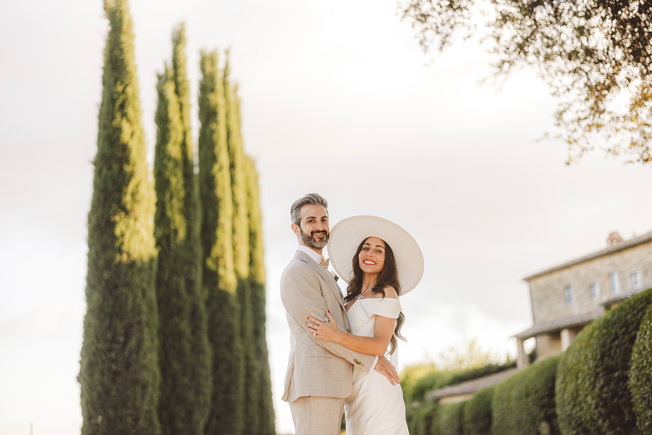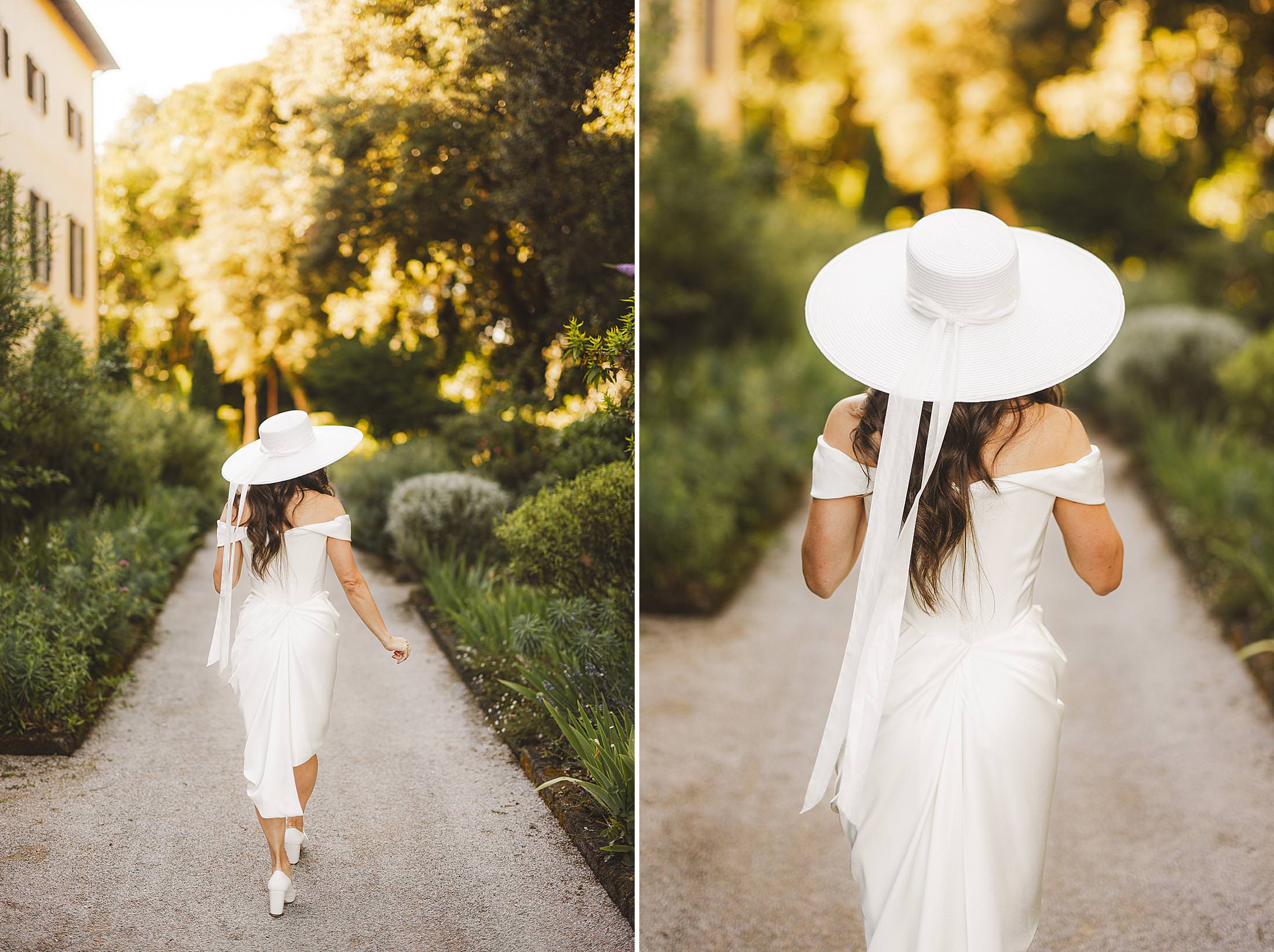 Stylish and elegant elopement portrait with hat at iconic Borgo Pignano in the heart of Chianti countryside. Photo by the Italian elegant and creative elopement photographer in Tuscany Gabriele Fani