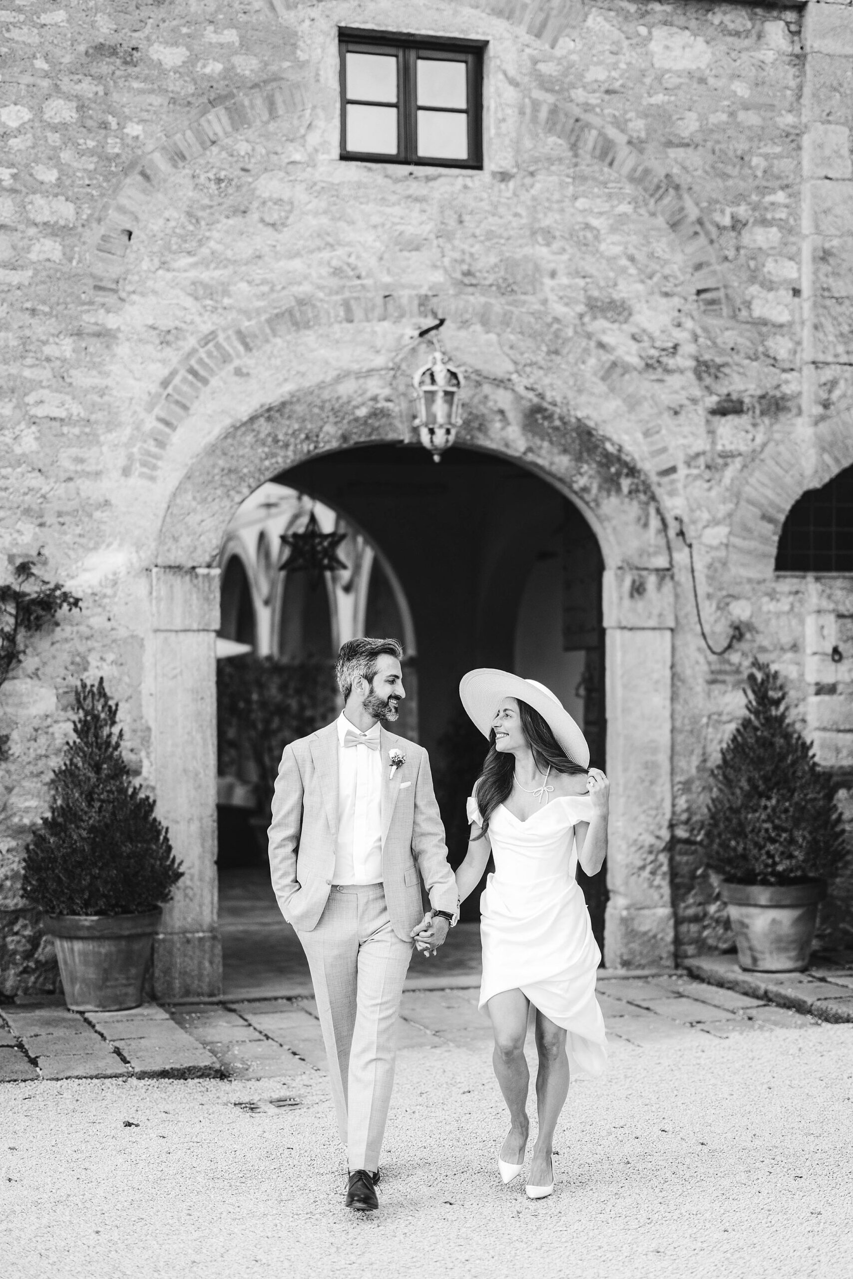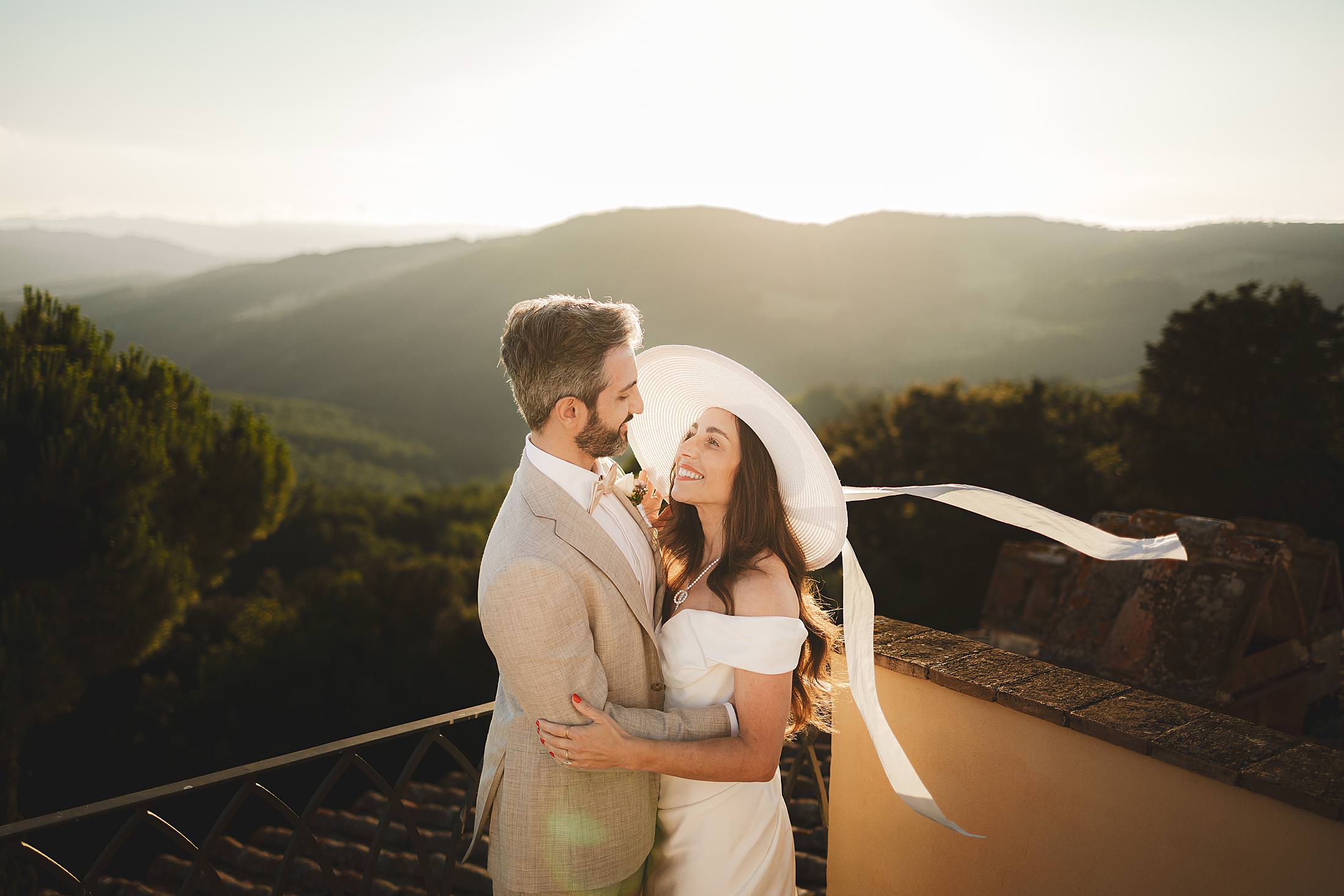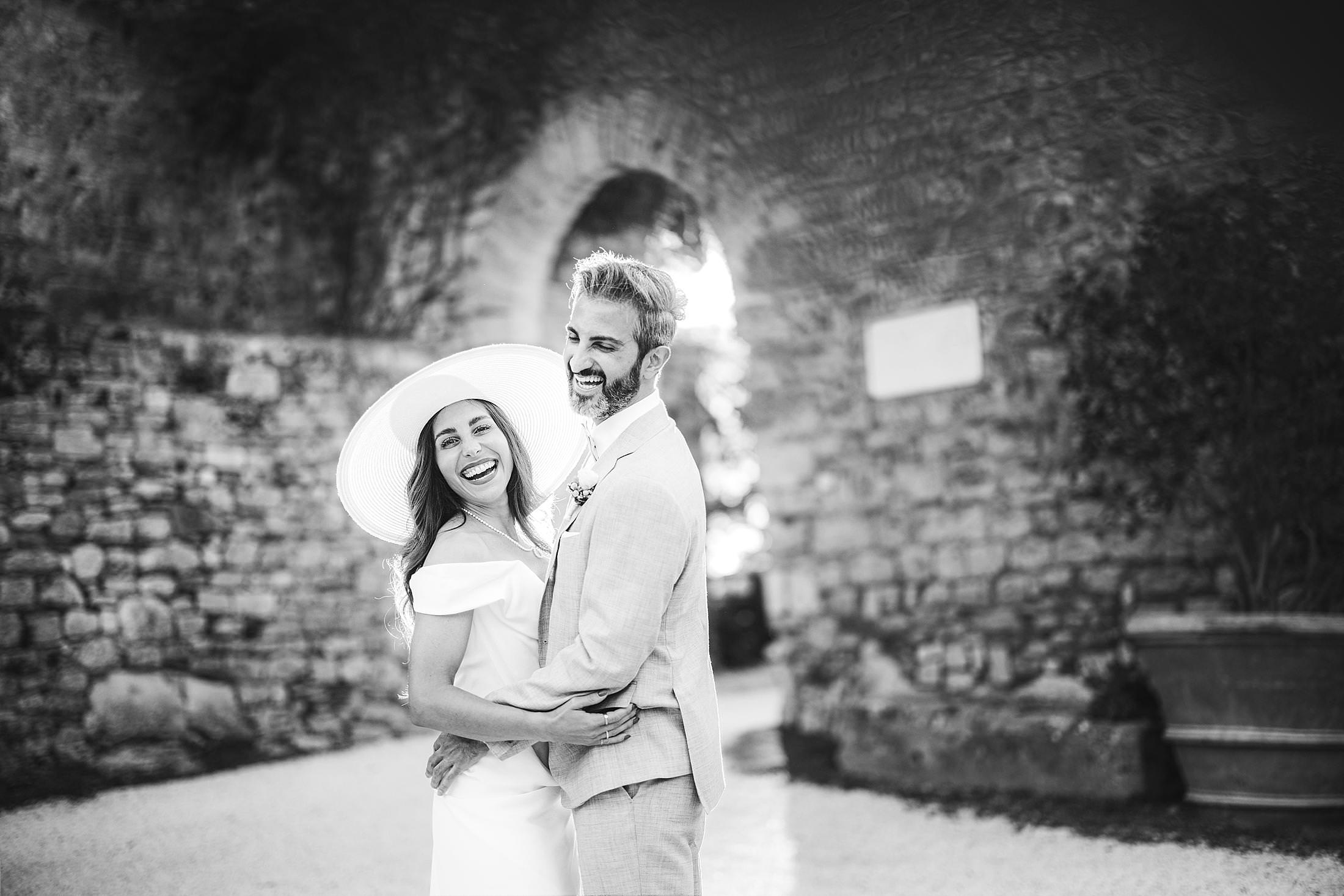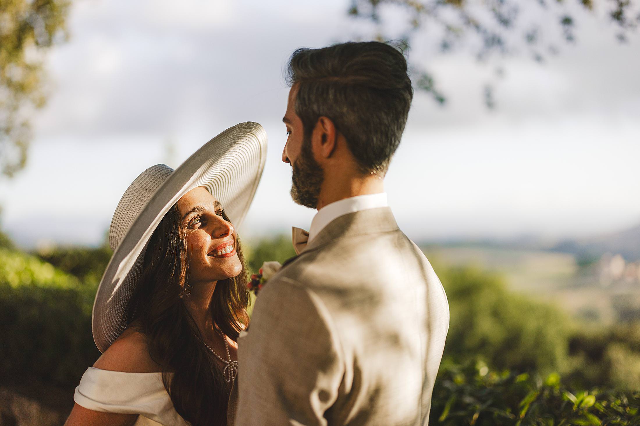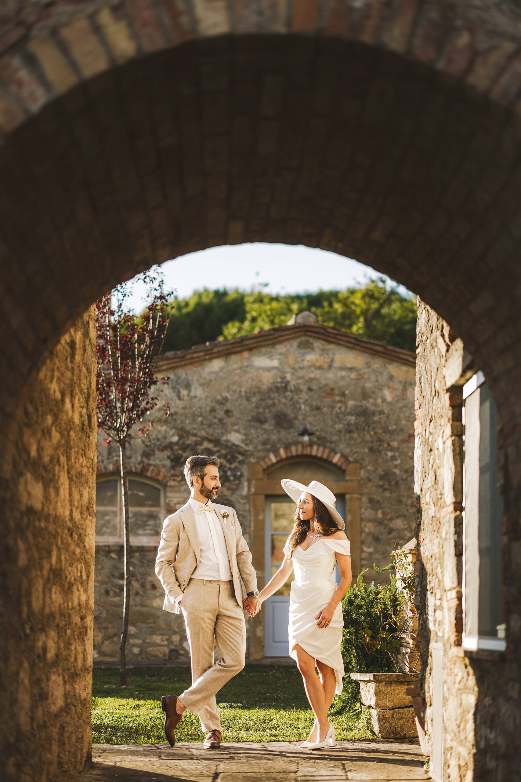 Stylish and elegant elopement portrait with hat at iconic Borgo Pignano in the heart of Chianti countryside. Photo by the Italian elegant and creative elopement photographer in Tuscany Gabriele Fani