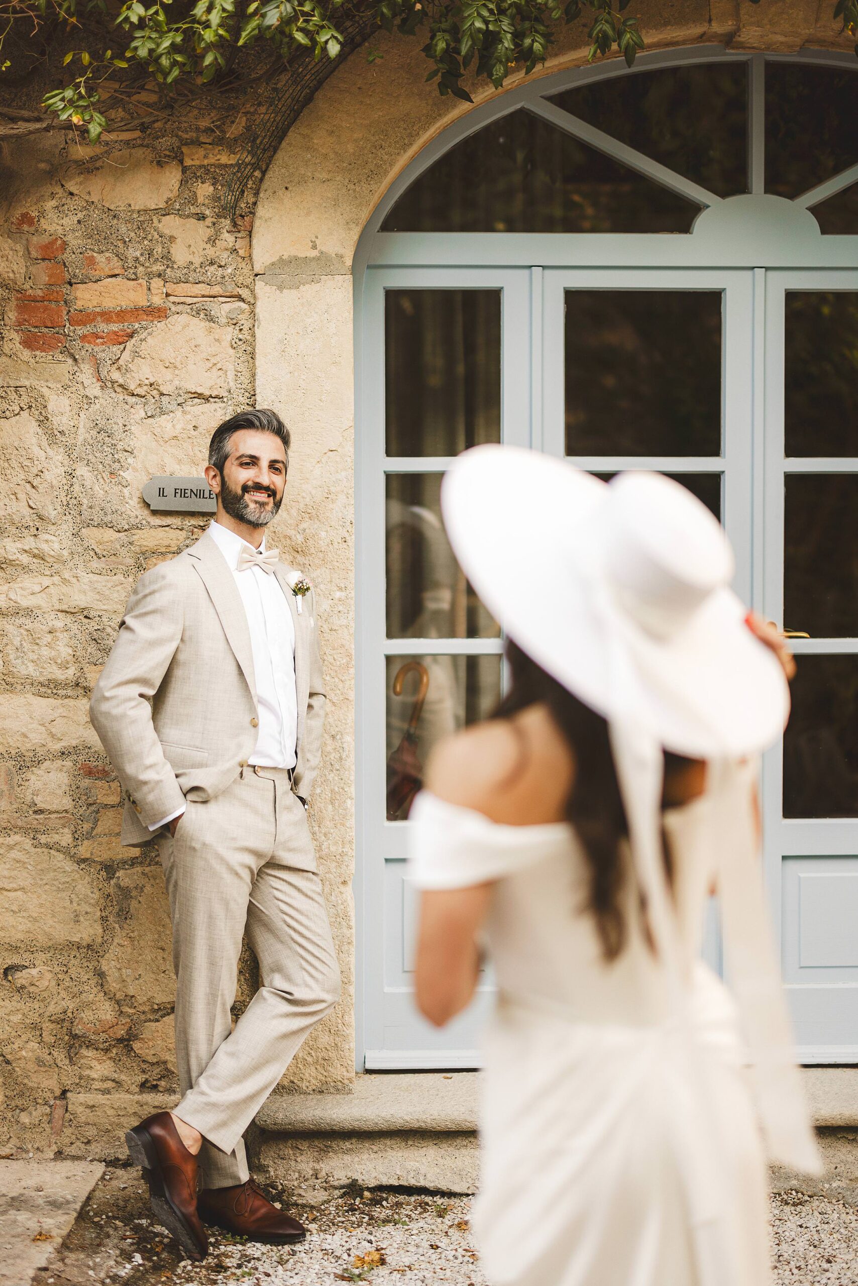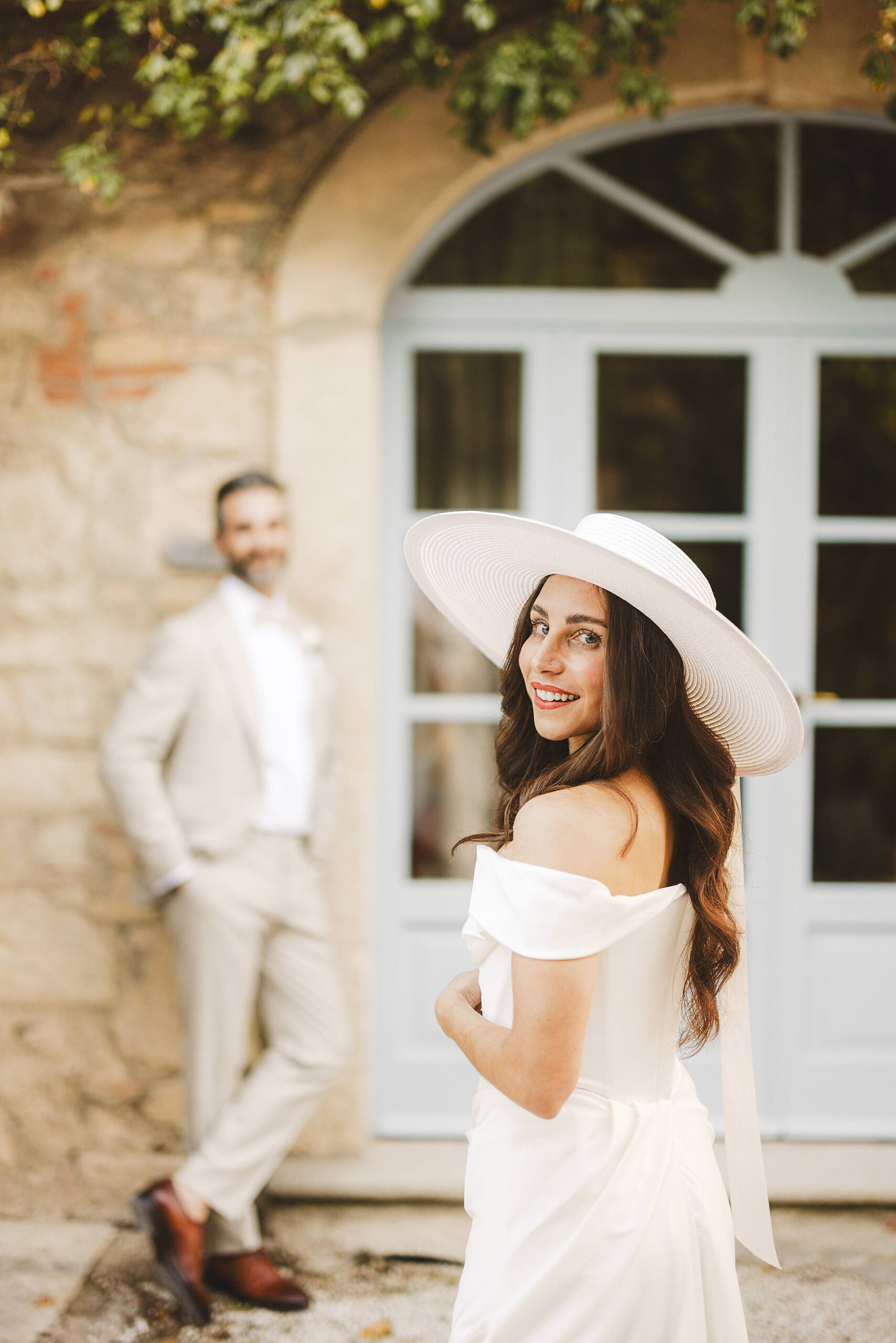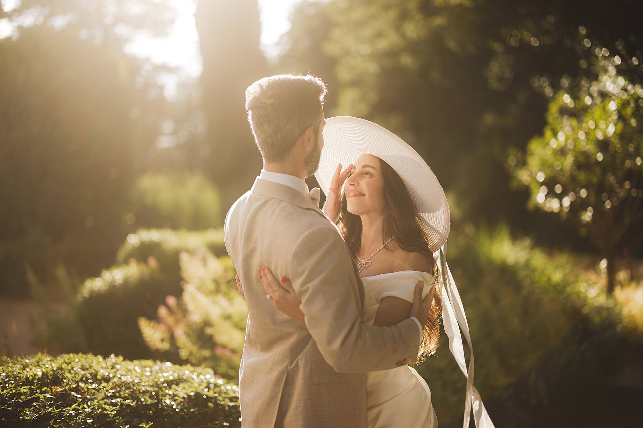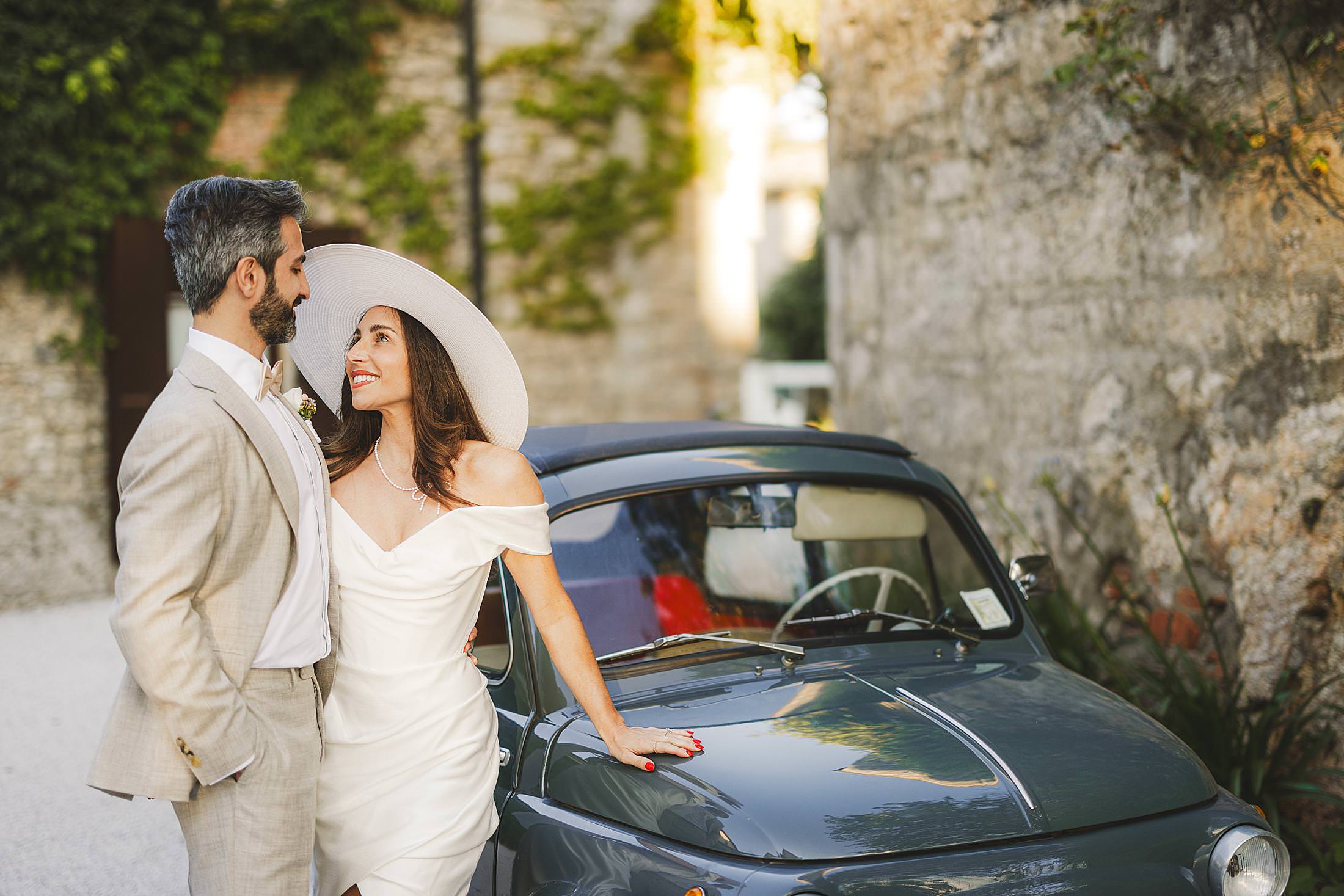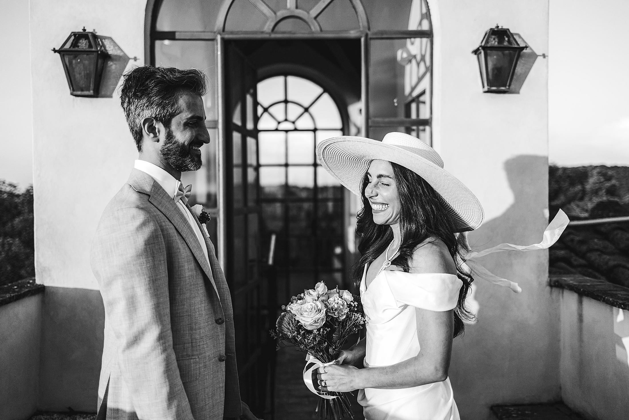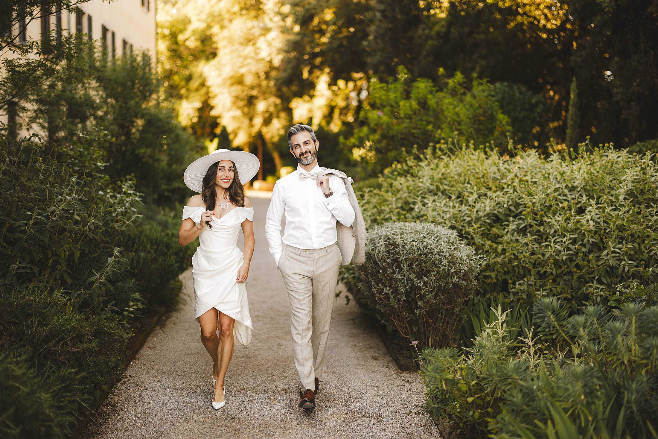 Stylish and elegant elopement portrait with hat at iconic Borgo Pignano in the heart of Chianti countryside. Photo by the Italian elegant and creative elopement photographer in Tuscany Gabriele Fani