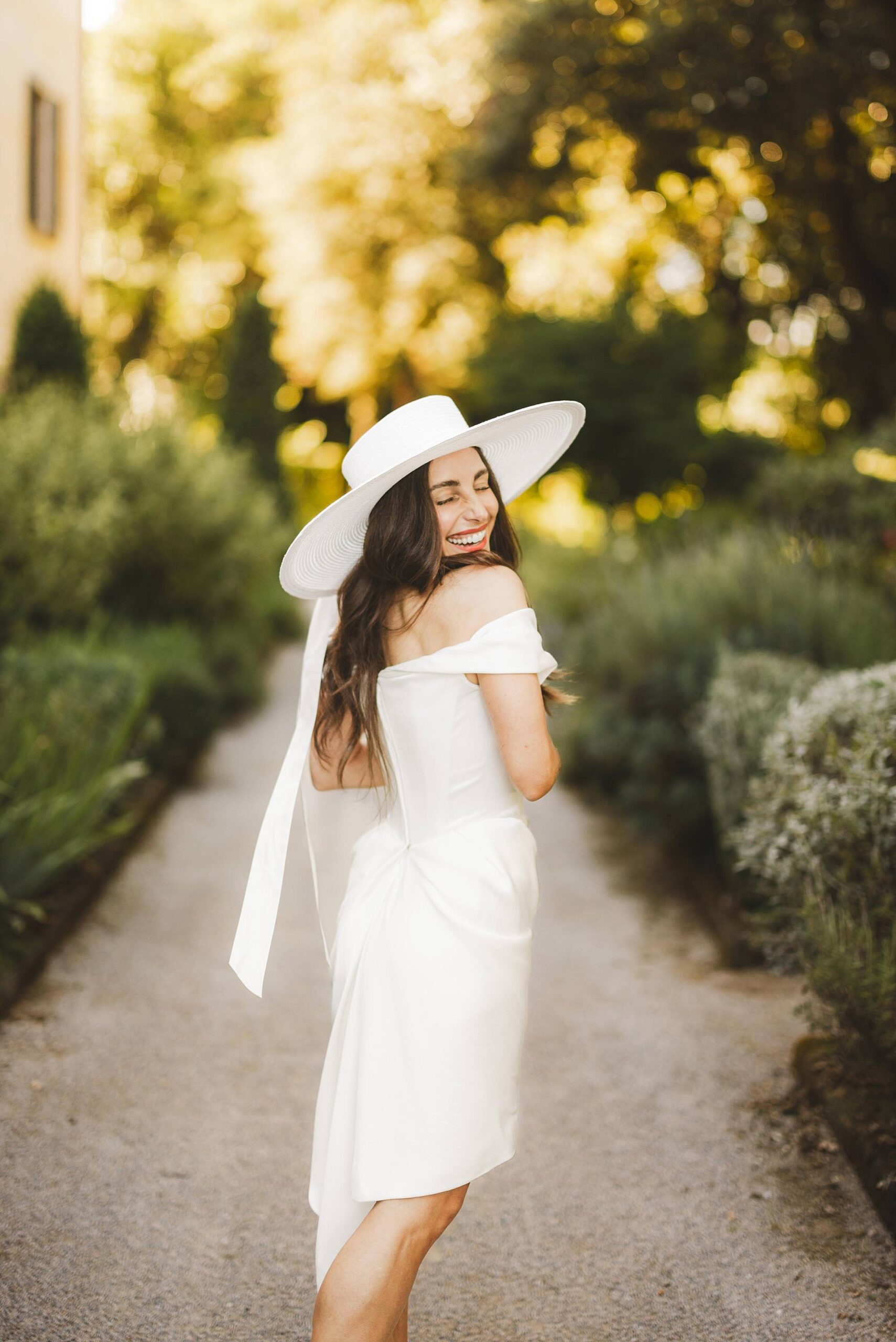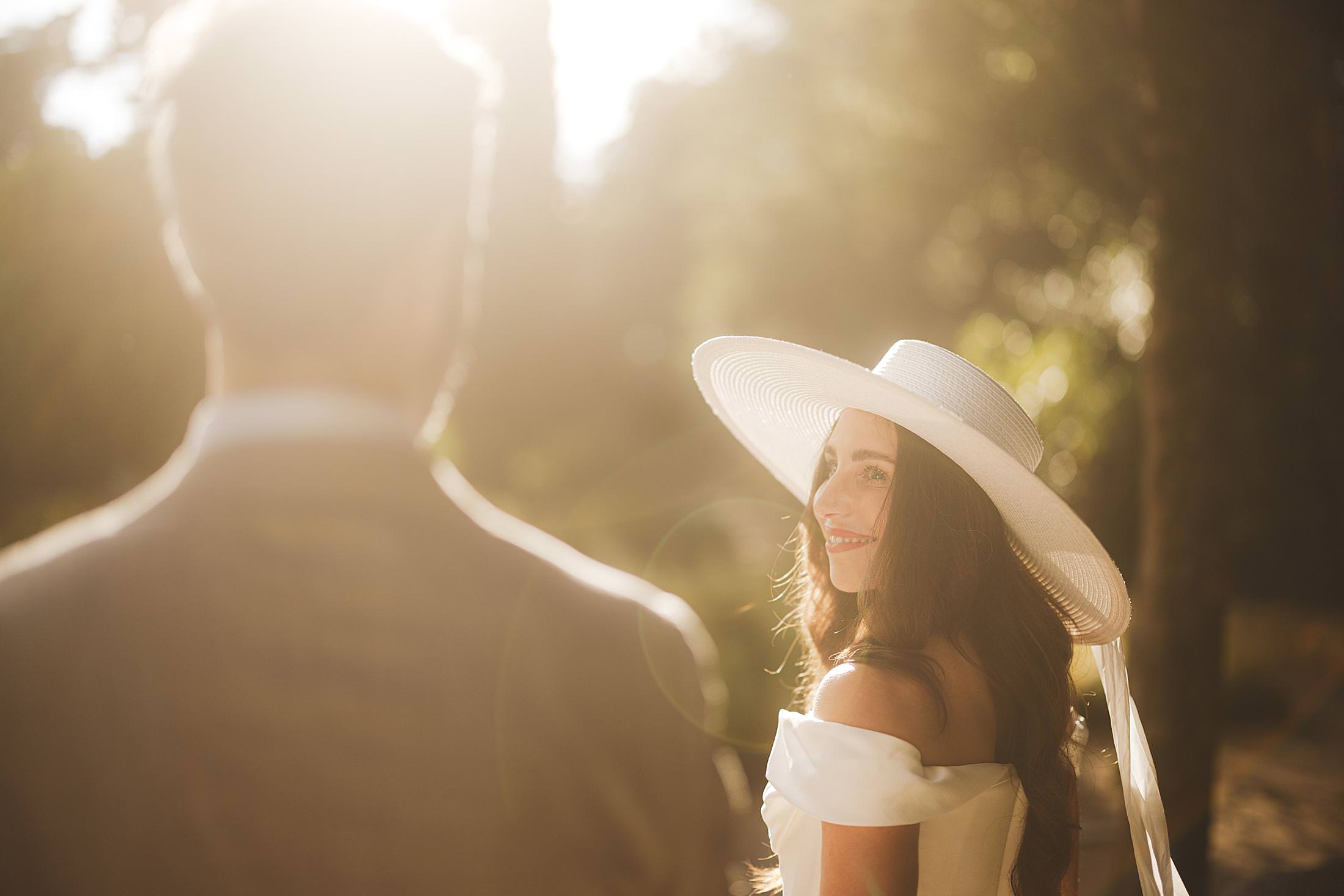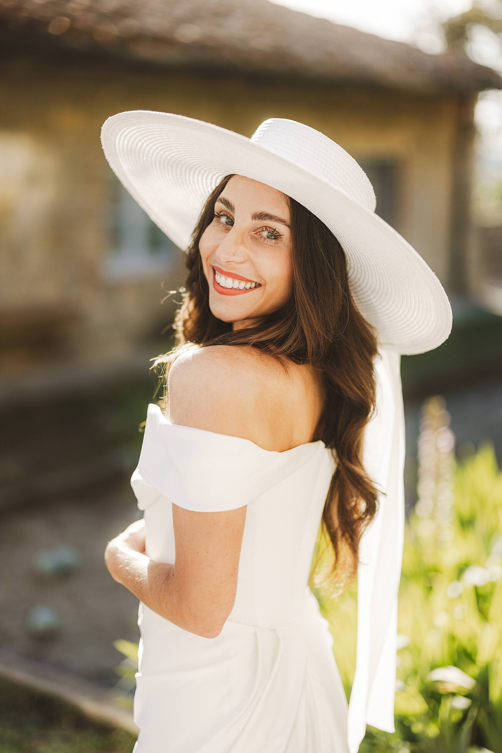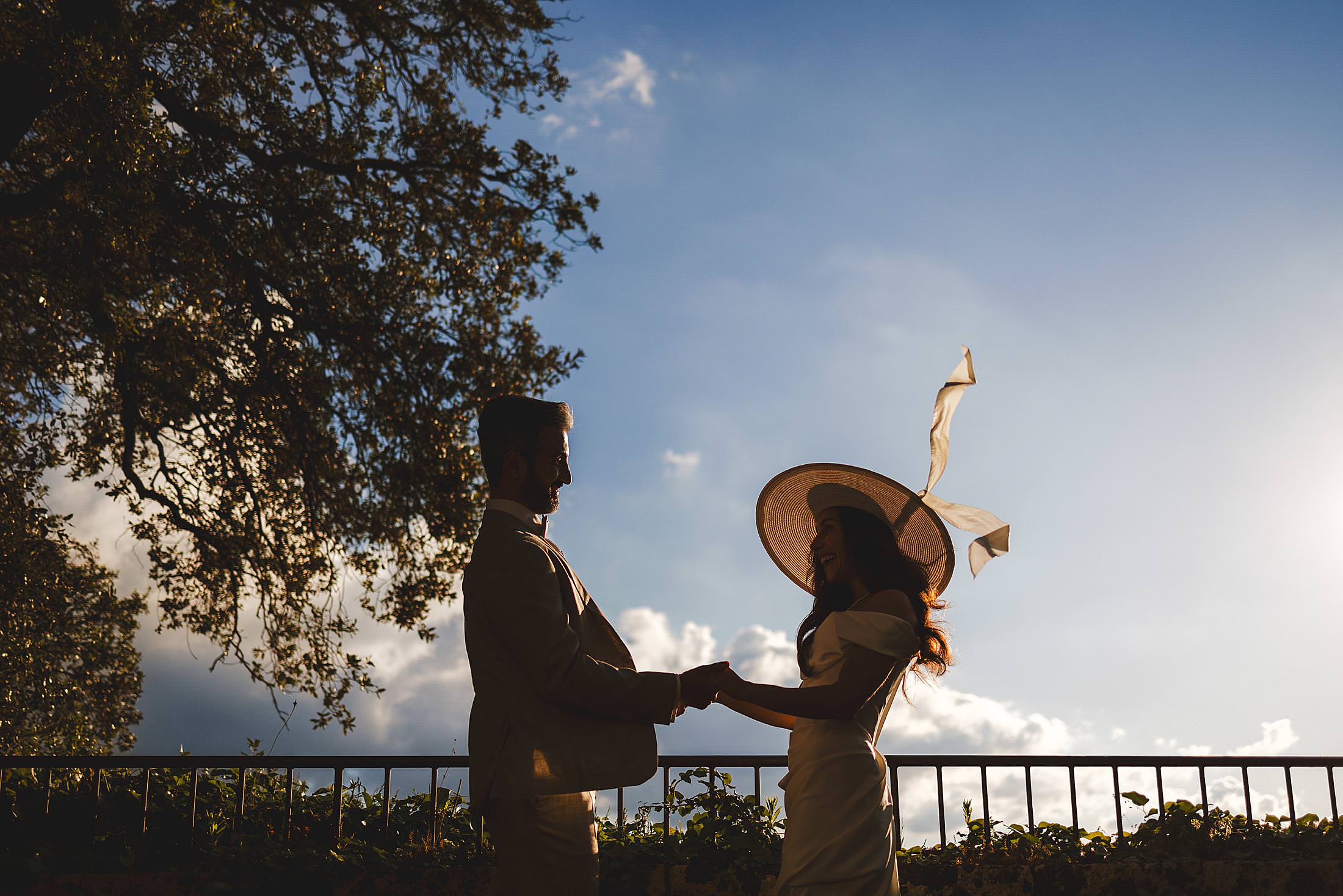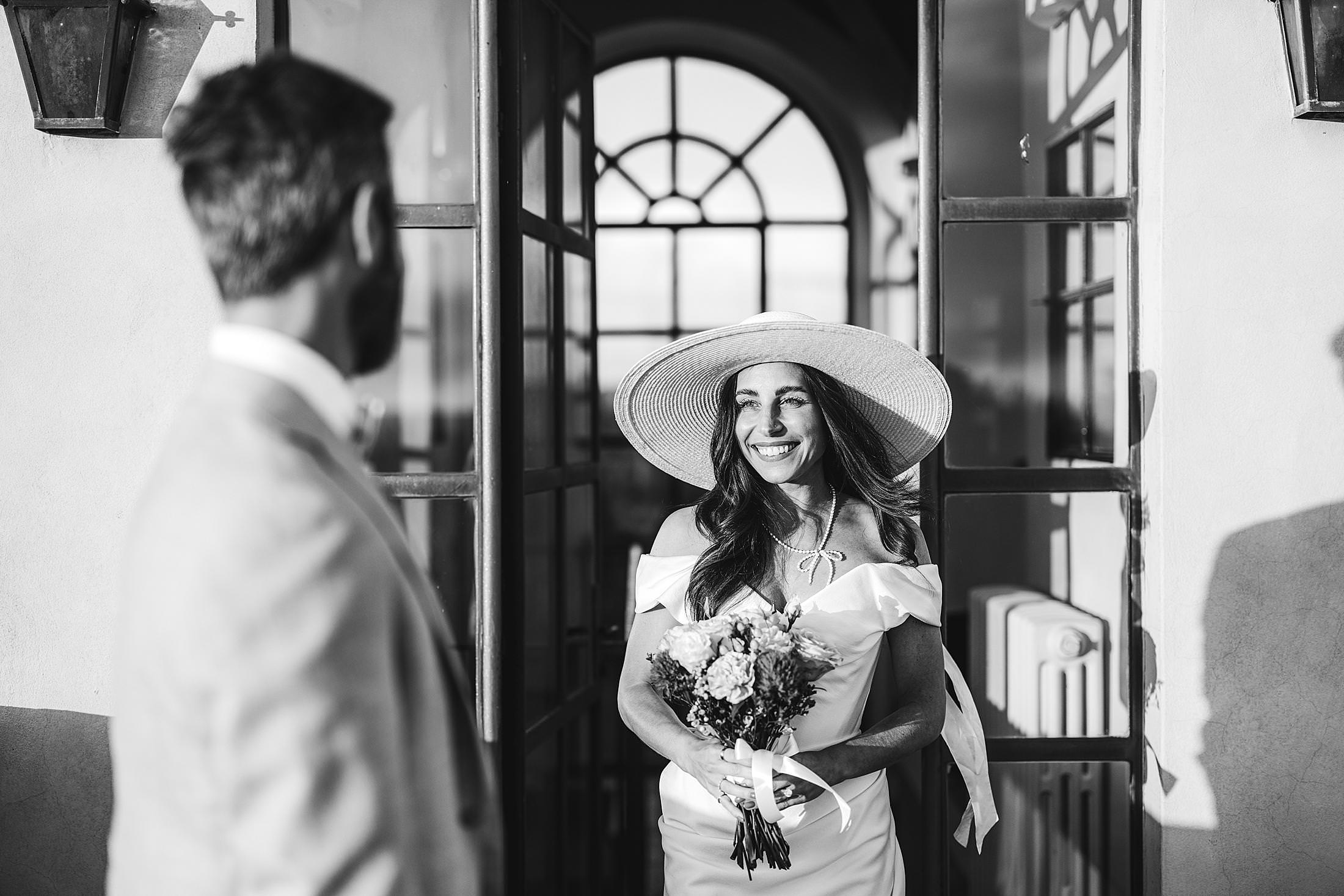 Stylish and elegant elopement portrait with hat at iconic Borgo Pignano in the heart of Chianti countryside. Photo by the Italian elegant and creative elopement photographer in Tuscany Gabriele Fani