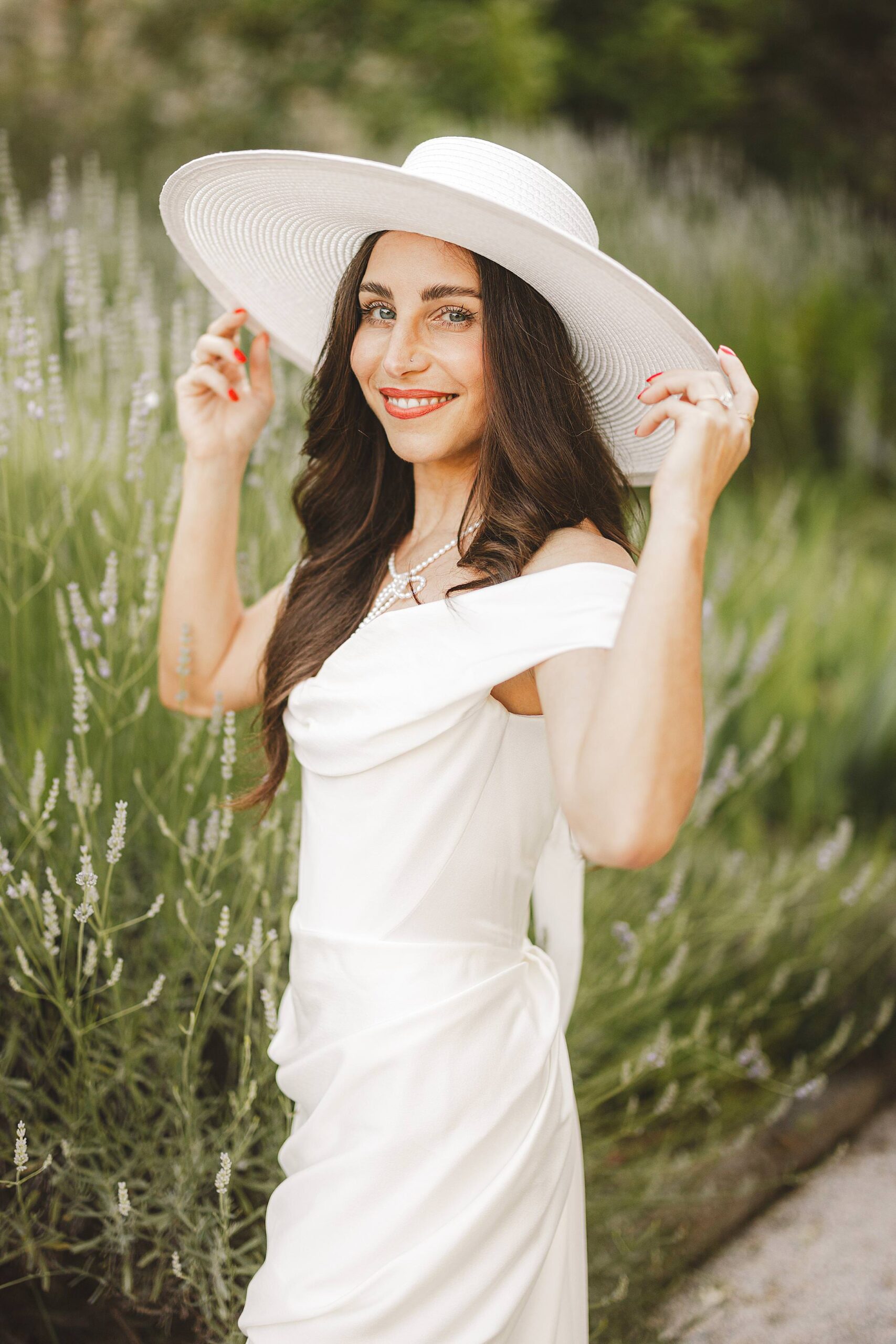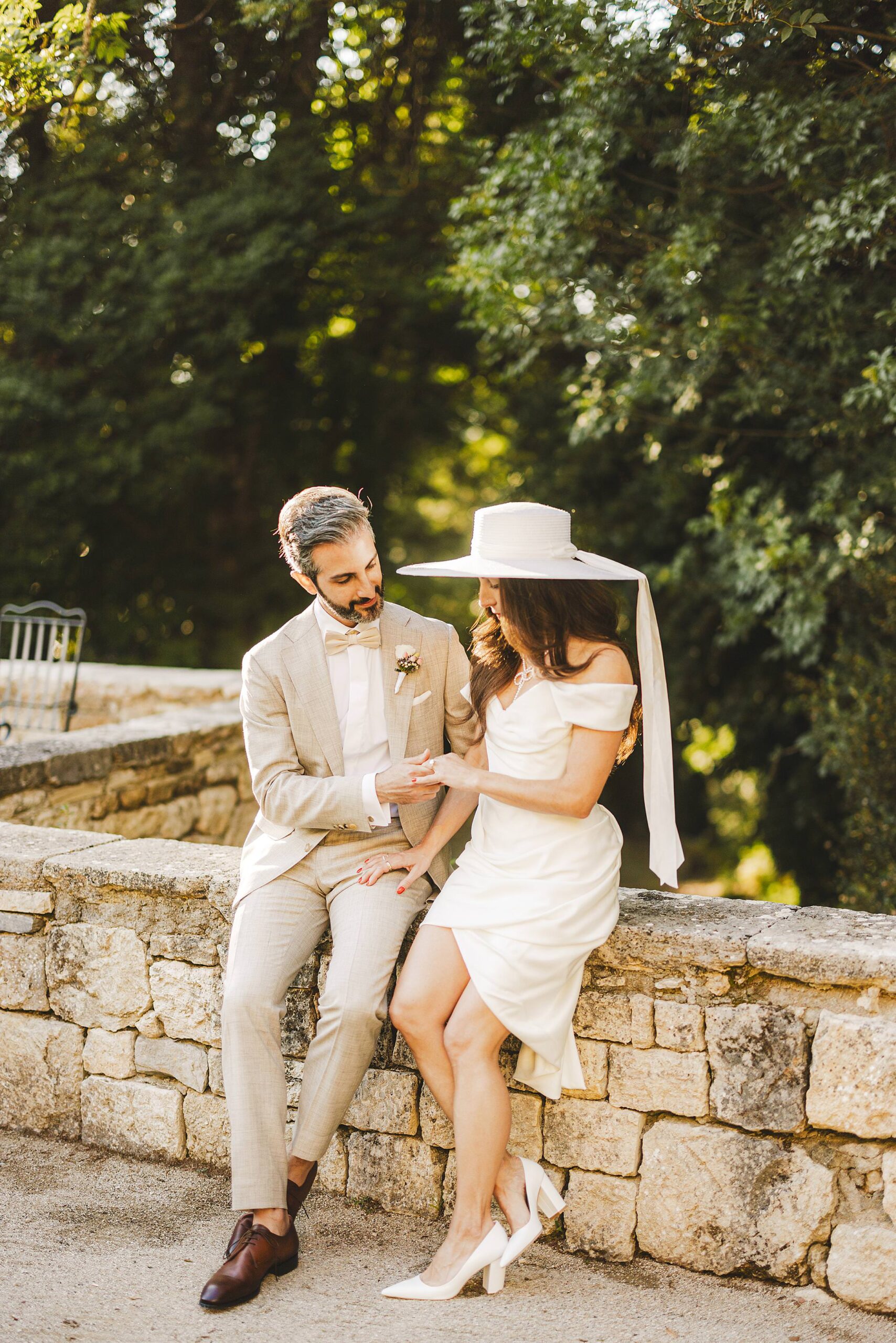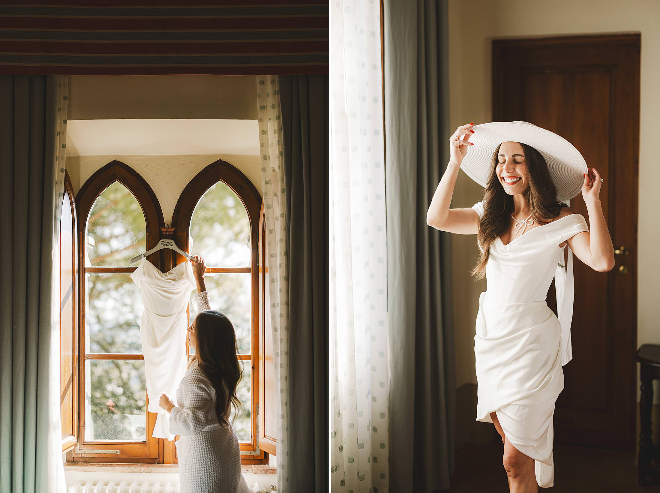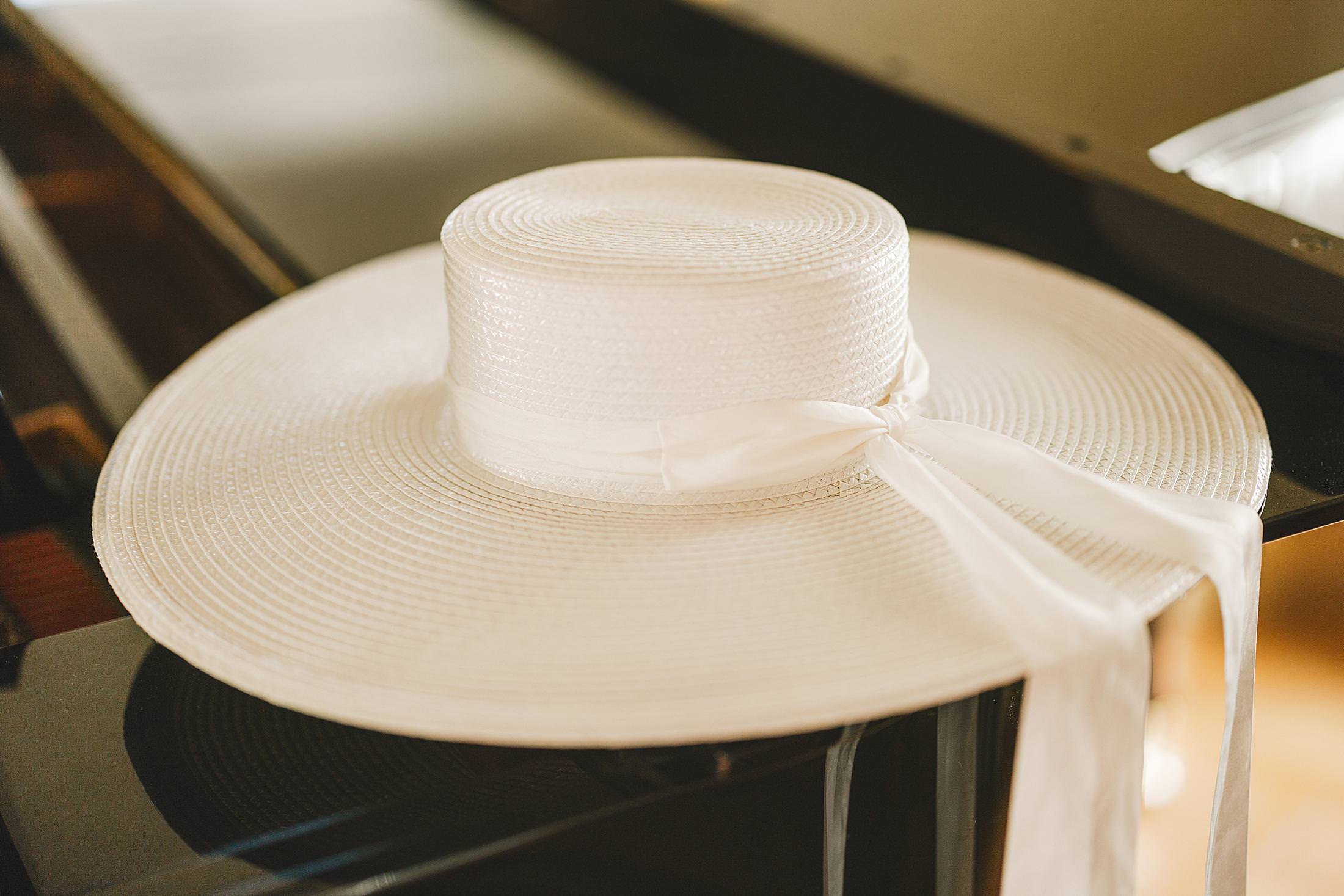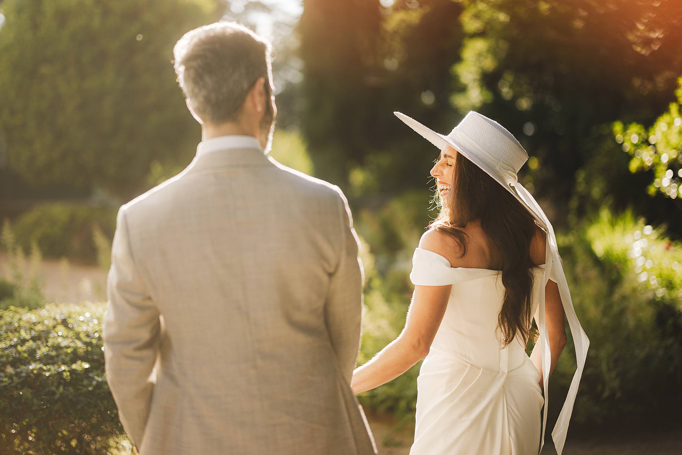 Stylish and elegant elopement portrait with hat at iconic Borgo Pignano in the heart of Chianti countryside. Photo by the Italian elegant and creative elopement photographer in Tuscany Gabriele Fani