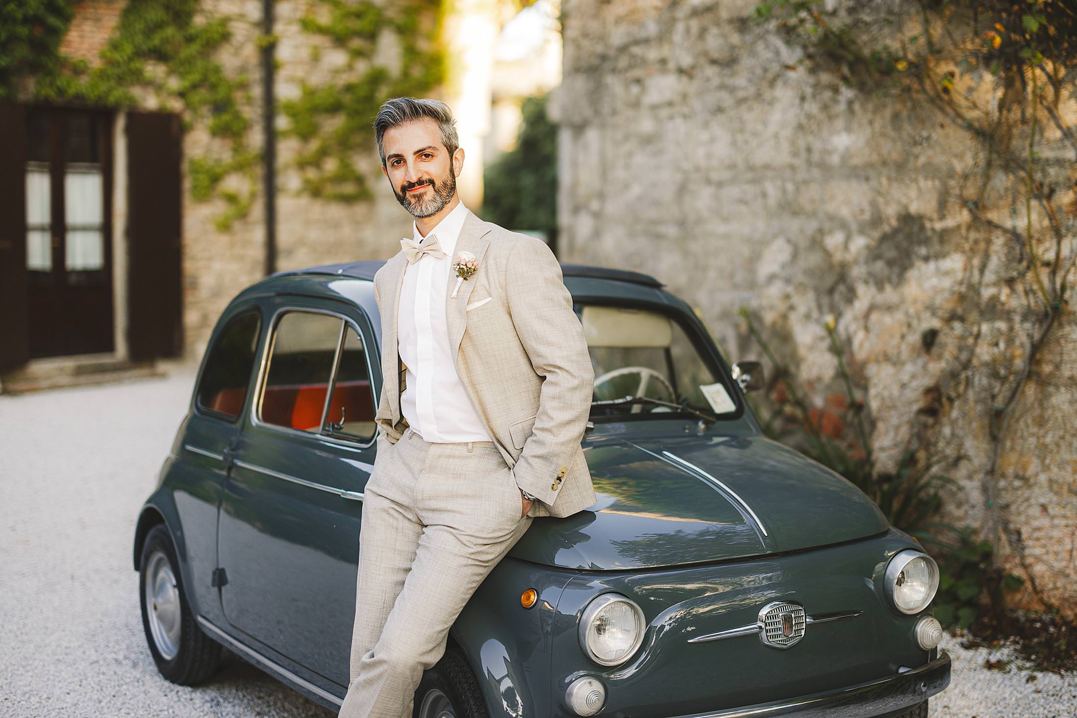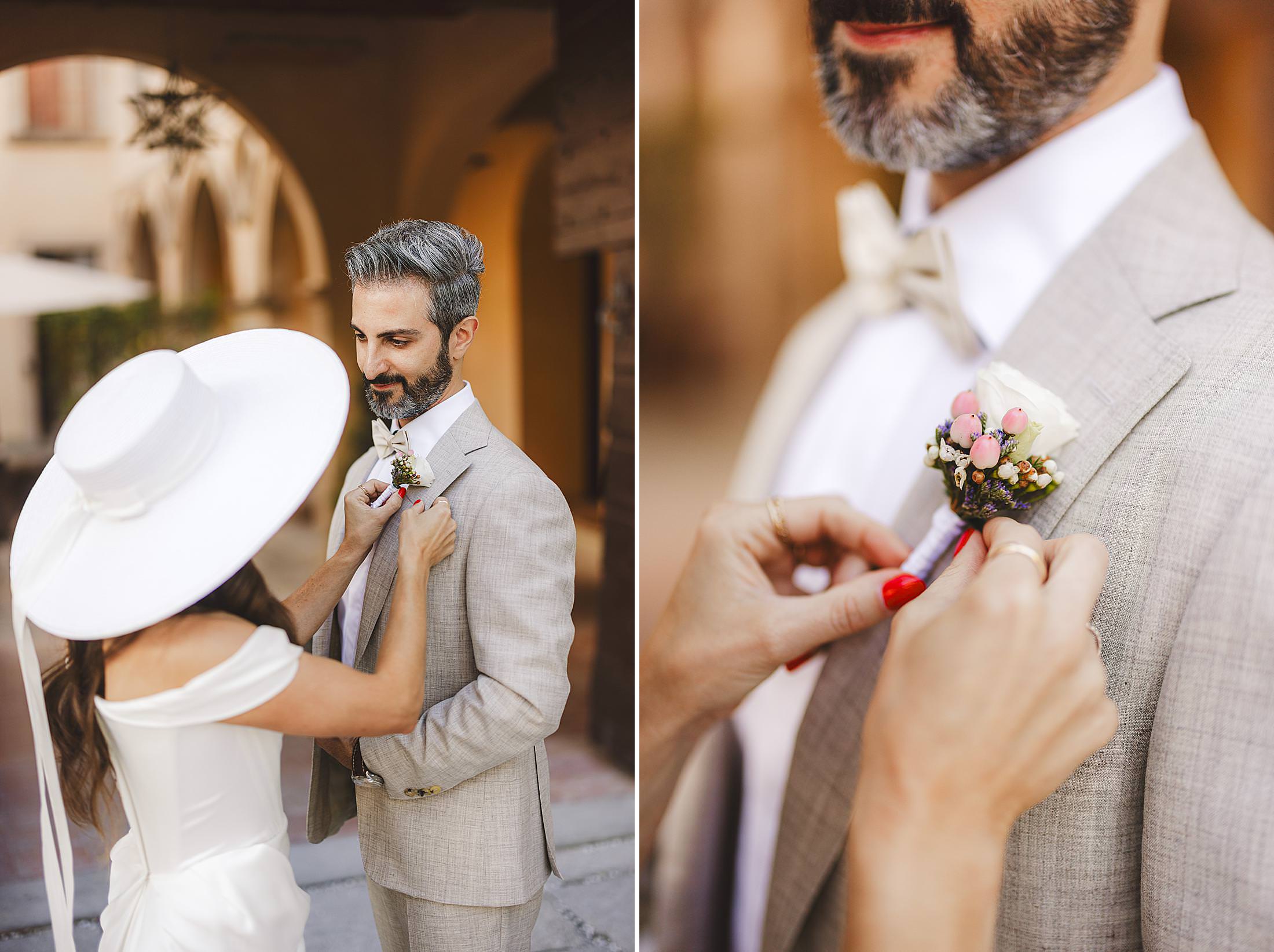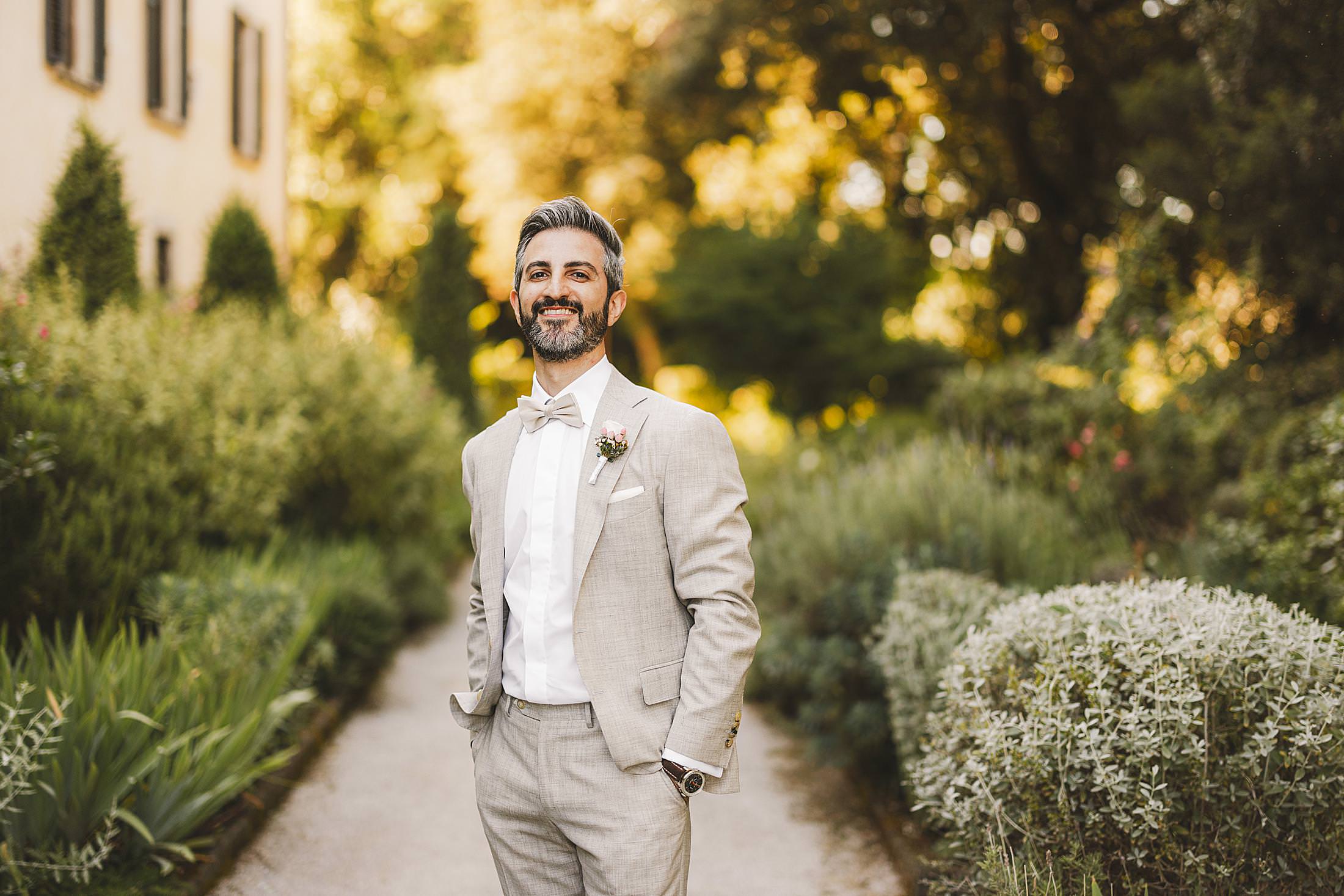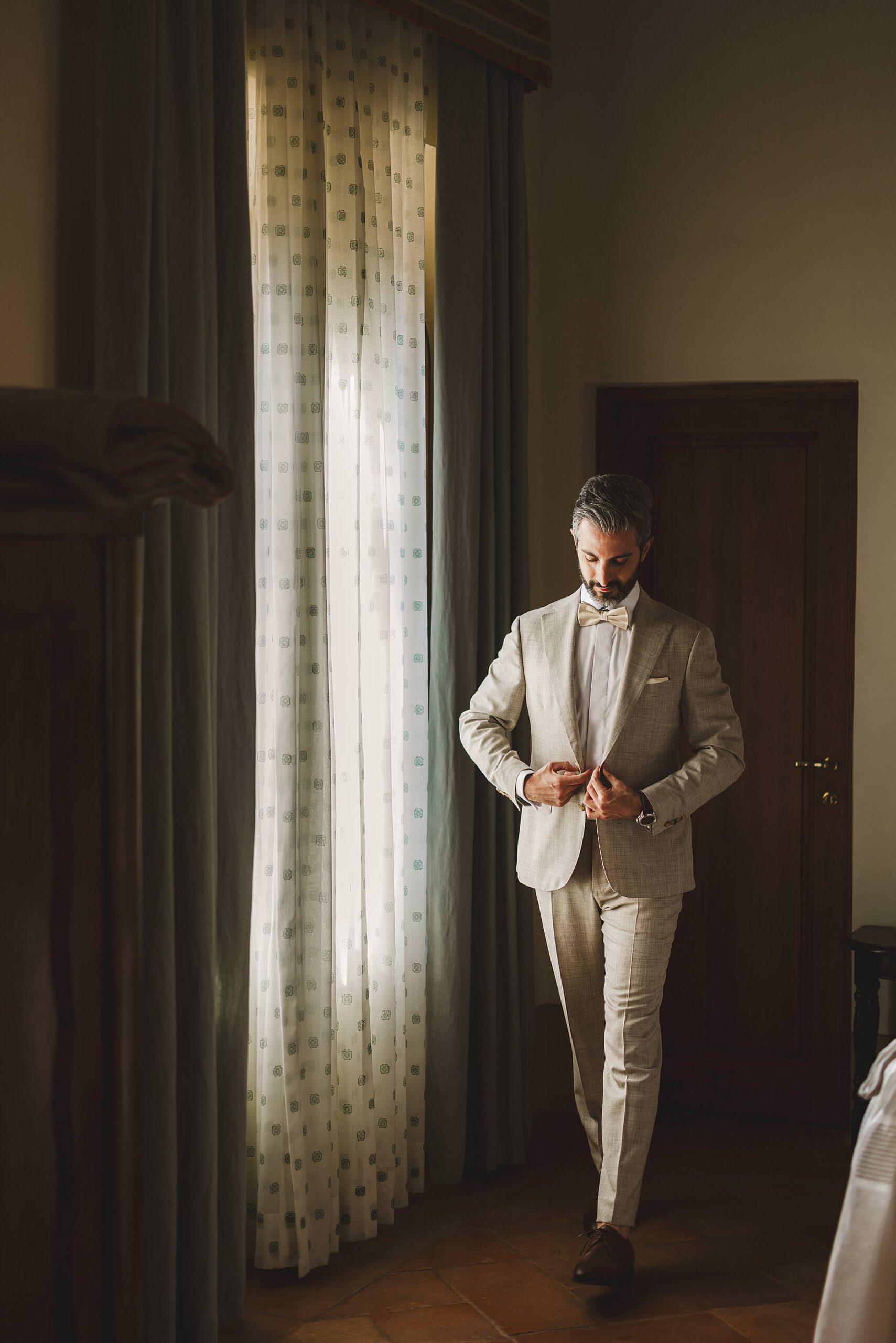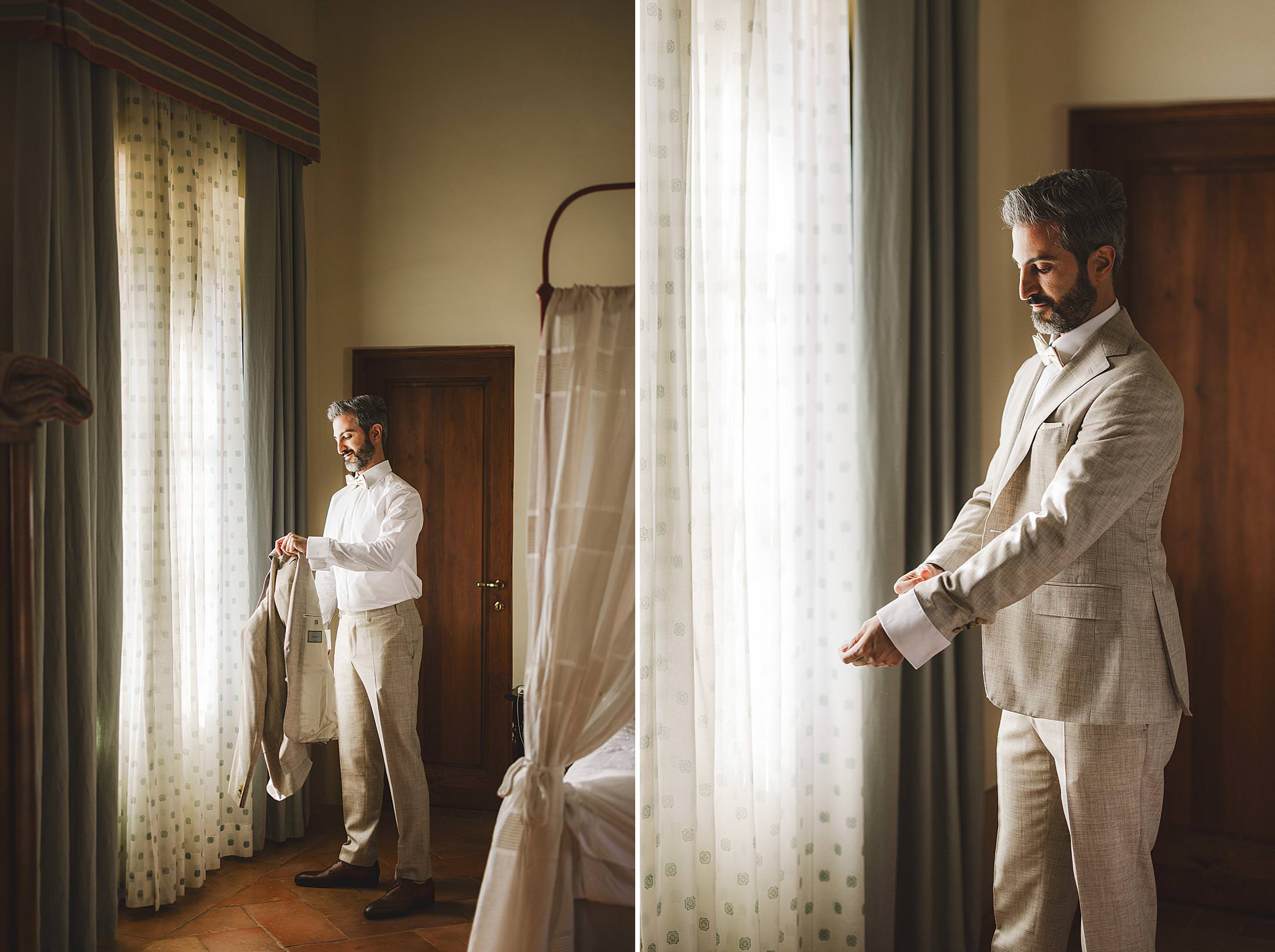 Elegance and beauty groom portrait during getting ready at Borgo Pignano for elopement wedding. Photo by the Italian elegant and creative elopement photographer in Tuscany Gabriele Fani