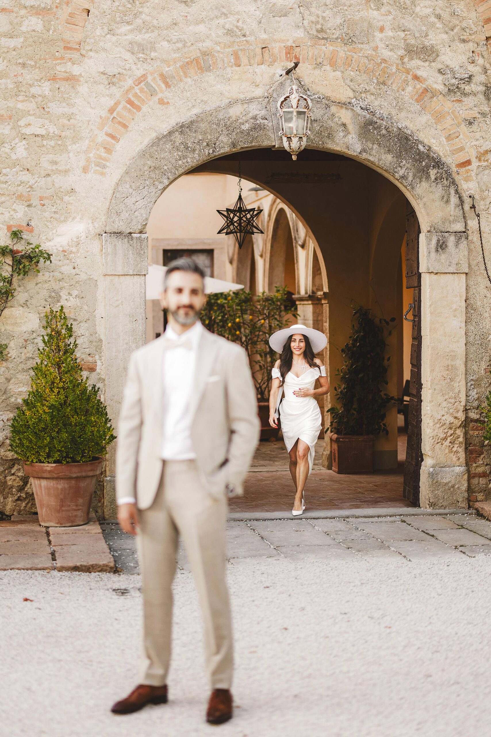 Some places seem to be made for love stories. Borgo Pignano, located in the heart of the Chianti countryside, is one of them: a secluded haven where time slows down and every corner exudes beauty and charm. For Brittany and Behzad, an elegant couple from California, this breathtaking venue became the perfect setting for their elopement wedding photos.