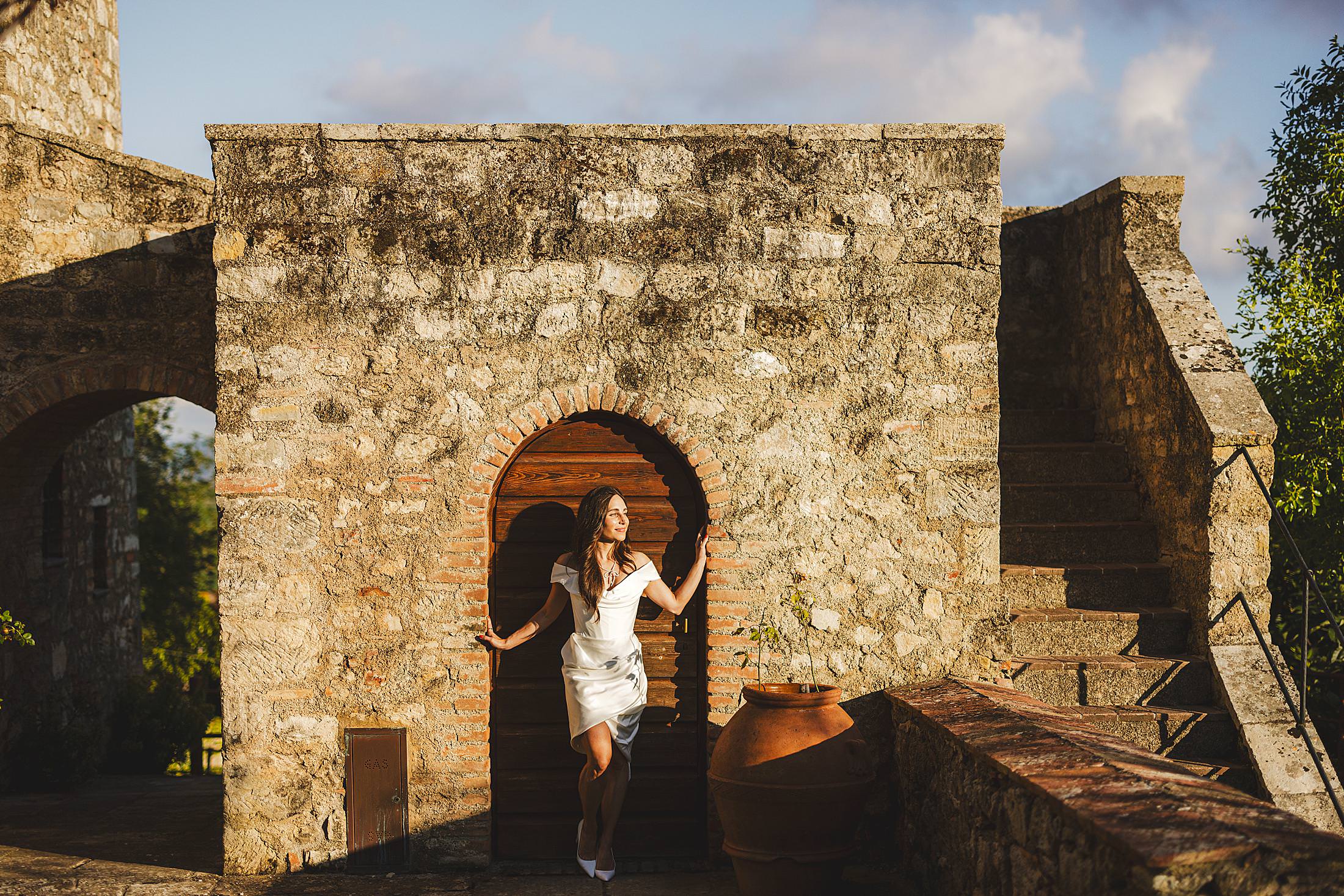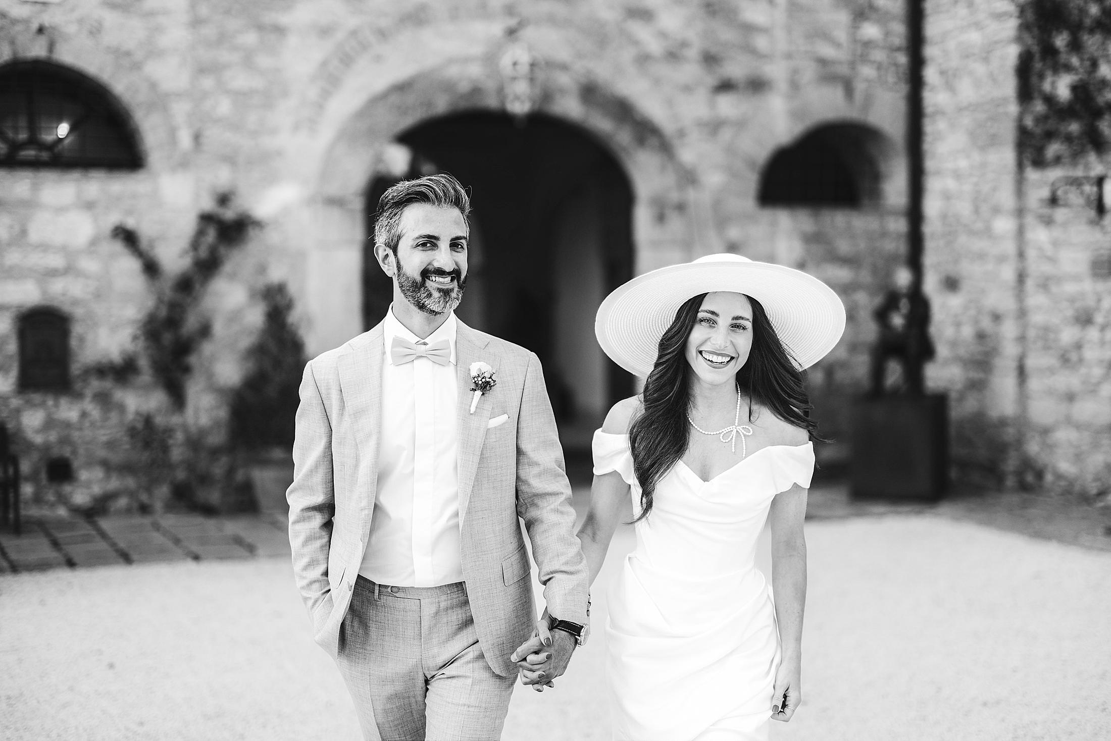 Stylish and elegant candid elopement portrait at iconic Borgo Pignano in the heart of Chianti countryside. Photo by the Italian elegant and creative elopement photographer in Tuscany Gabriele Fani