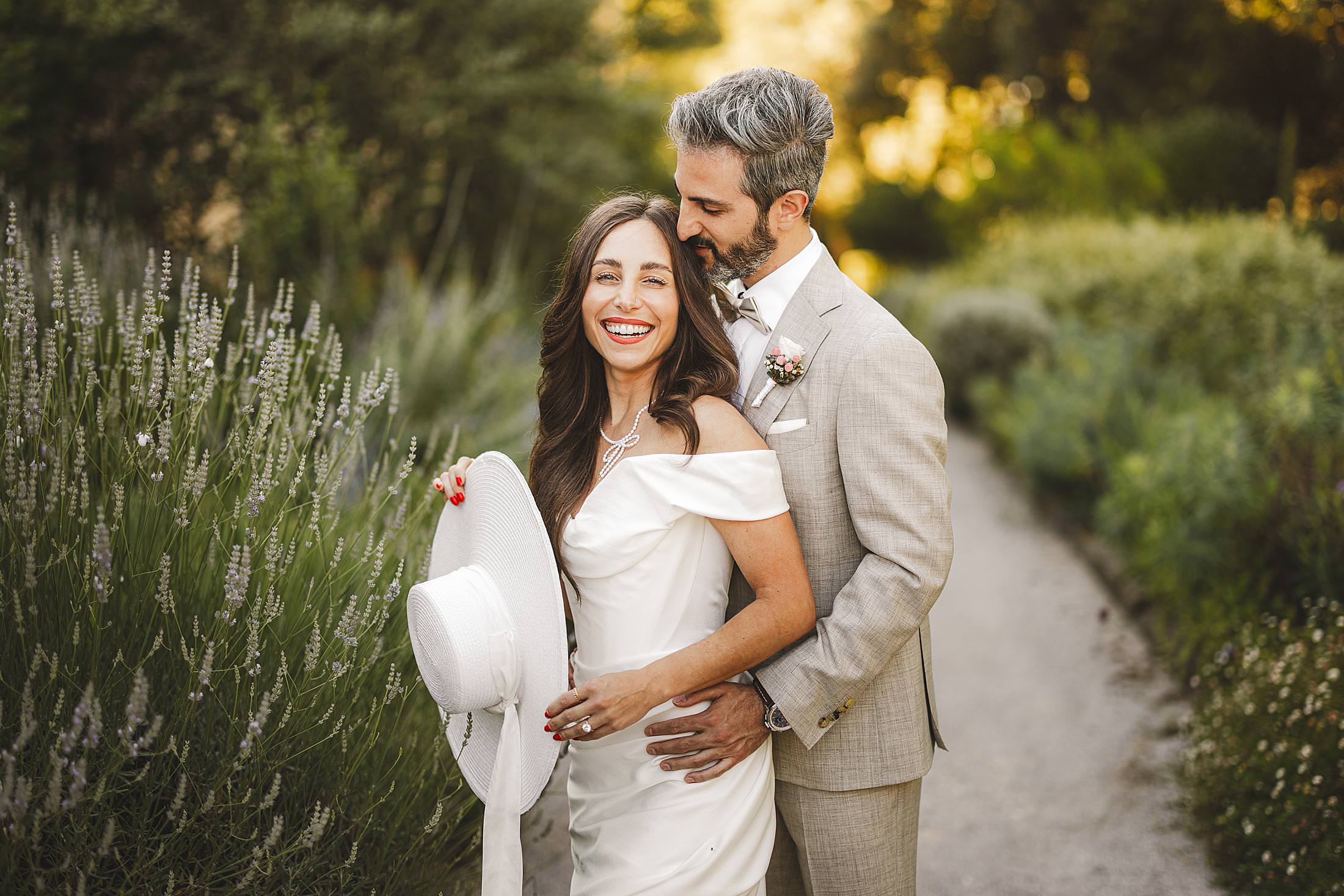 Candid and lovely bride and groom elopement portrait during golden hour at Borgo Pignano. Photo by the Italian elegant and creative elopement photographer in Tuscany Gabriele Fani