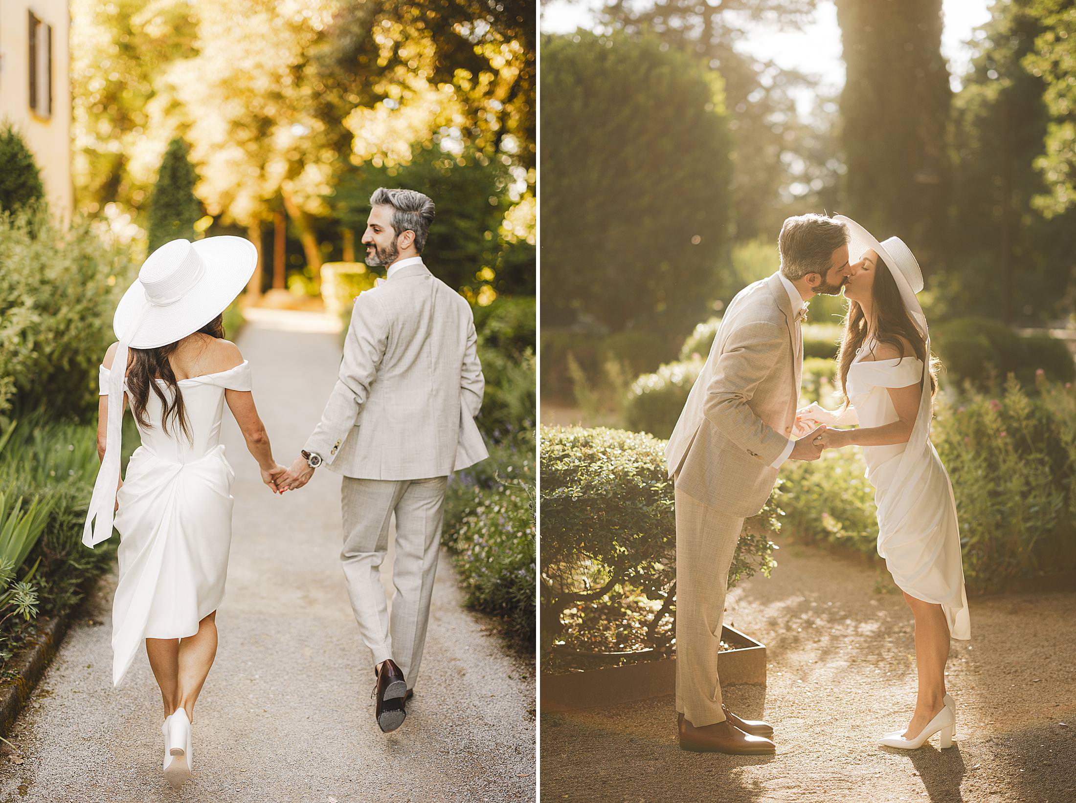 Lovely and emotional bride and groom elopement photo shoot in the park of Borgo Pignano. Photo by the Italian elegant and creative elopement photographer in Tuscany Gabriele Fani