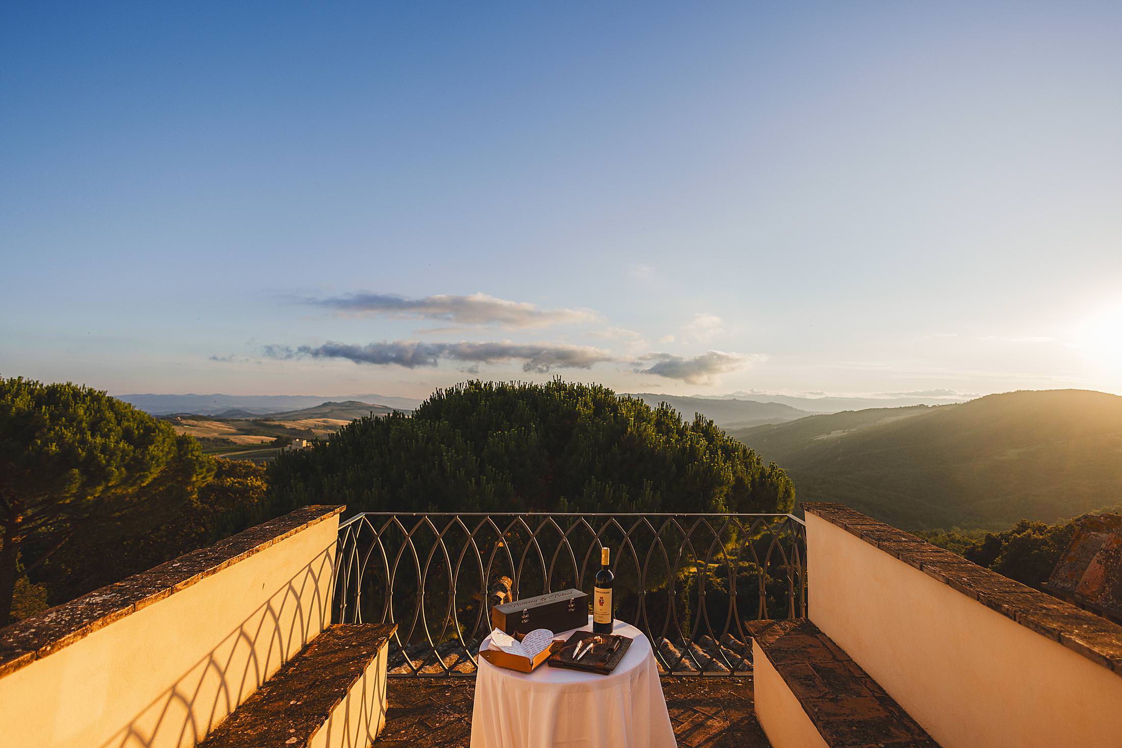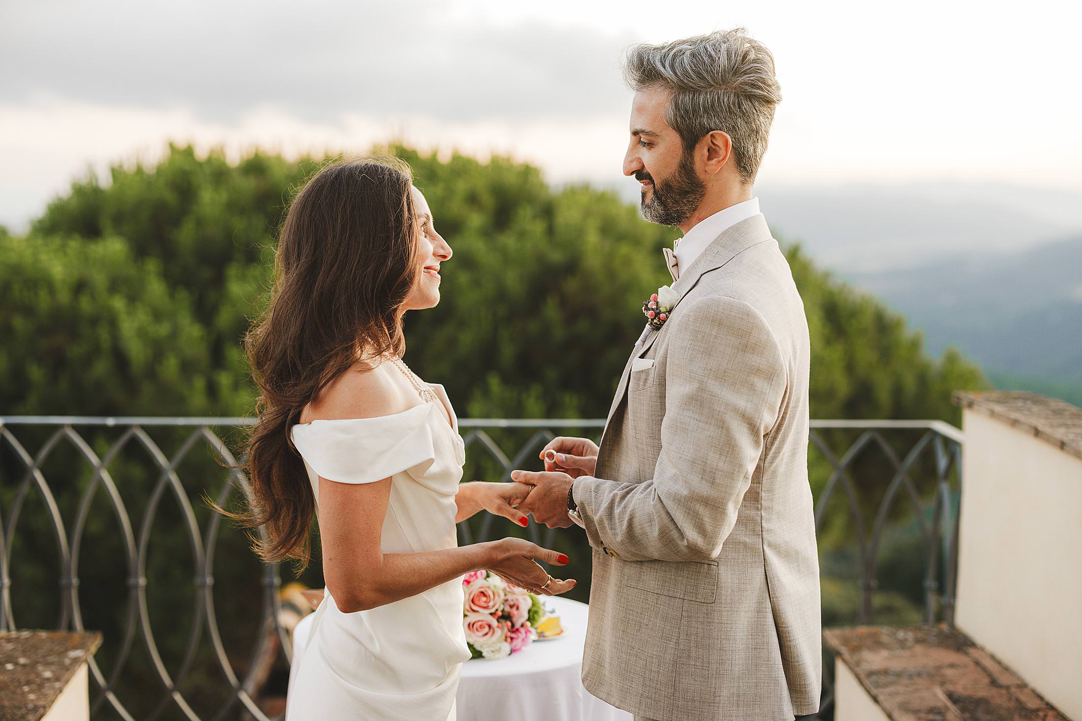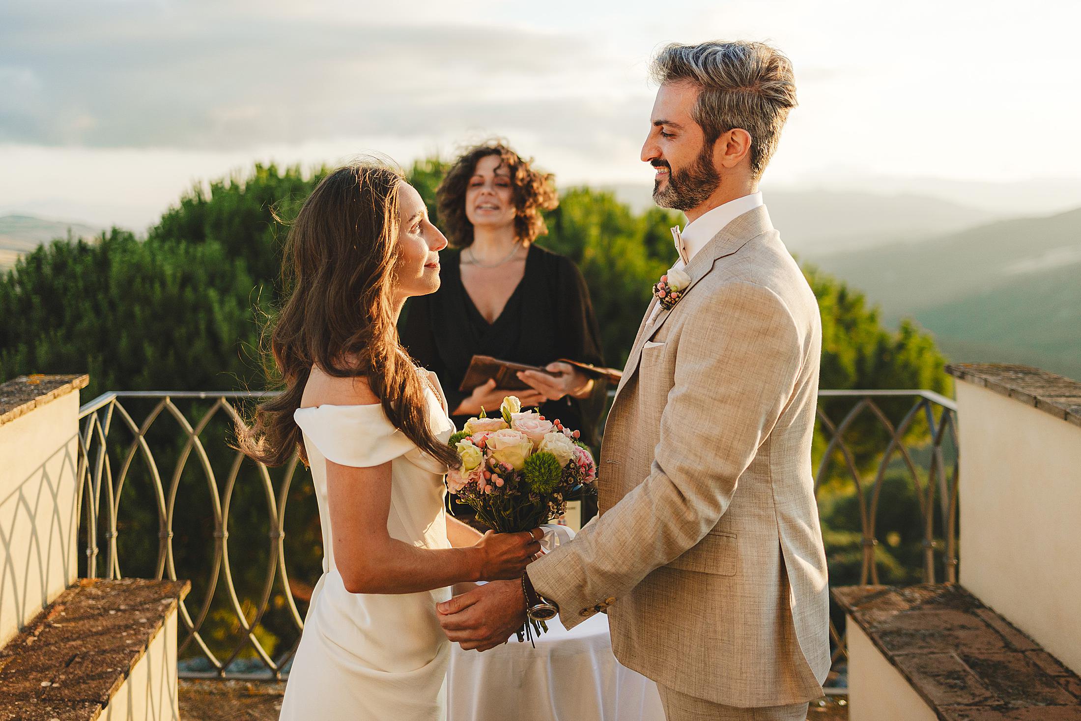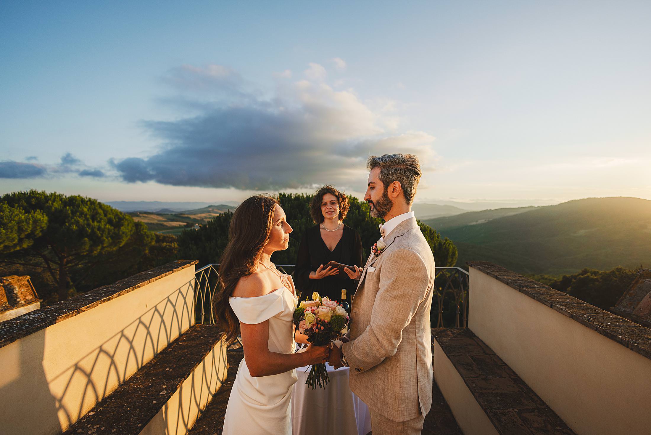 As the sun dipped toward the horizon, painting the sky in warm hues, it was time for the symbolic ceremony. The couple stood on the panoramic terrace, with the endless countryside stretching before them. The intimate exchange of vows, set against this breathtaking scenery, made for some of the most powerful and emotional elopement wedding photos of the day.