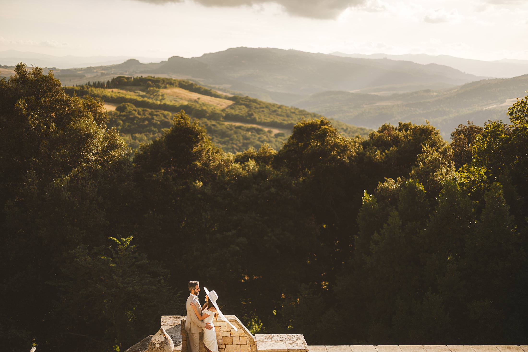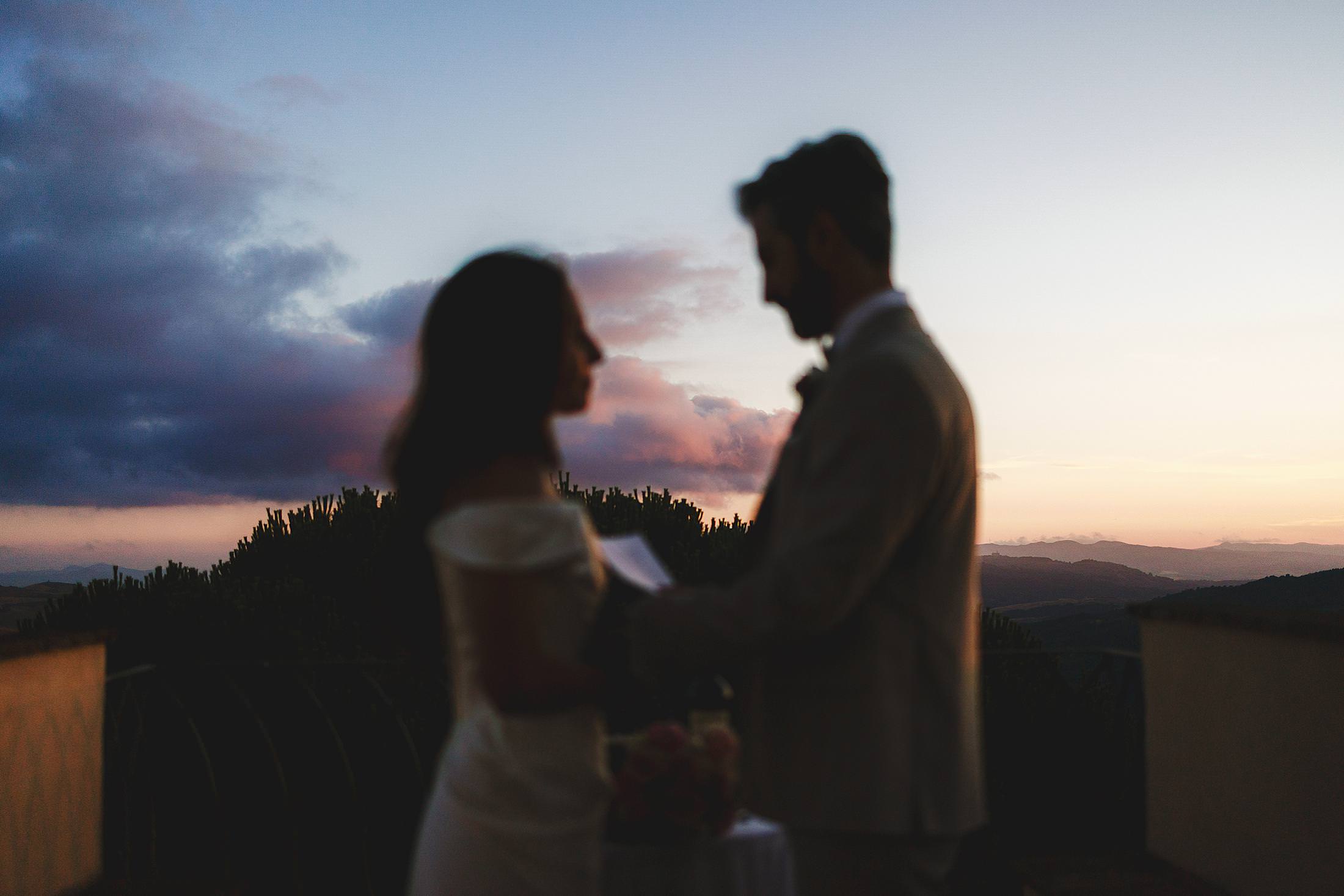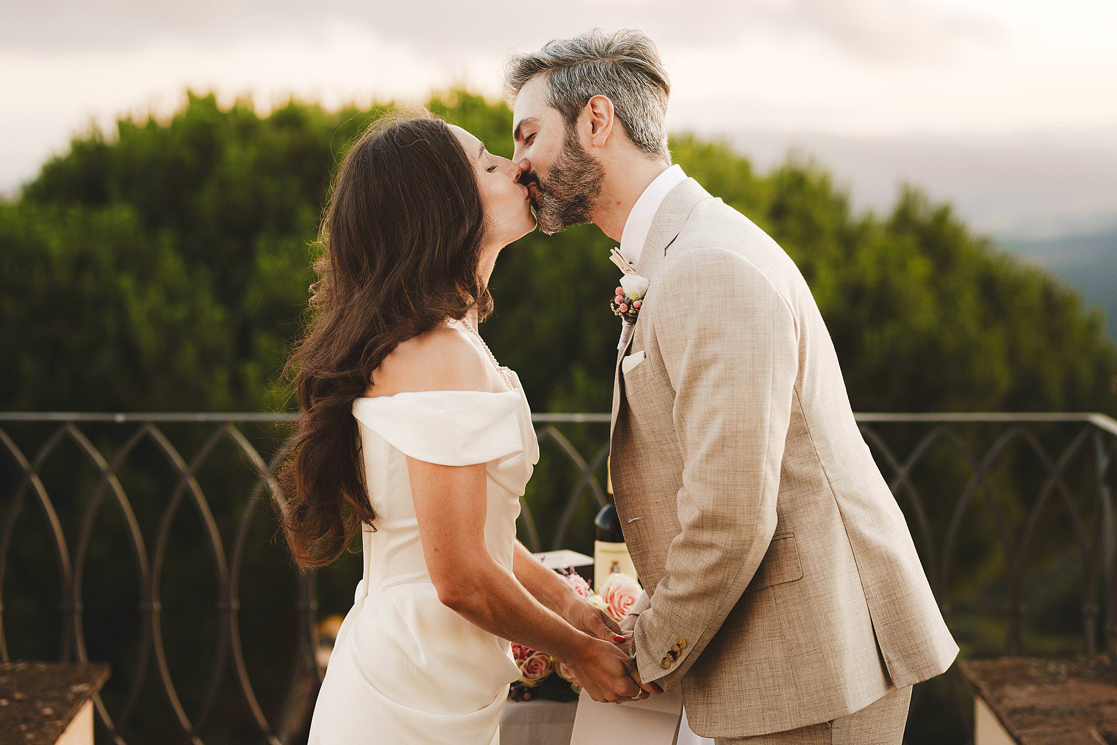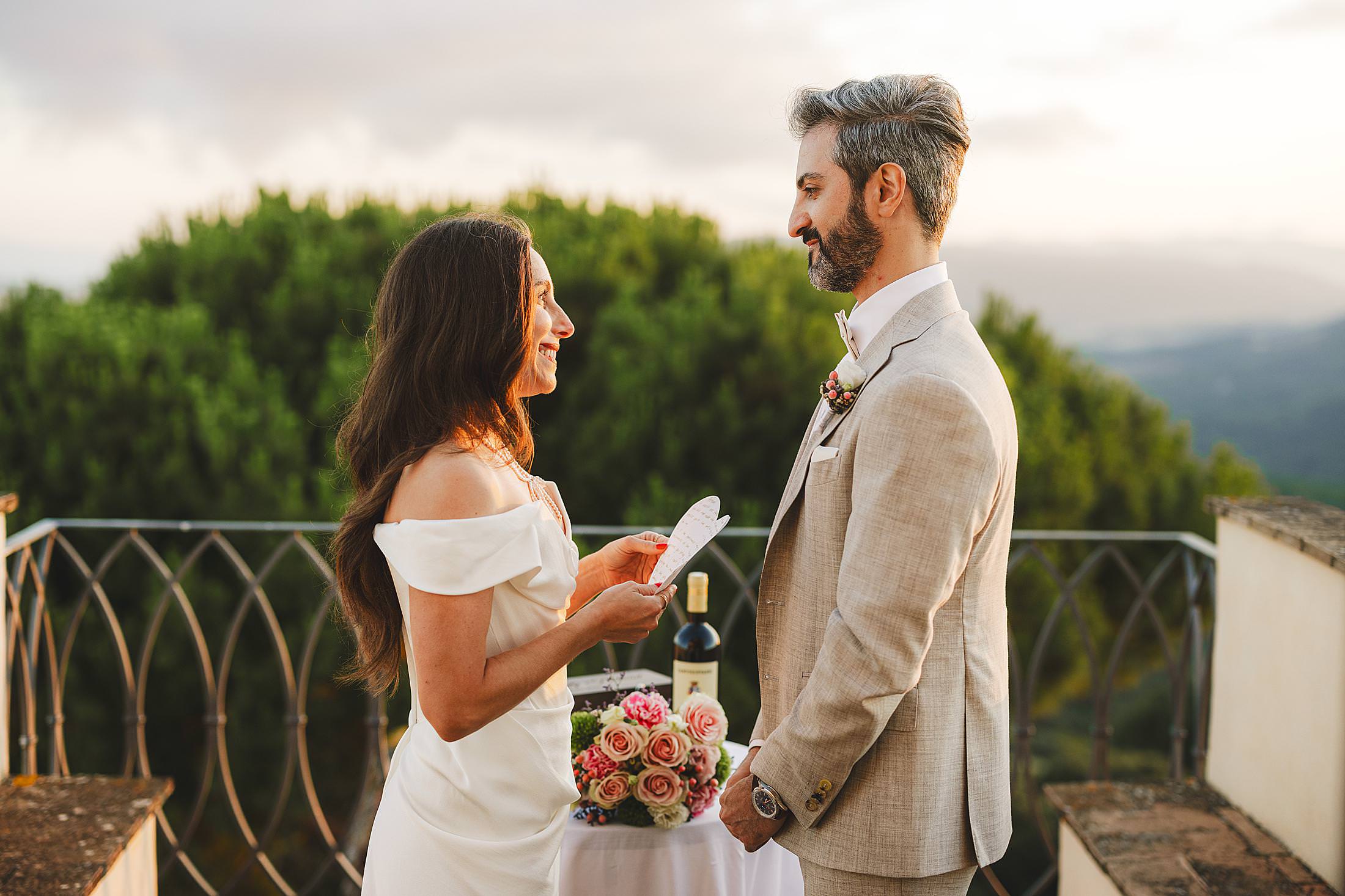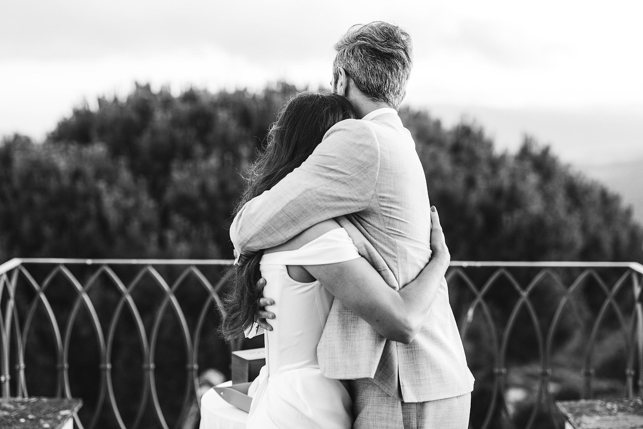 As the sun dipped toward the horizon, painting the sky in warm hues, it was time for the symbolic ceremony. The couple stood on the panoramic terrace, with the endless countryside stretching before them. The intimate exchange of vows, set against this breathtaking scenery, made for some of the most powerful and emotional elopement wedding photos of the day.