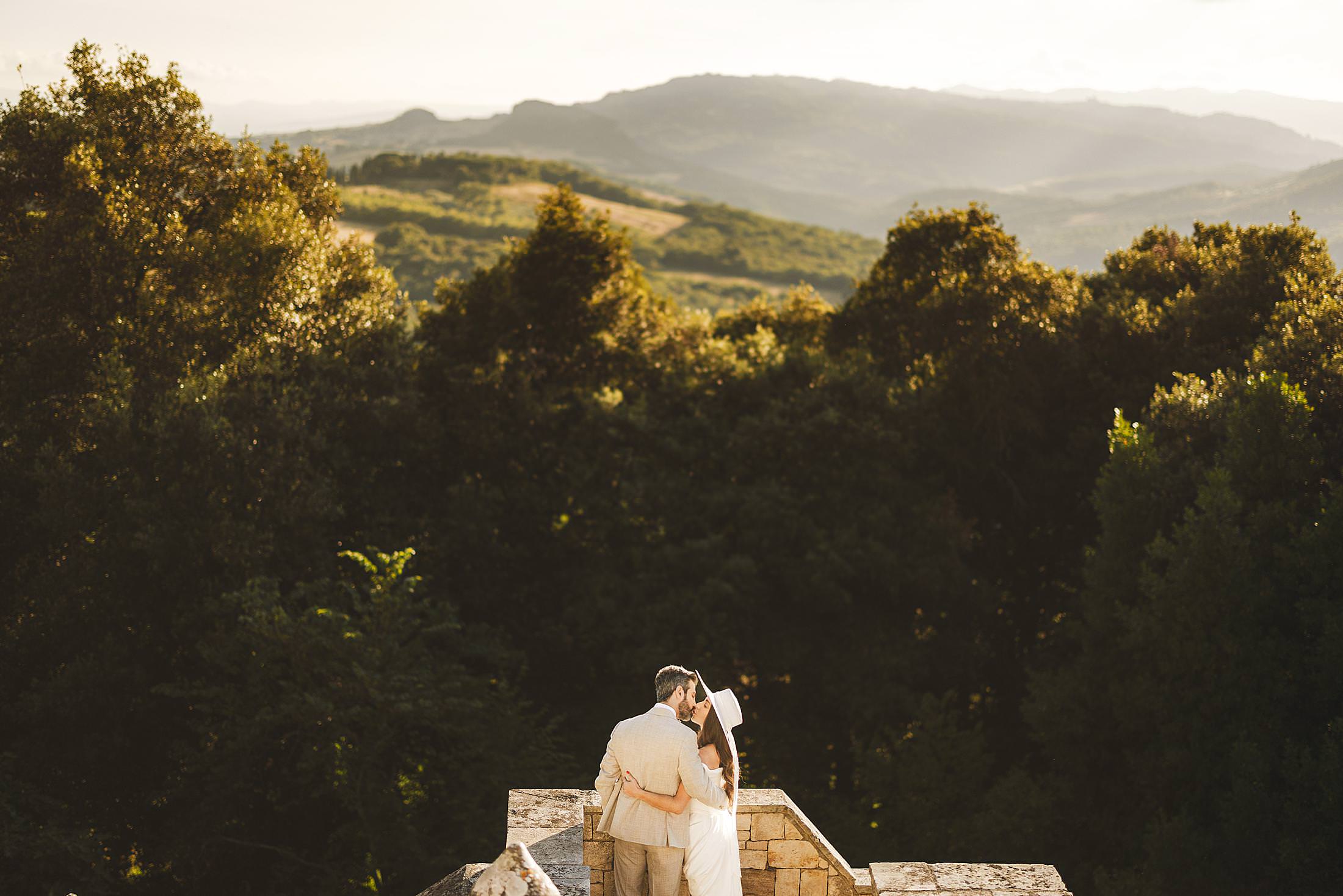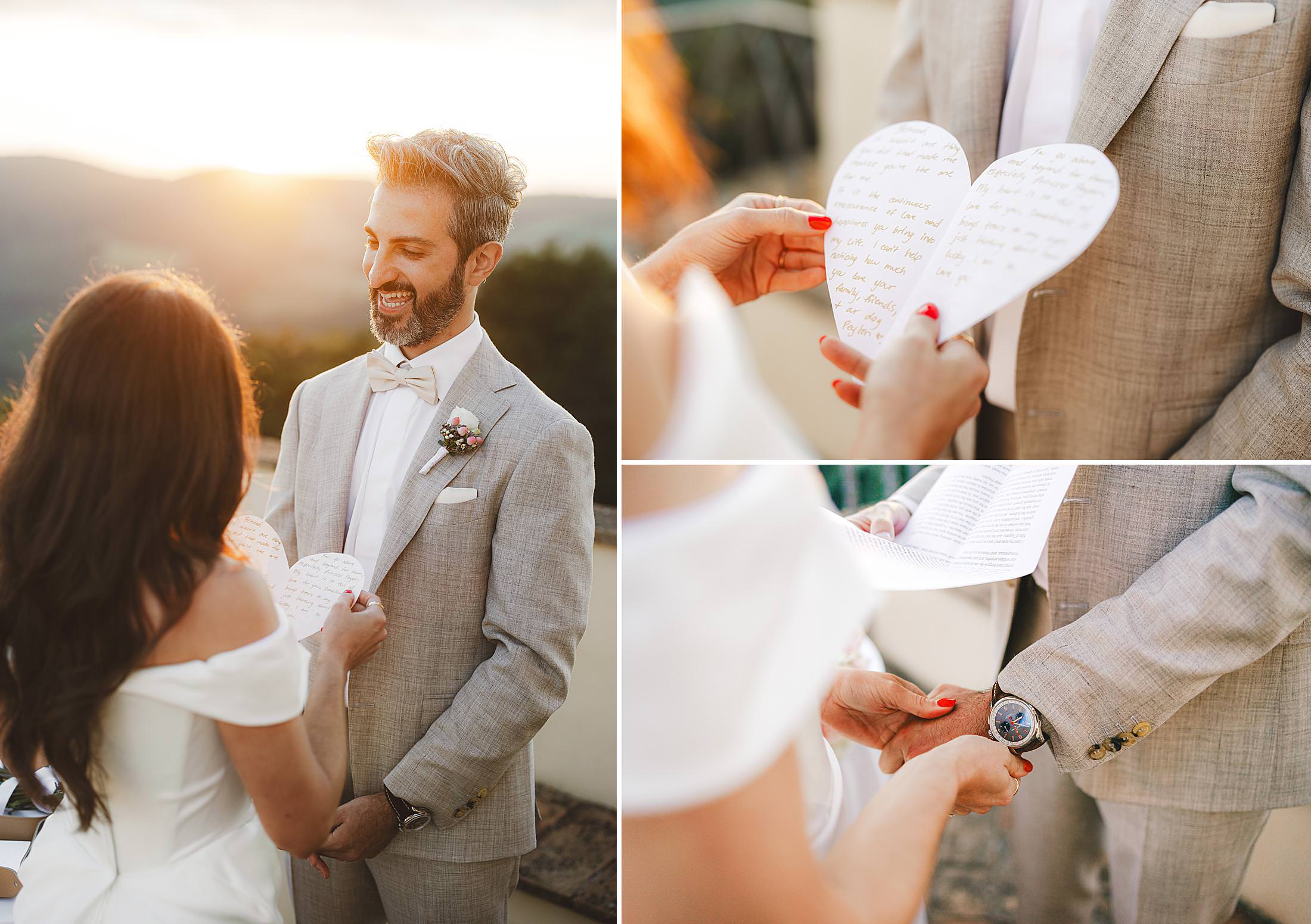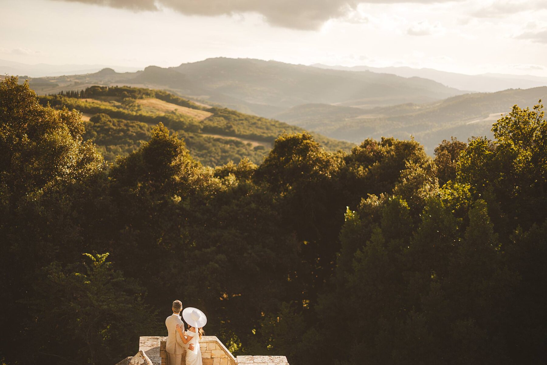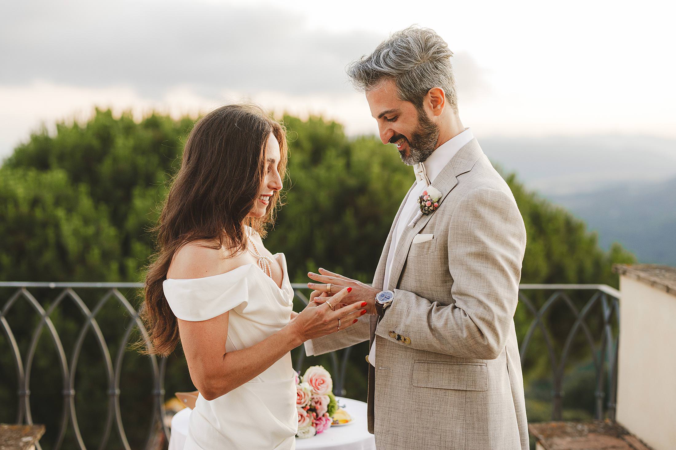 As the sun dipped toward the horizon, painting the sky in warm hues, it was time for the symbolic ceremony. The couple stood on the panoramic terrace, with the endless countryside stretching before them. The intimate exchange of vows, set against this breathtaking scenery, made for some of the most powerful and emotional elopement wedding photos of the day.