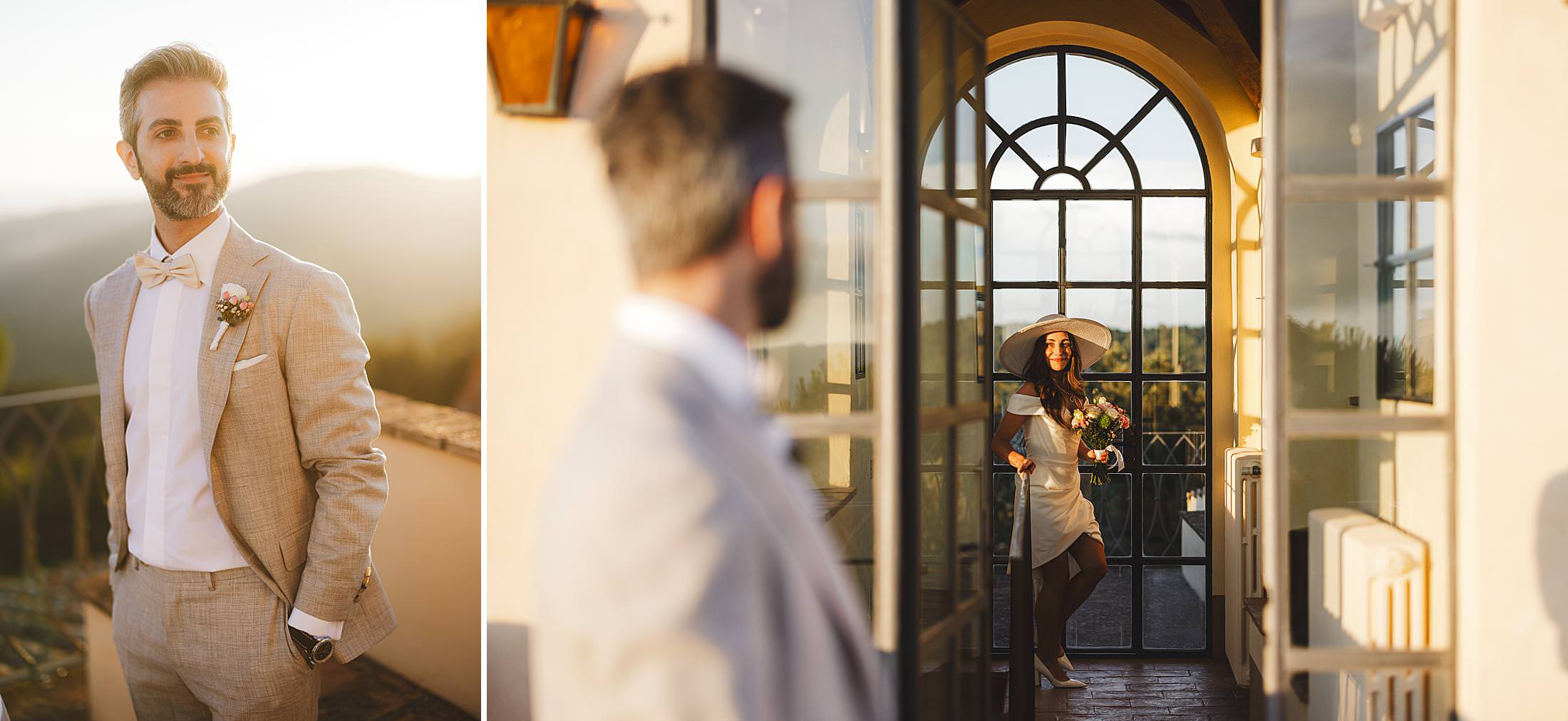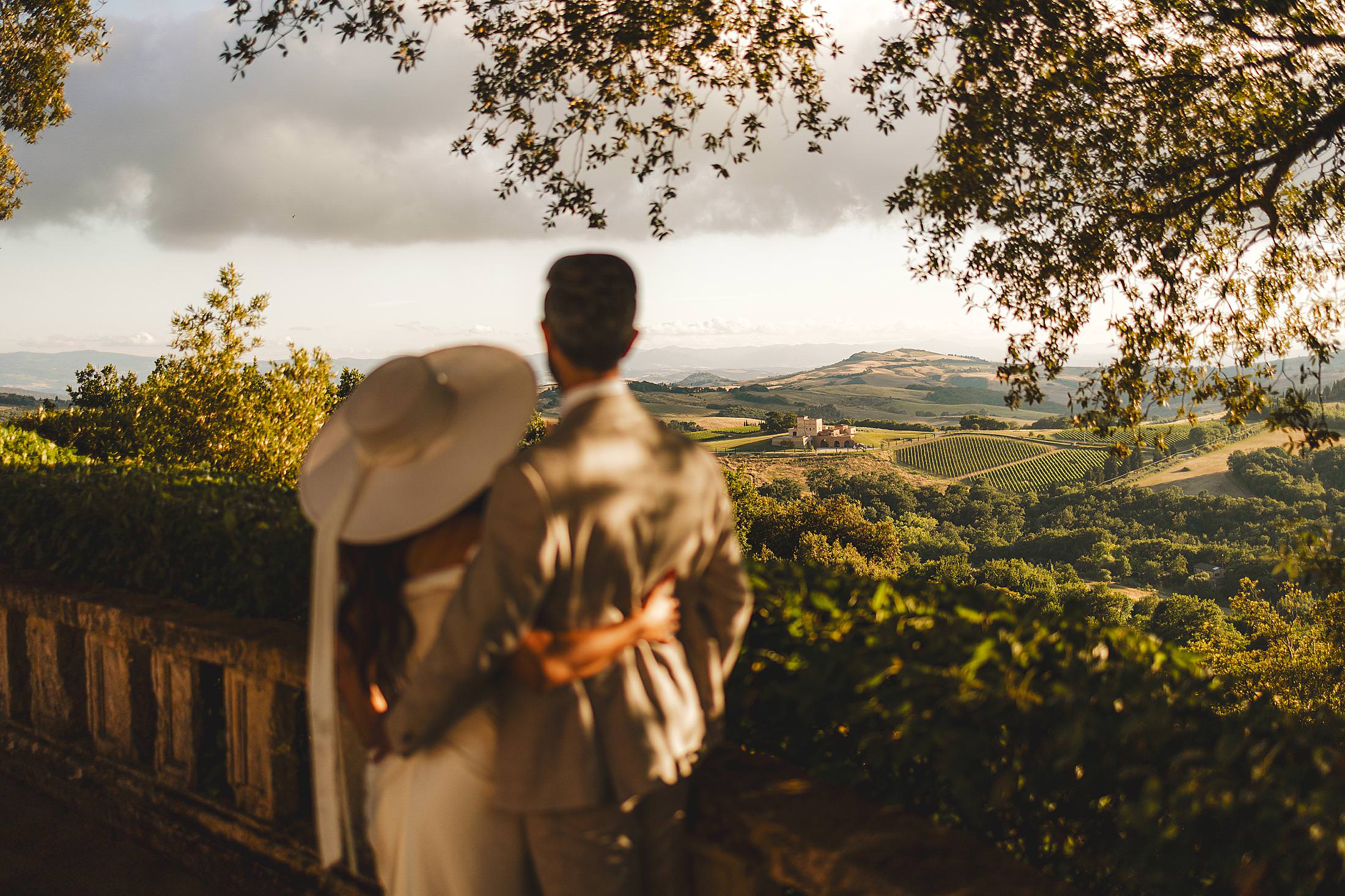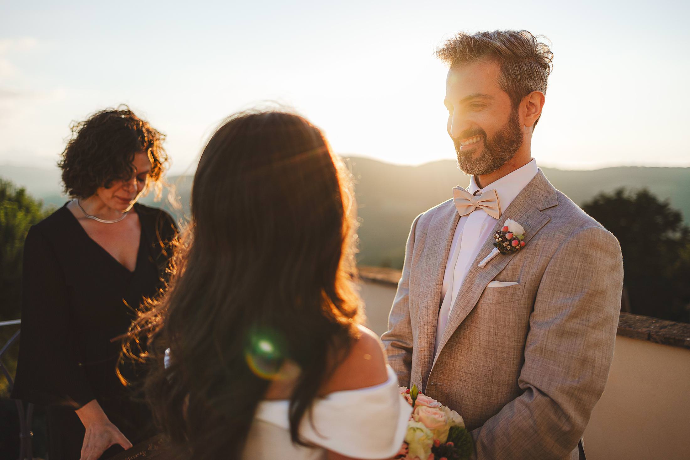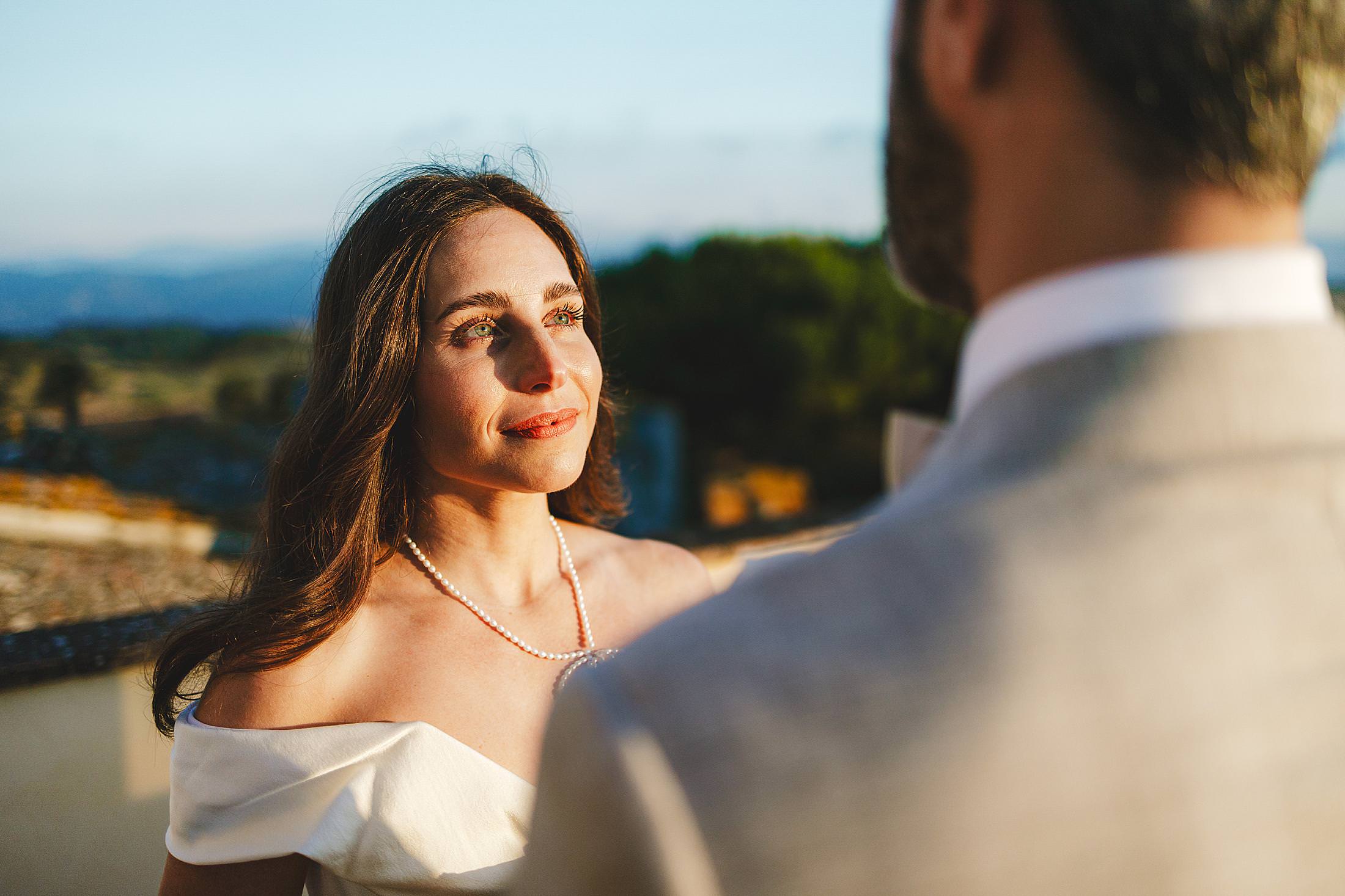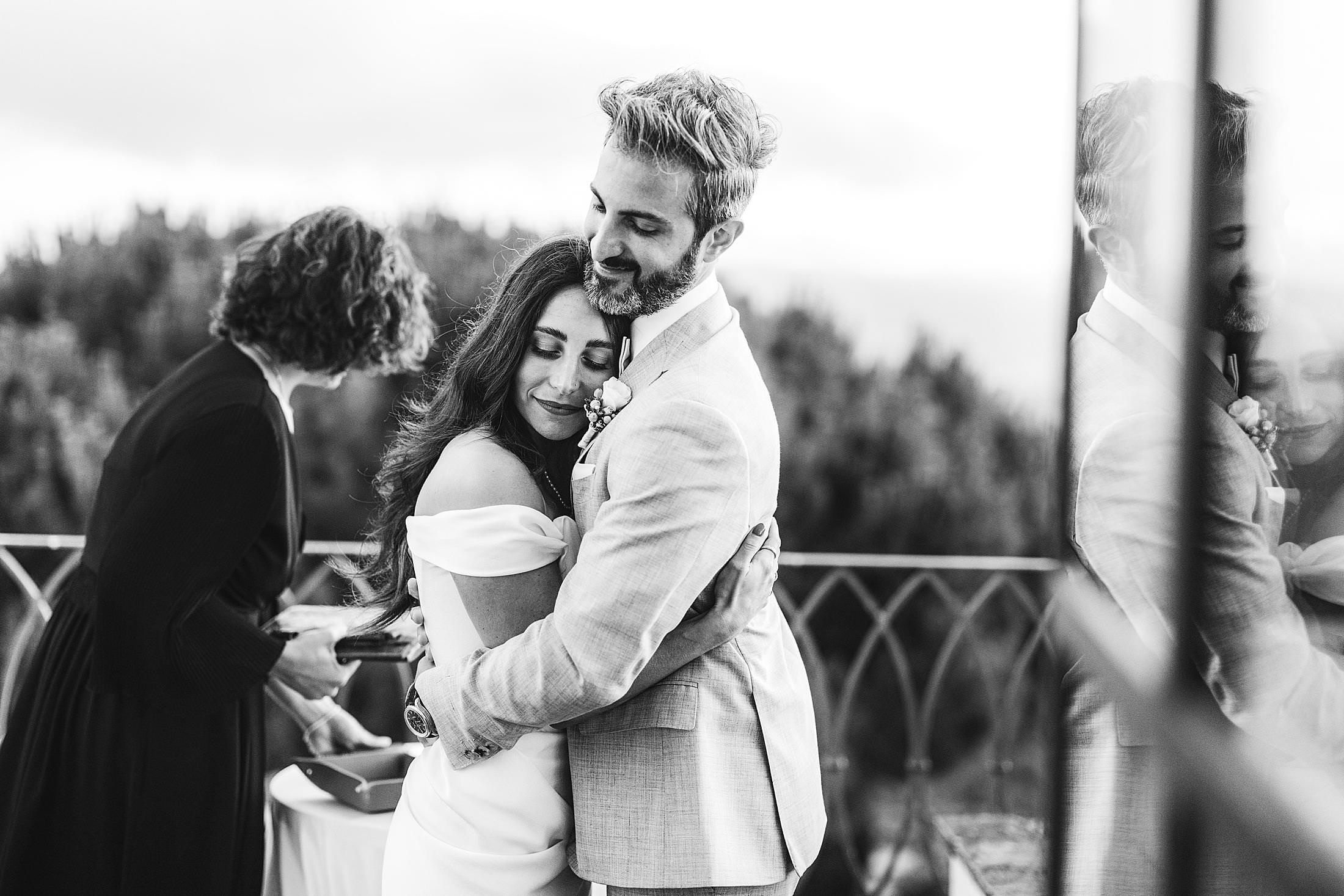 As the sun dipped toward the horizon, painting the sky in warm hues, it was time for the symbolic ceremony. The couple stood on the panoramic terrace, with the endless countryside stretching before them. The intimate exchange of vows, set against this breathtaking scenery, made for some of the most powerful and emotional elopement wedding photos of the day.