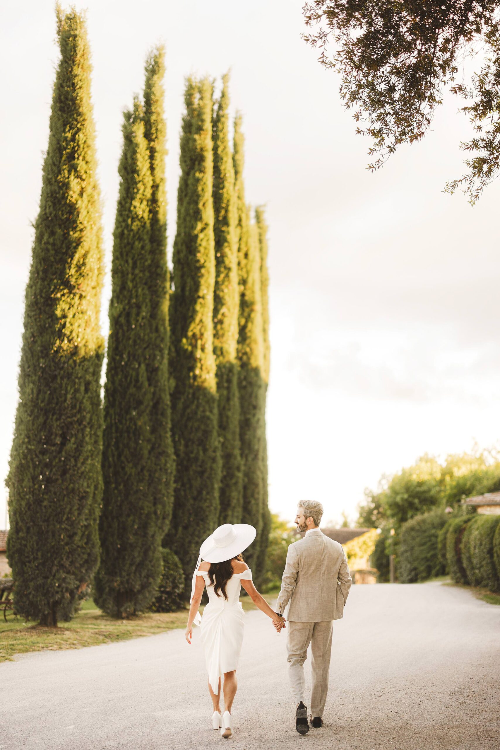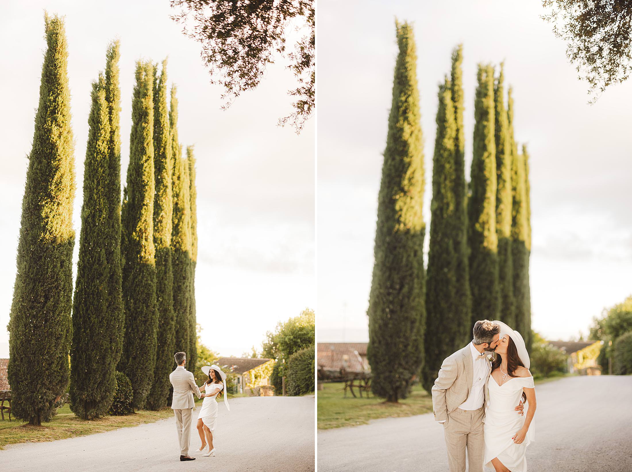 Elegant and romantic elopement wedding photos at evocative cypresses avenue of Borgo Pignano. Photo by the Italian elegant and creative elopement photographer in Tuscany Gabriele Fani