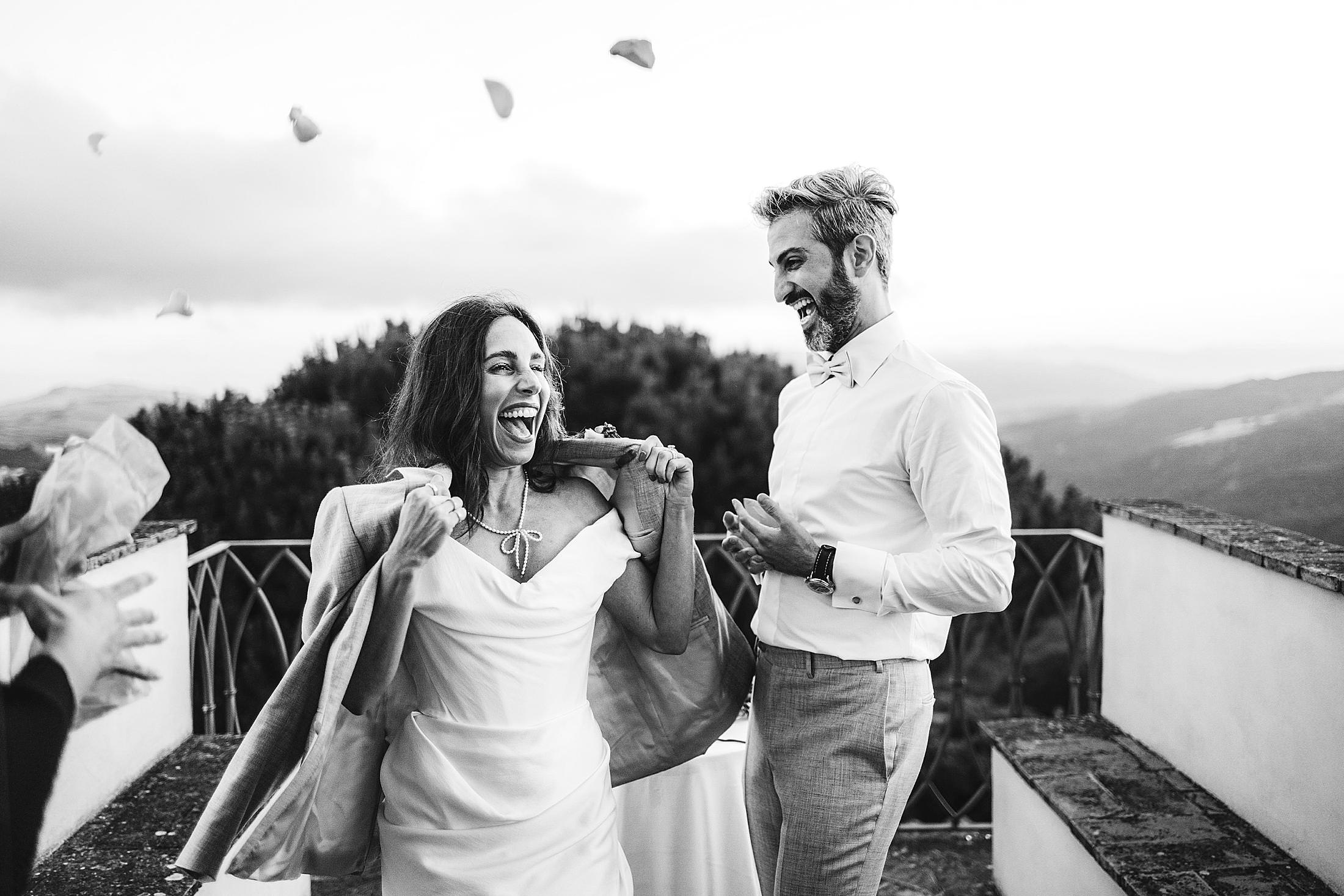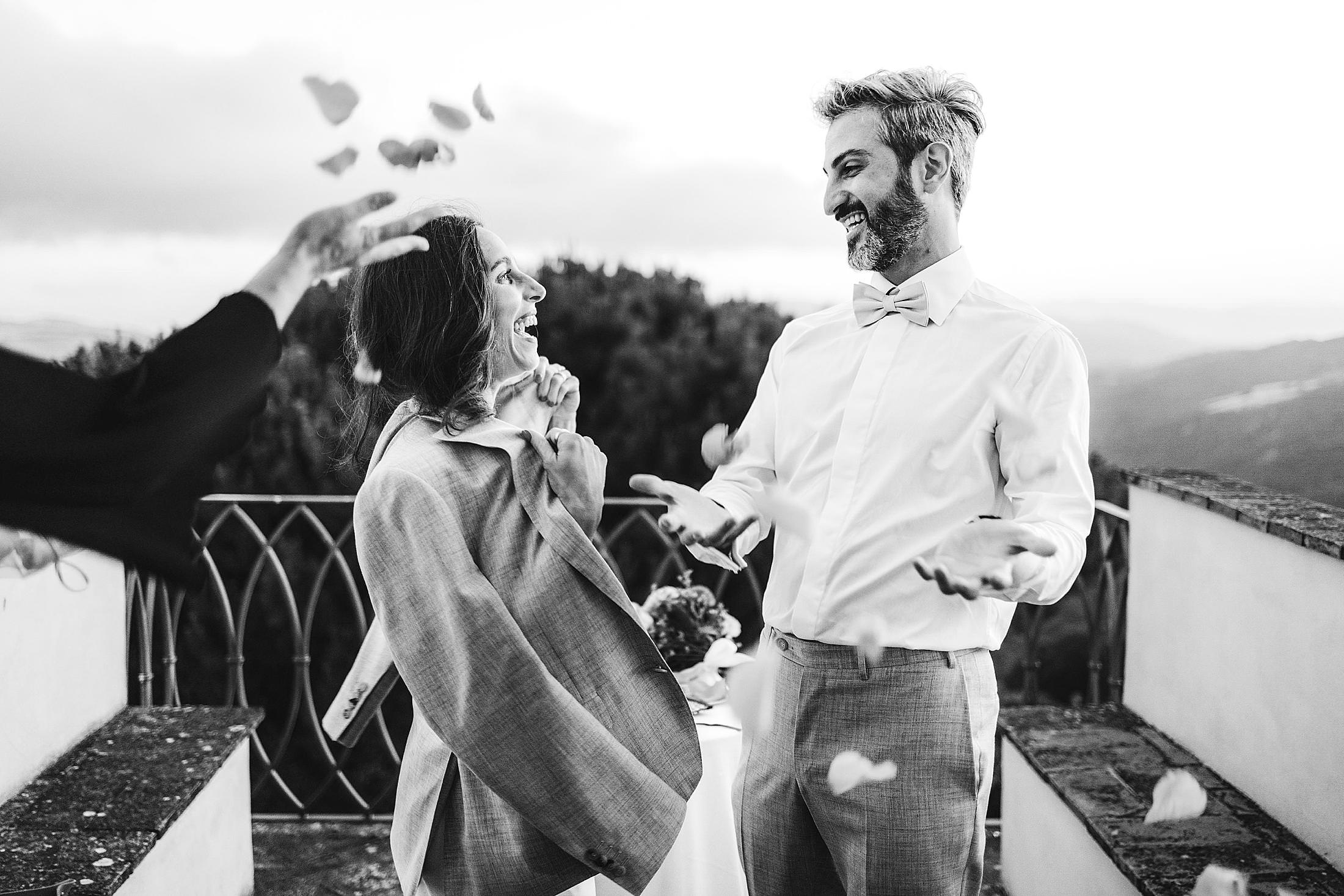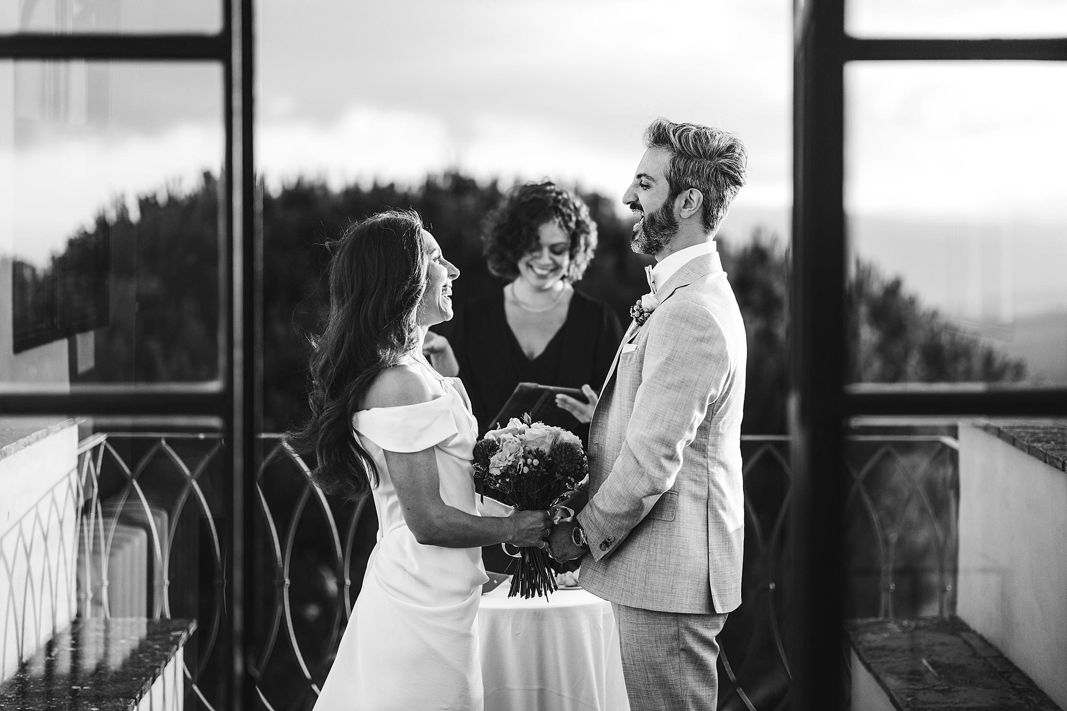 Exciting and joyful elopement symbolic ceremony at the top terrace of Borgo Pignano luxury venue in the heart of Chianti. Photo by the Italian elegant and creative elopement photographer in Tuscany Gabriele Fani