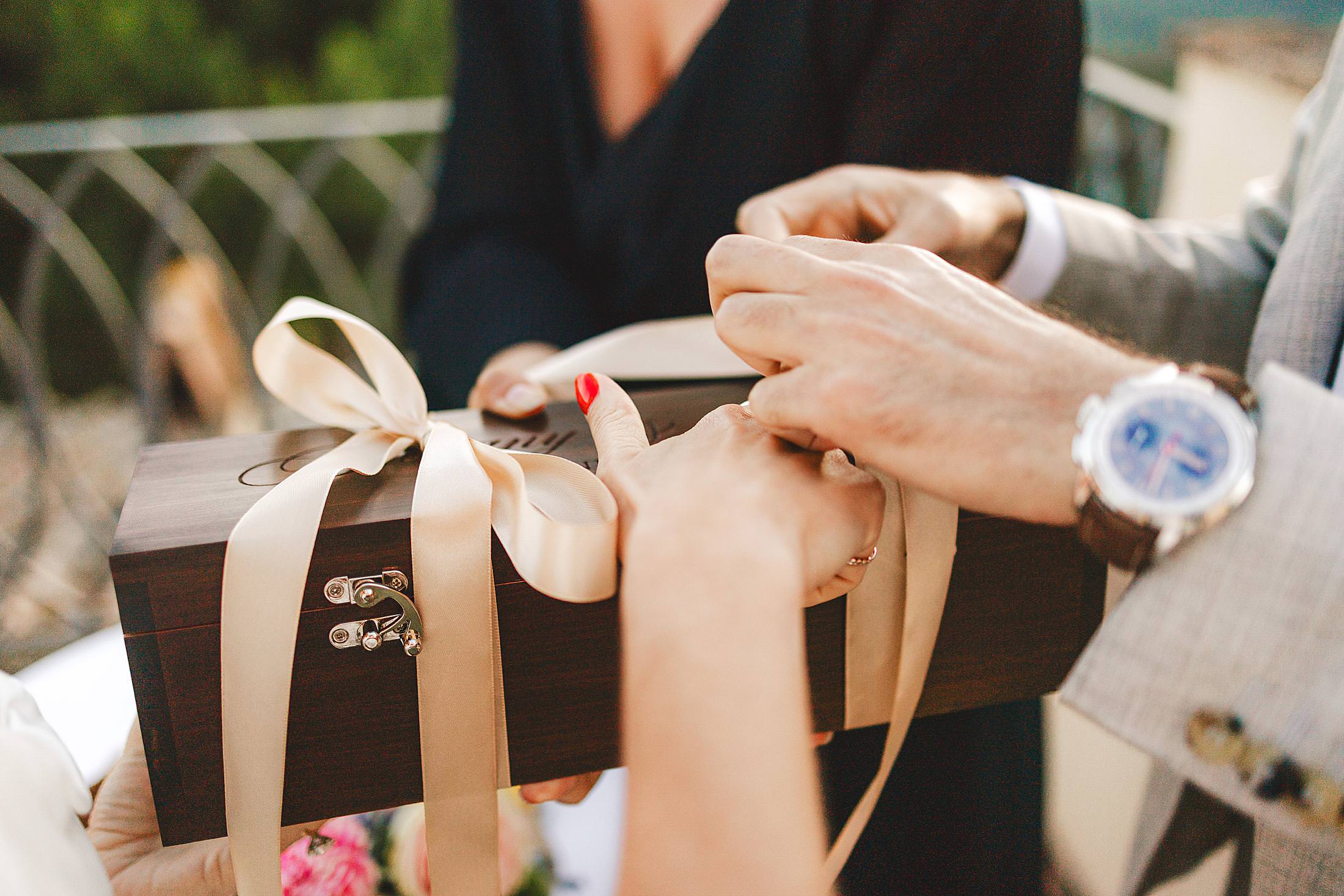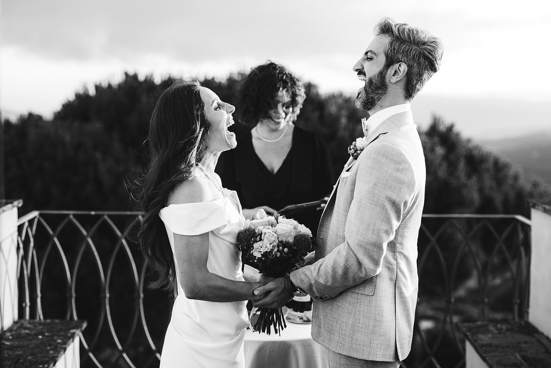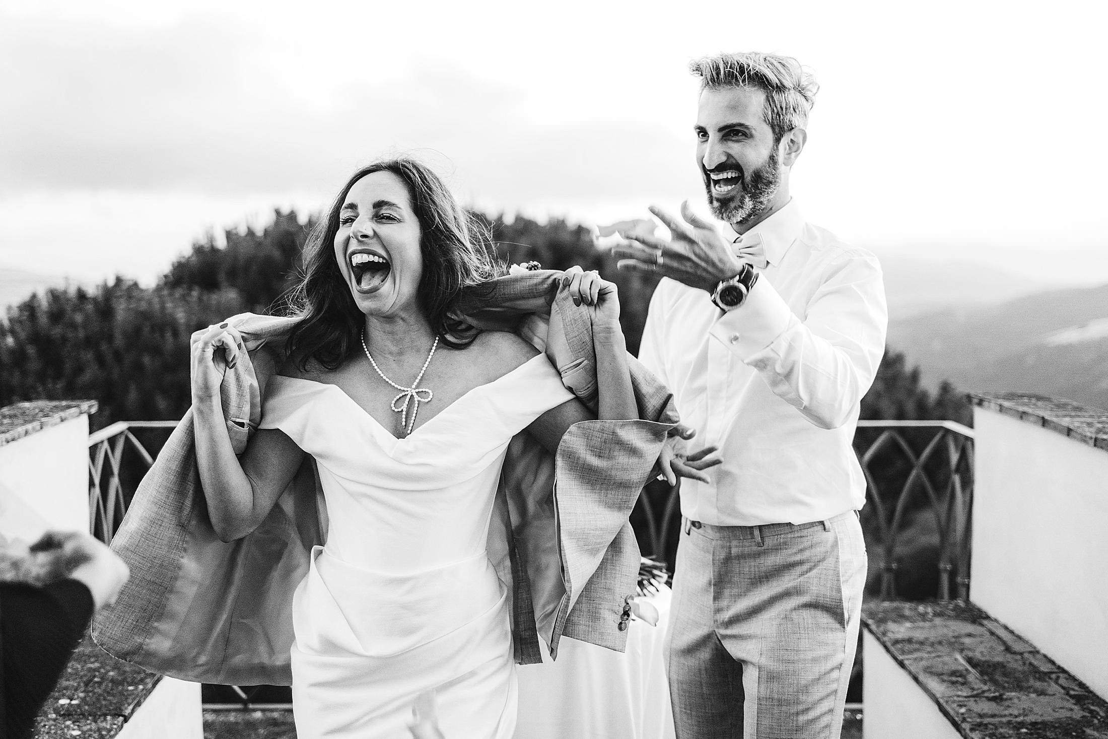 Exciting and joyful elopement symbolic ceremony at the top terrace of Borgo Pignano luxury venue in the heart of Chianti. Photo by the Italian elegant and creative elopement photographer in Tuscany Gabriele Fani