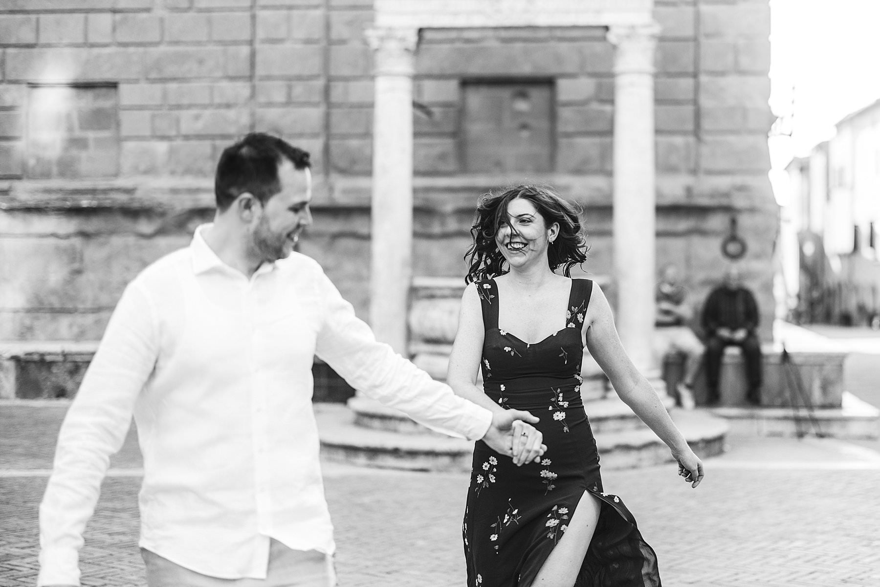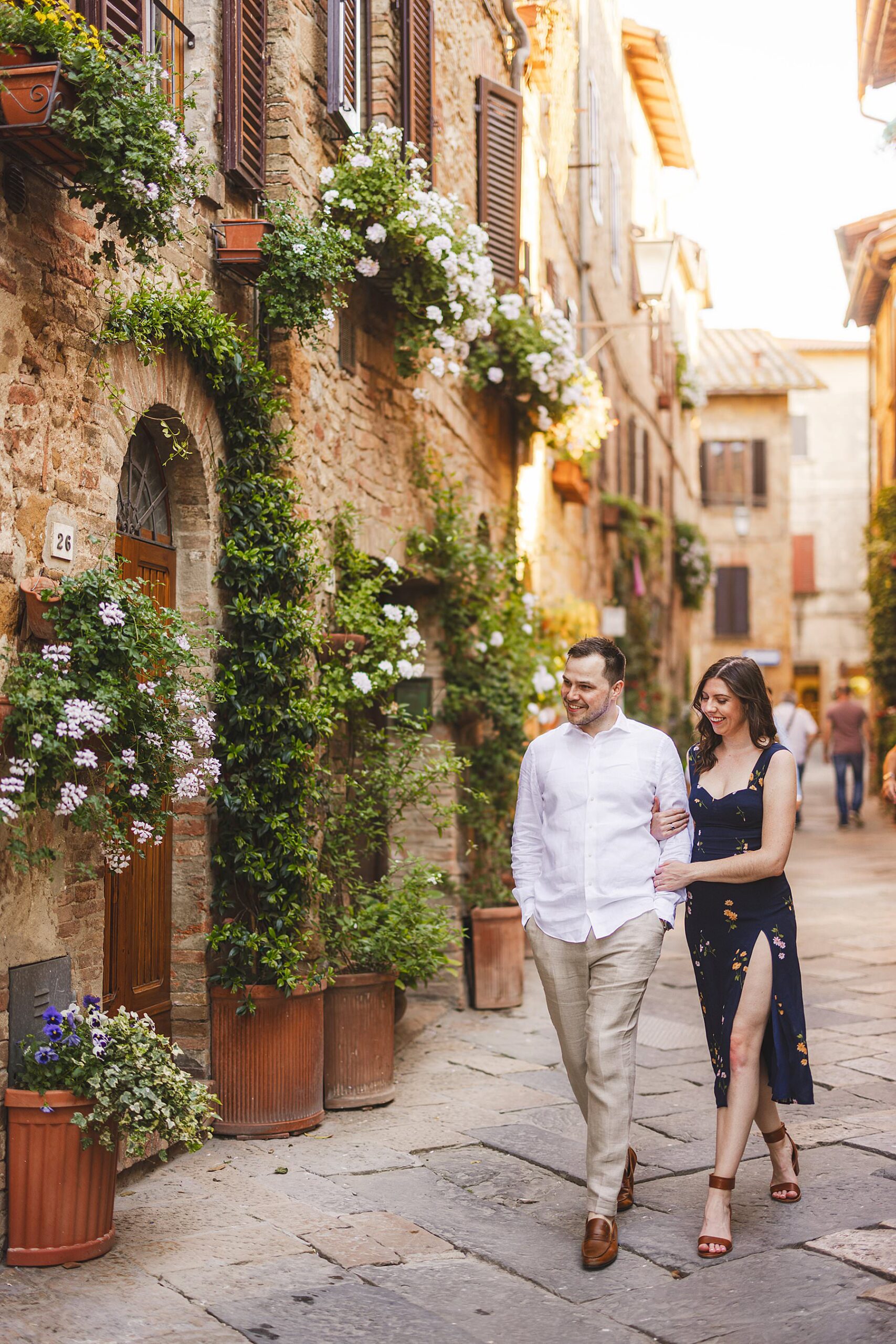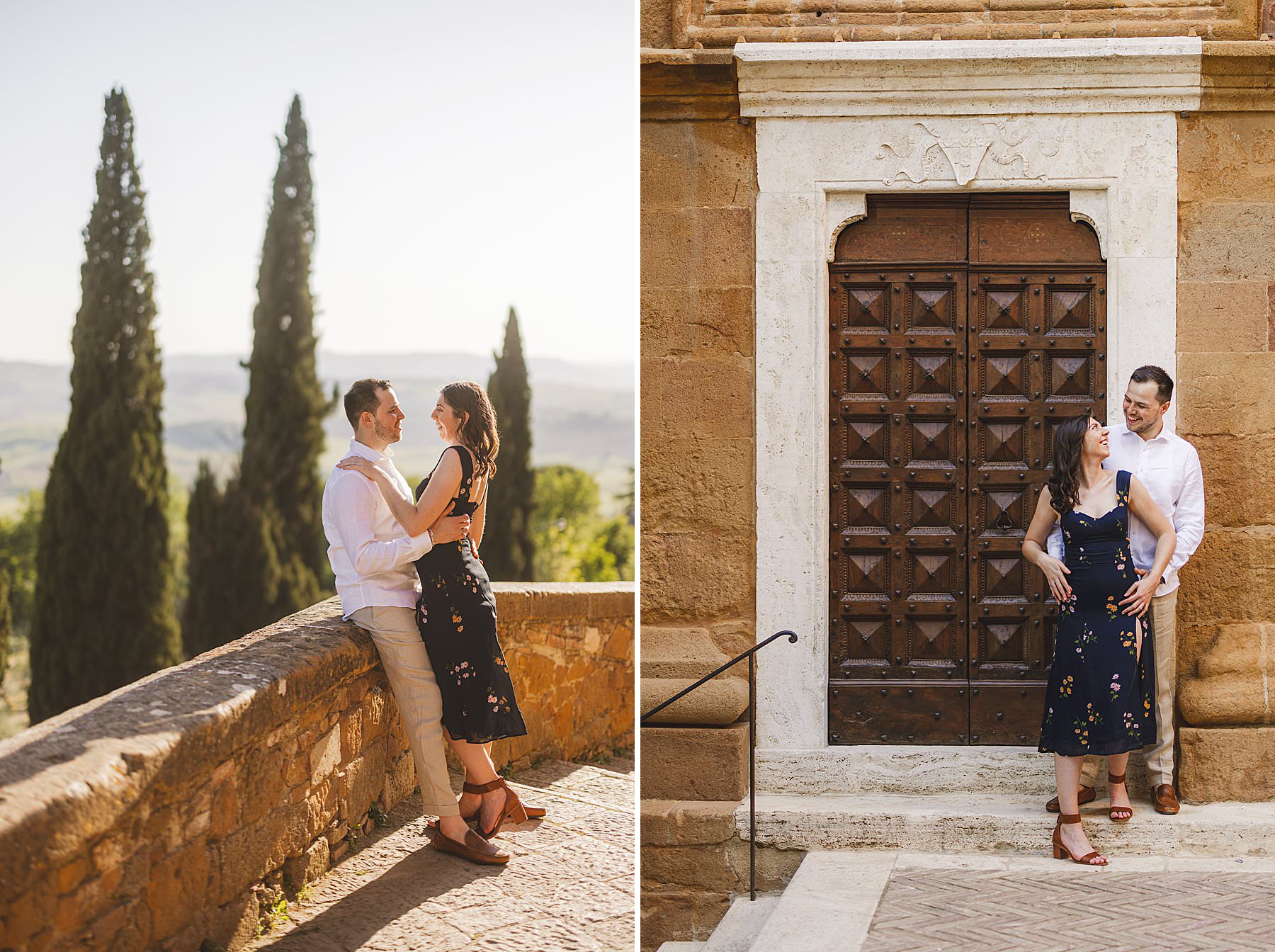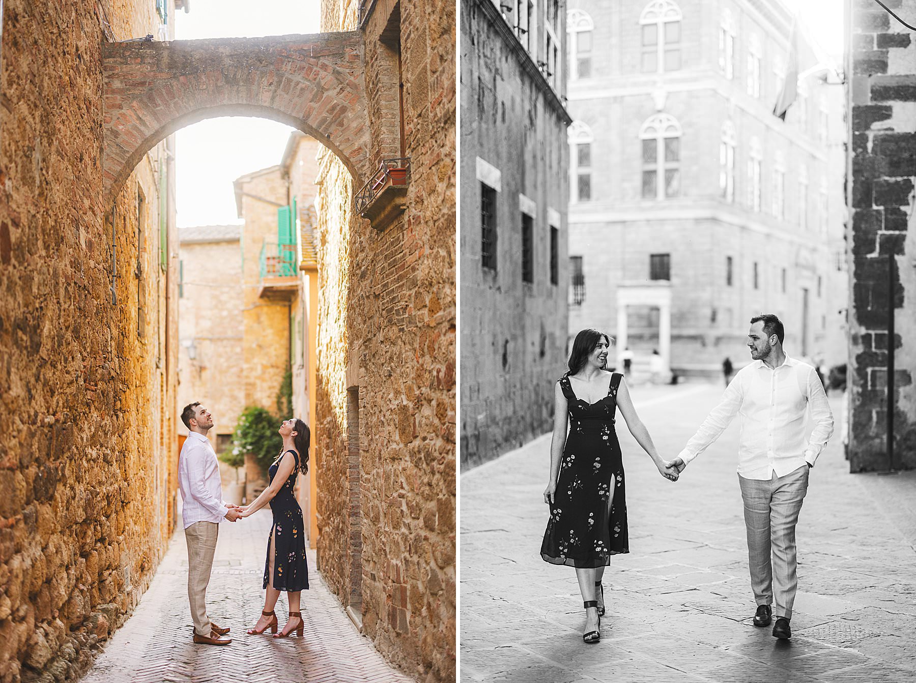 Romantic couple photo shoot in the heart of Pienza in Val d’Orcia, Tuscany. Photo by the Italian engagement photographer in Tuscany based Florence Gabriele Fani