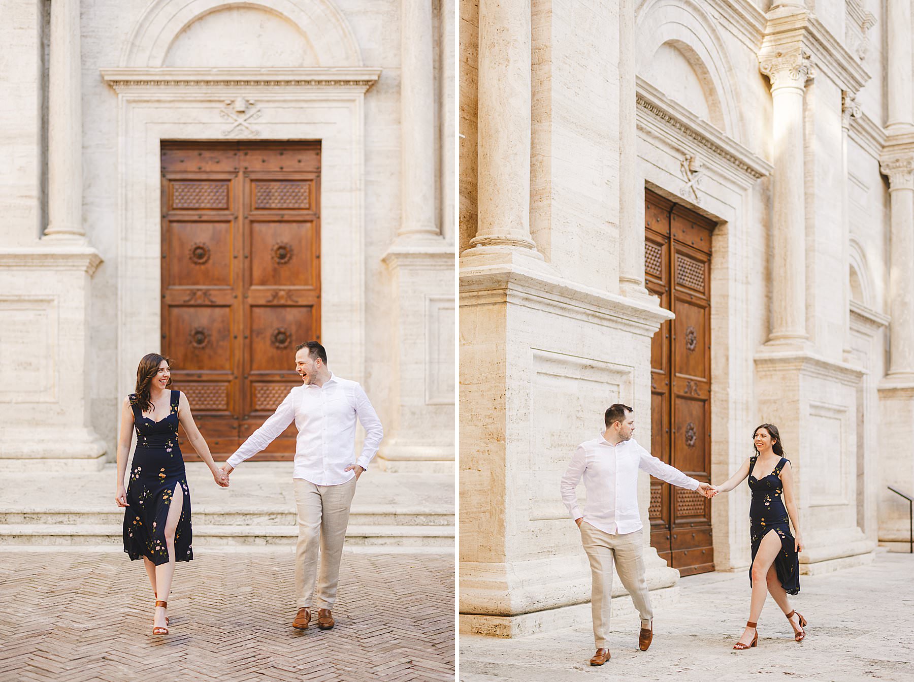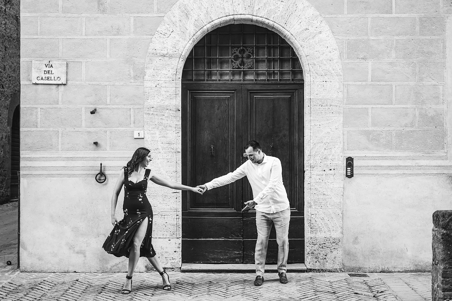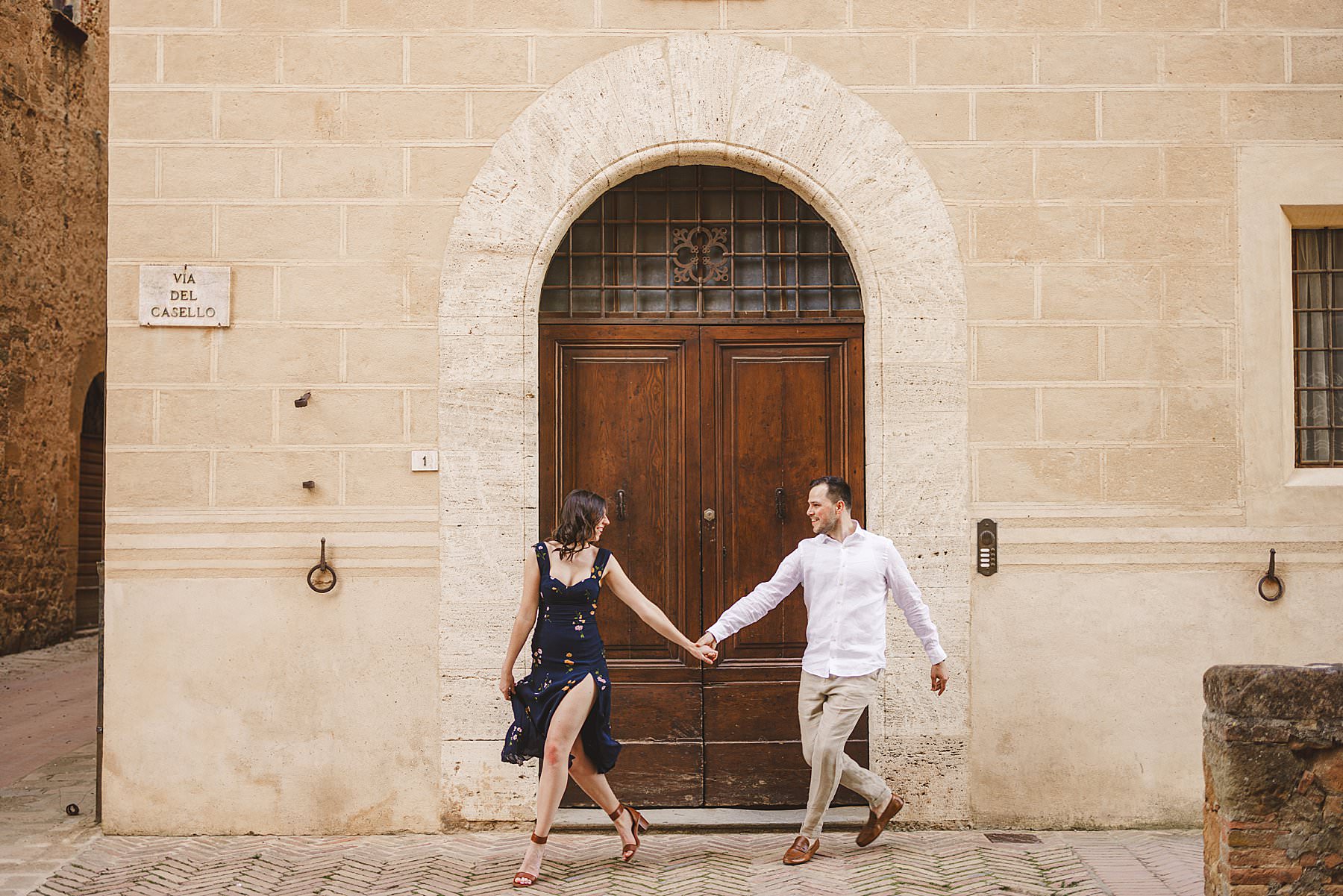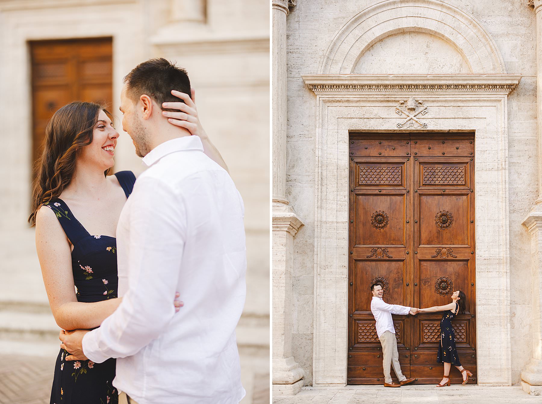 Romantic couple photo shoot in the heart of Pienza in Val d’Orcia, Tuscany. Photo by the Italian engagement photographer in Tuscany based Florence Gabriele Fani