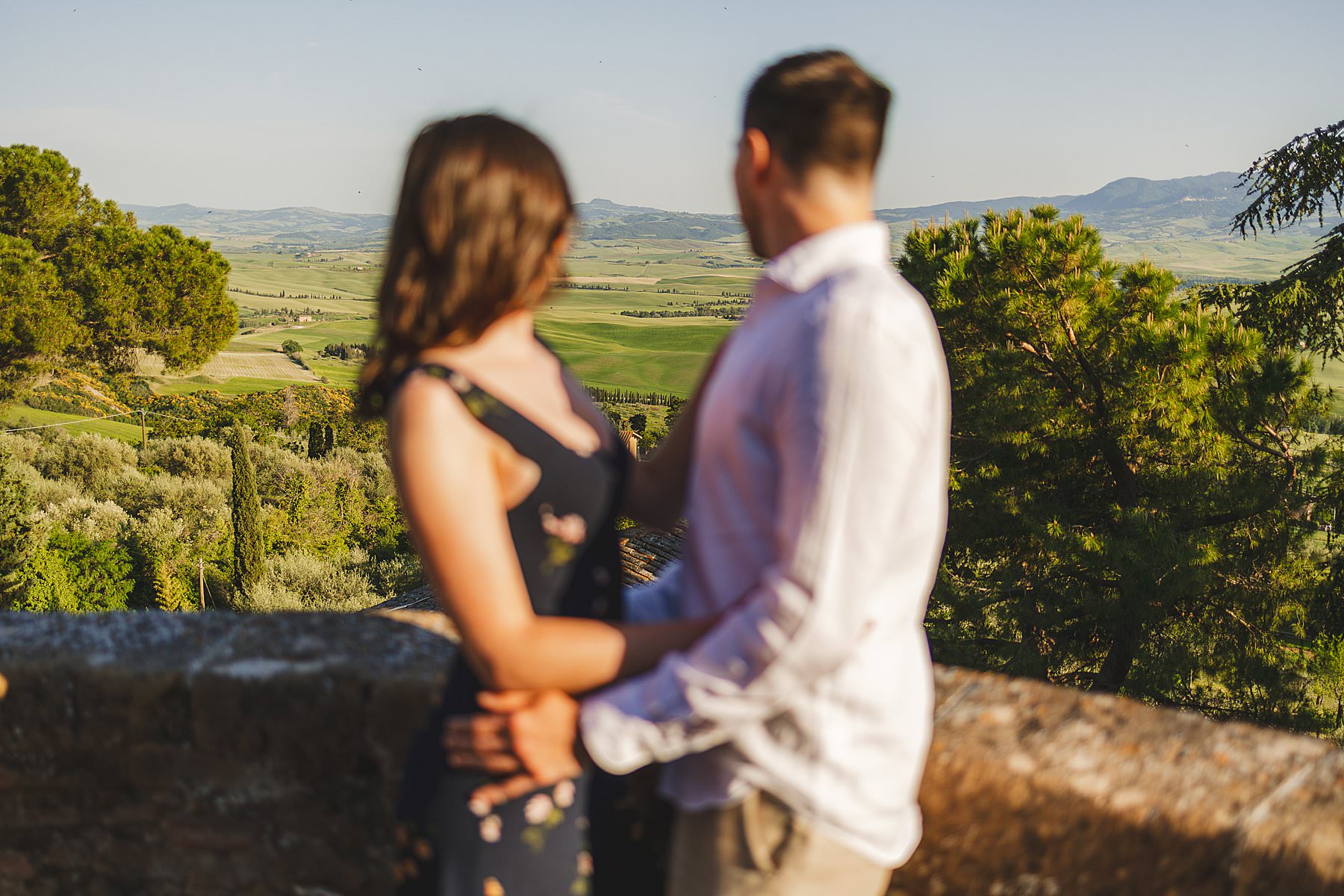 We started the session in Pienza, a charming village and UNESCO World Heritage Site, the “Ideal City” which was built following the principles and philosophy of the Renaissance. Those moments gave us the chance to break the ice and get to know each other, with some first elegant shots full of smiles and love gestures taken among the wooden gates and exposed-bricks walls of the town. After that, it was time for the actual sunset engagement photos…