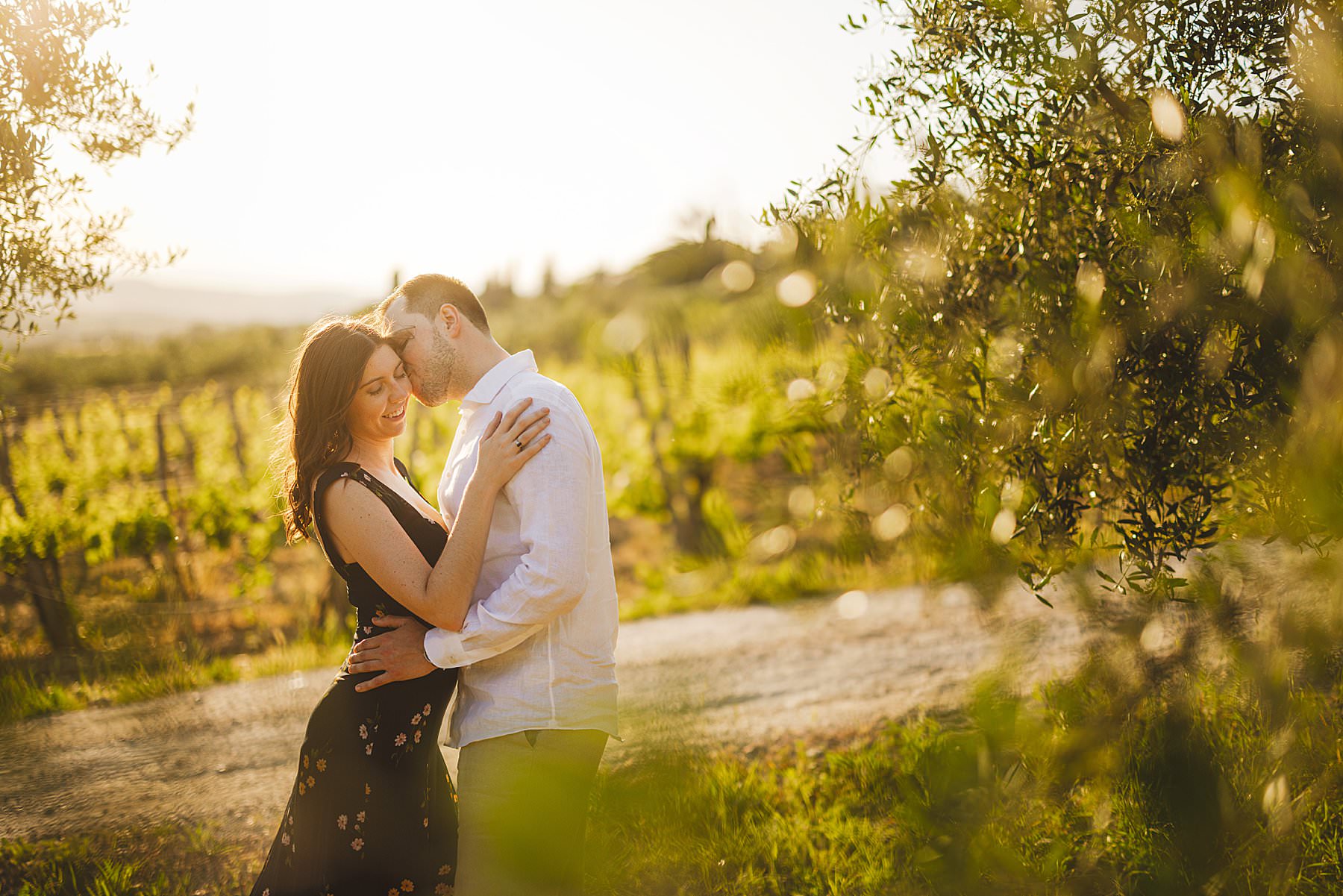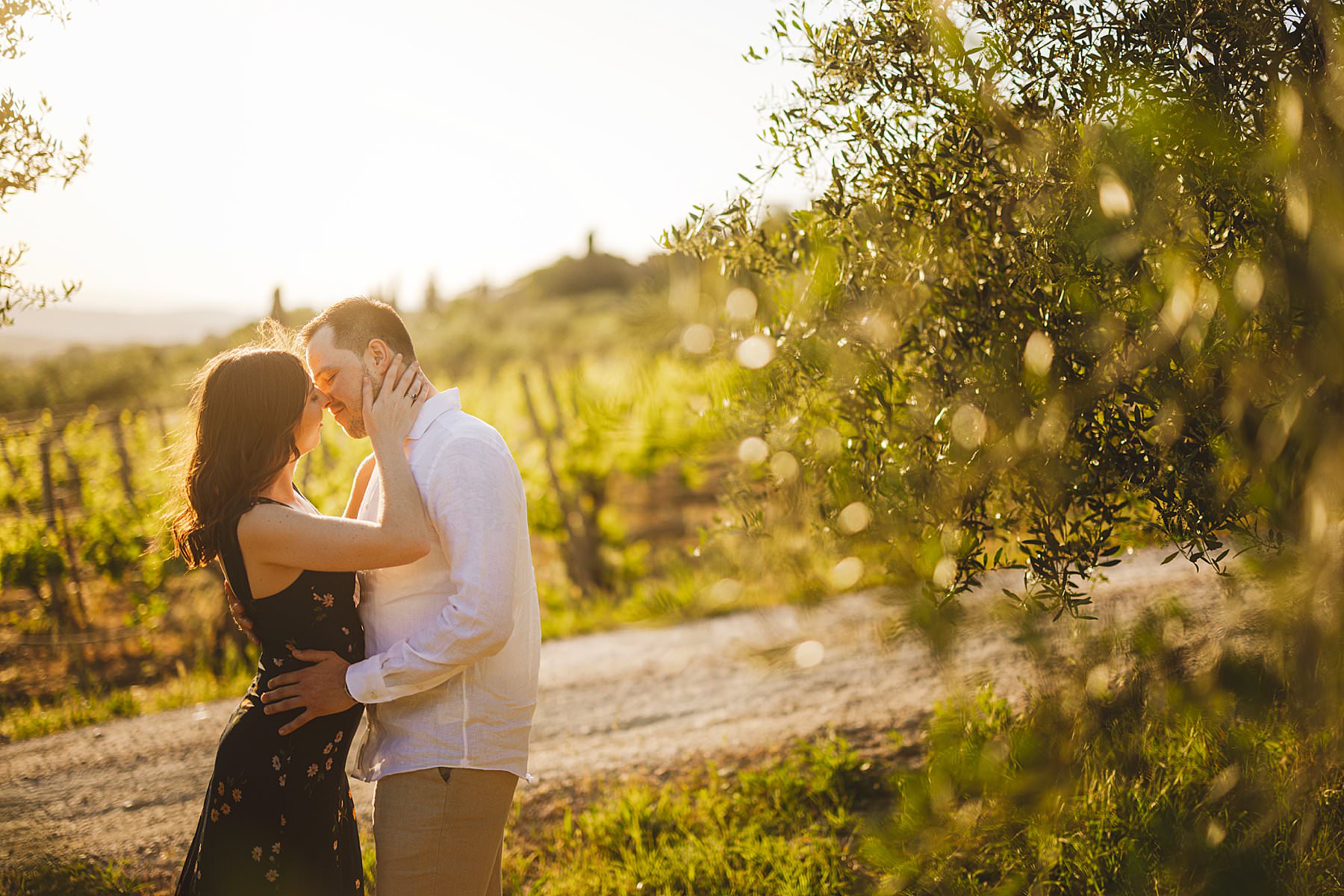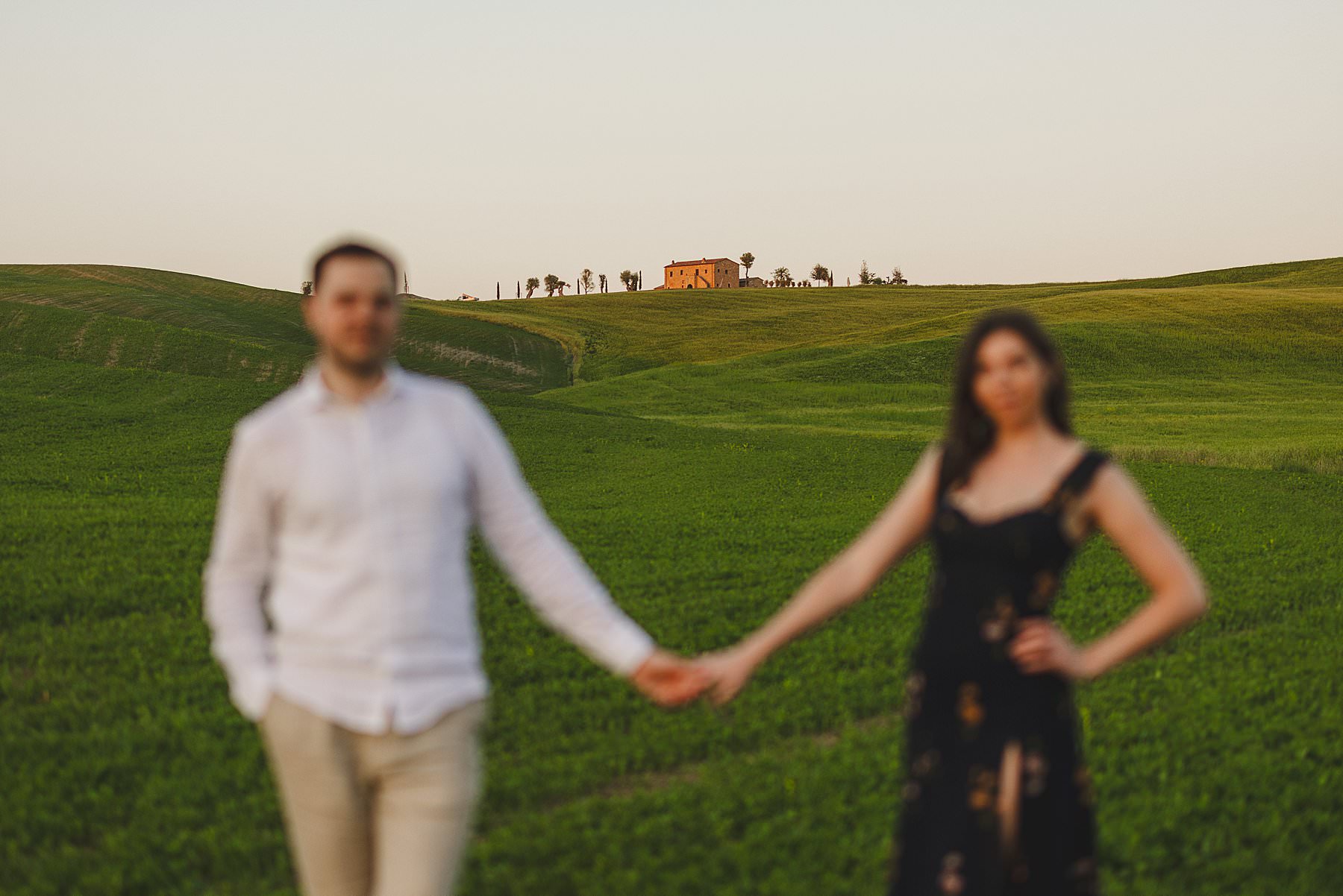 Romantic couple photo shoot in the countryside of Tuscany near Pienza during golden hour. Photo by the Italian engagement photographer in Tuscany based Florence Gabriele Fani