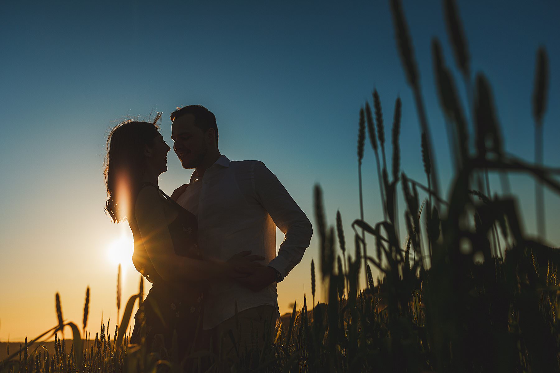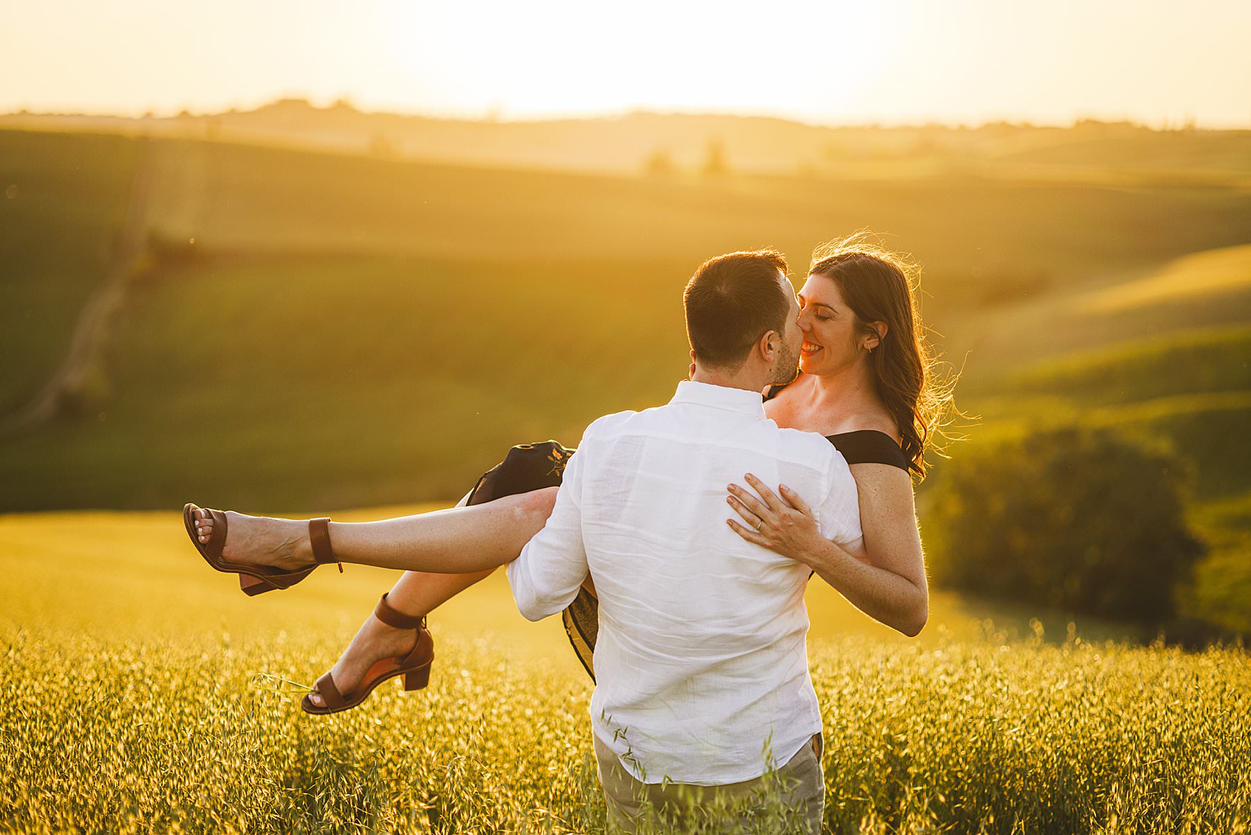 Pre wedding couple shoot in the evocative golden hour of the countryside of Tuscany Val d’Orcia near Pienza. Photo by the Italian engagement photographer in Tuscany based Florence Gabriele Fani