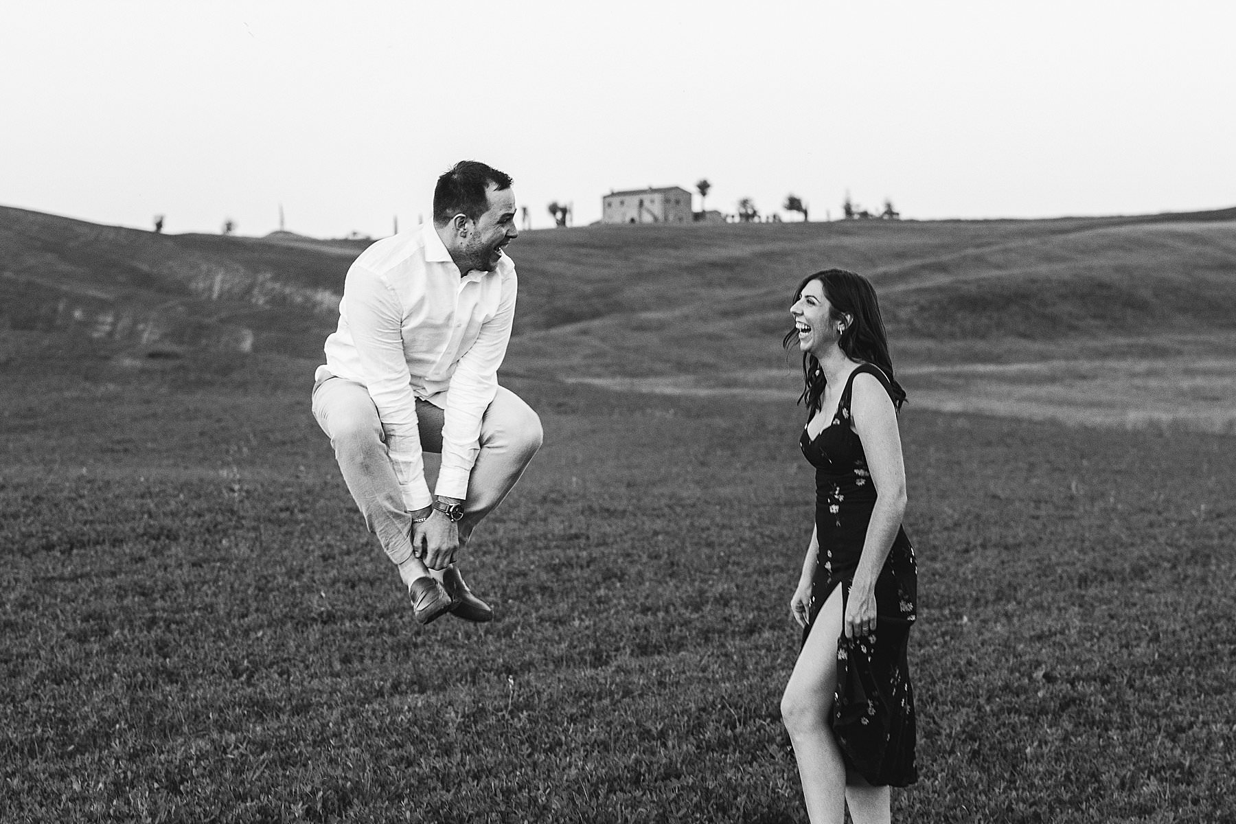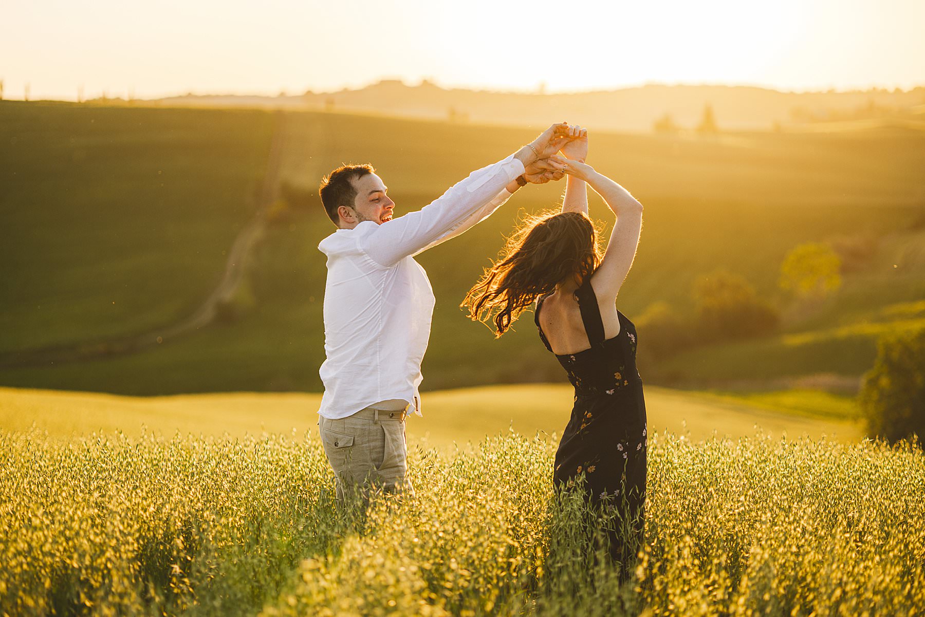 Sunset exciting engagement photos in the countryside of Pienza during golden hour. Photo by the Italian engagement photographer in Tuscany based Florence Gabriele Fani