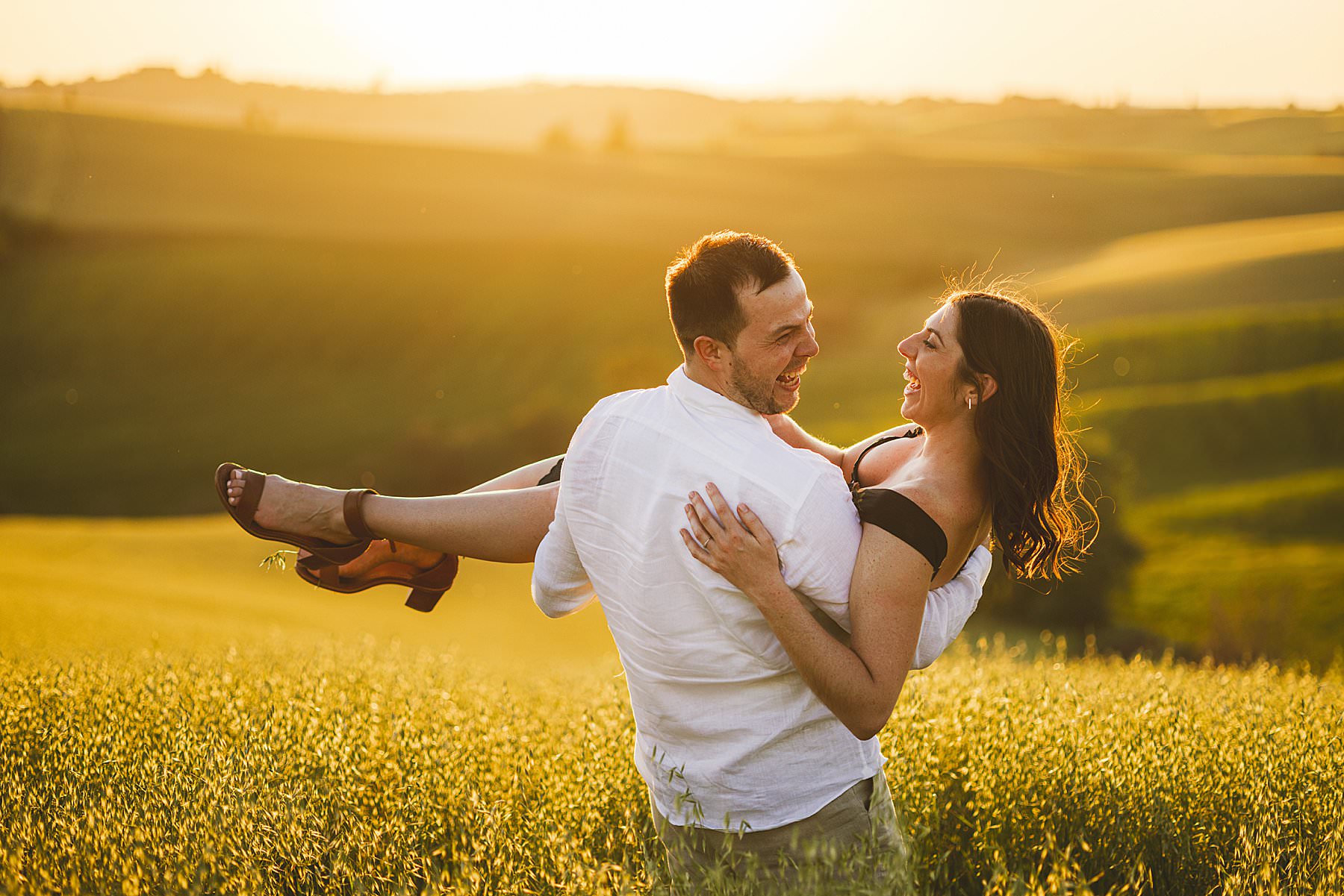 Vanessa and Florian are two positive souls, originally from the U.S.A. but living in Germany for work. They chose Tuscany and the picturesque Val d’Orcia as a destination for their holiday, and they wanted to keep a special memory of it. That’s why they contacted me, to shoot their sunset engagement photos in the countryside. Why at sunset? Because the light of the golden hour makes everything glow, and the magic multiplies – as you can see yourself from the gallery.