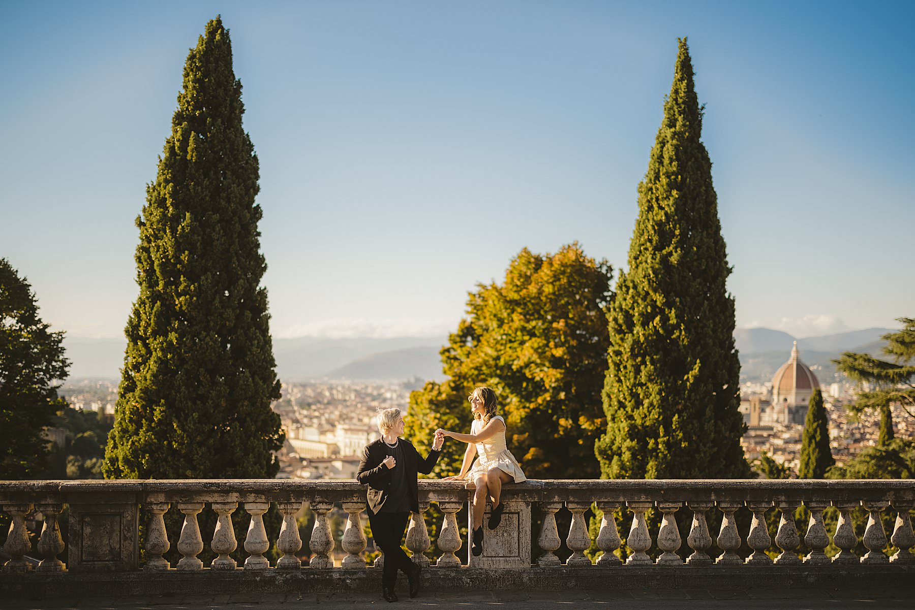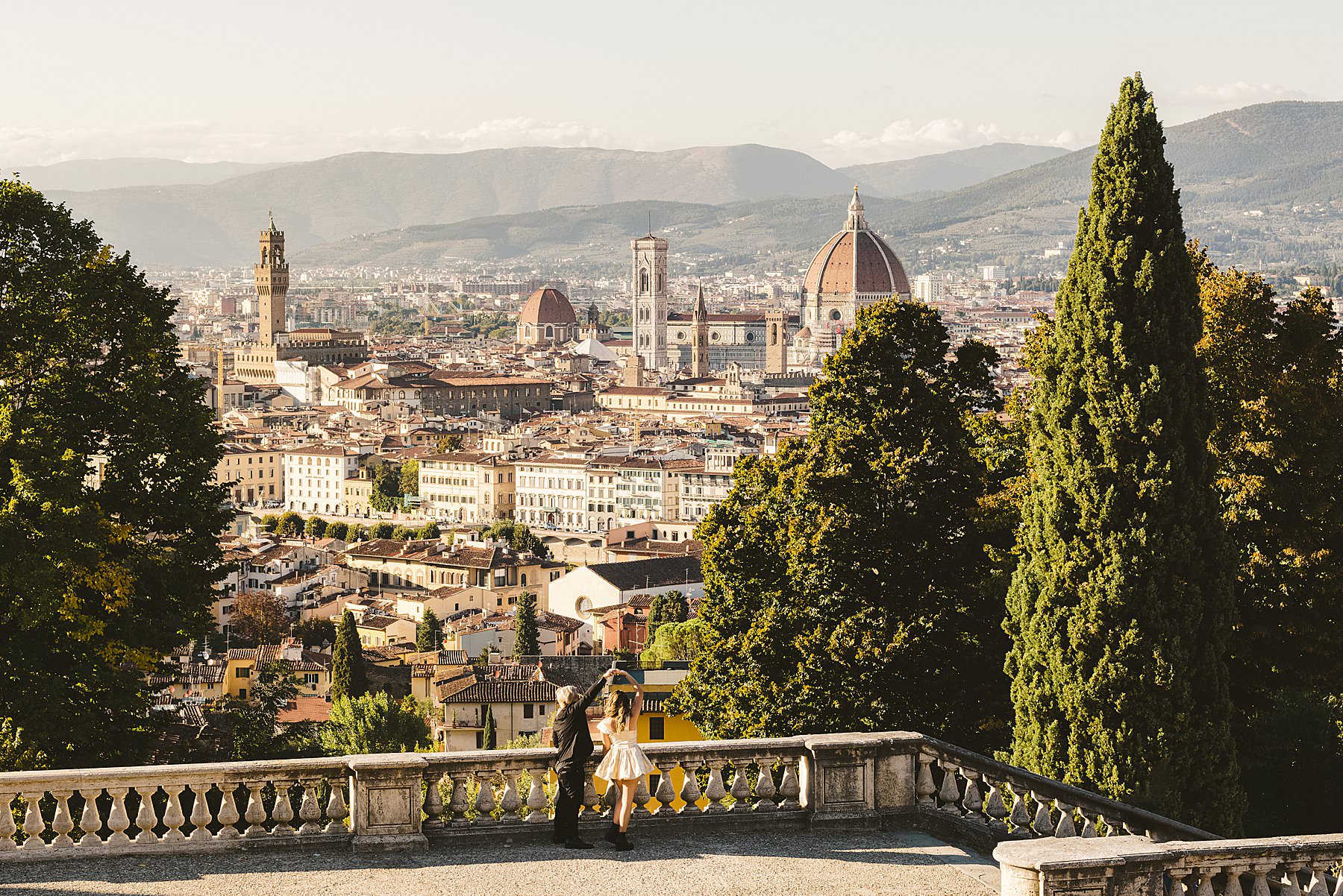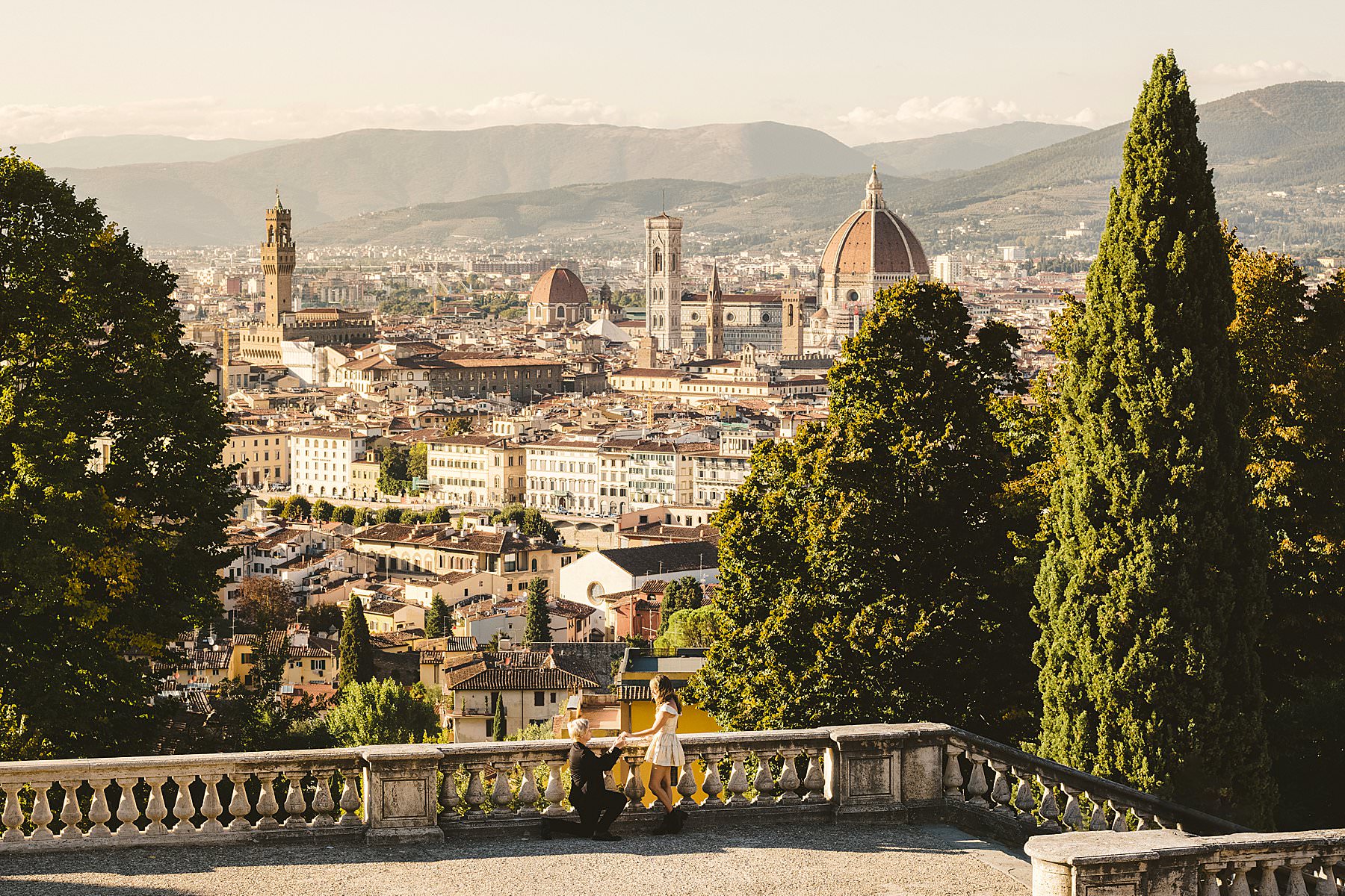 Best iconic panoramic photographic spot in Florence for real surprise proposal photo shoot. Photo by the Italian elegant creative and modern proposal photographer in Tuscany based Florence, Italy