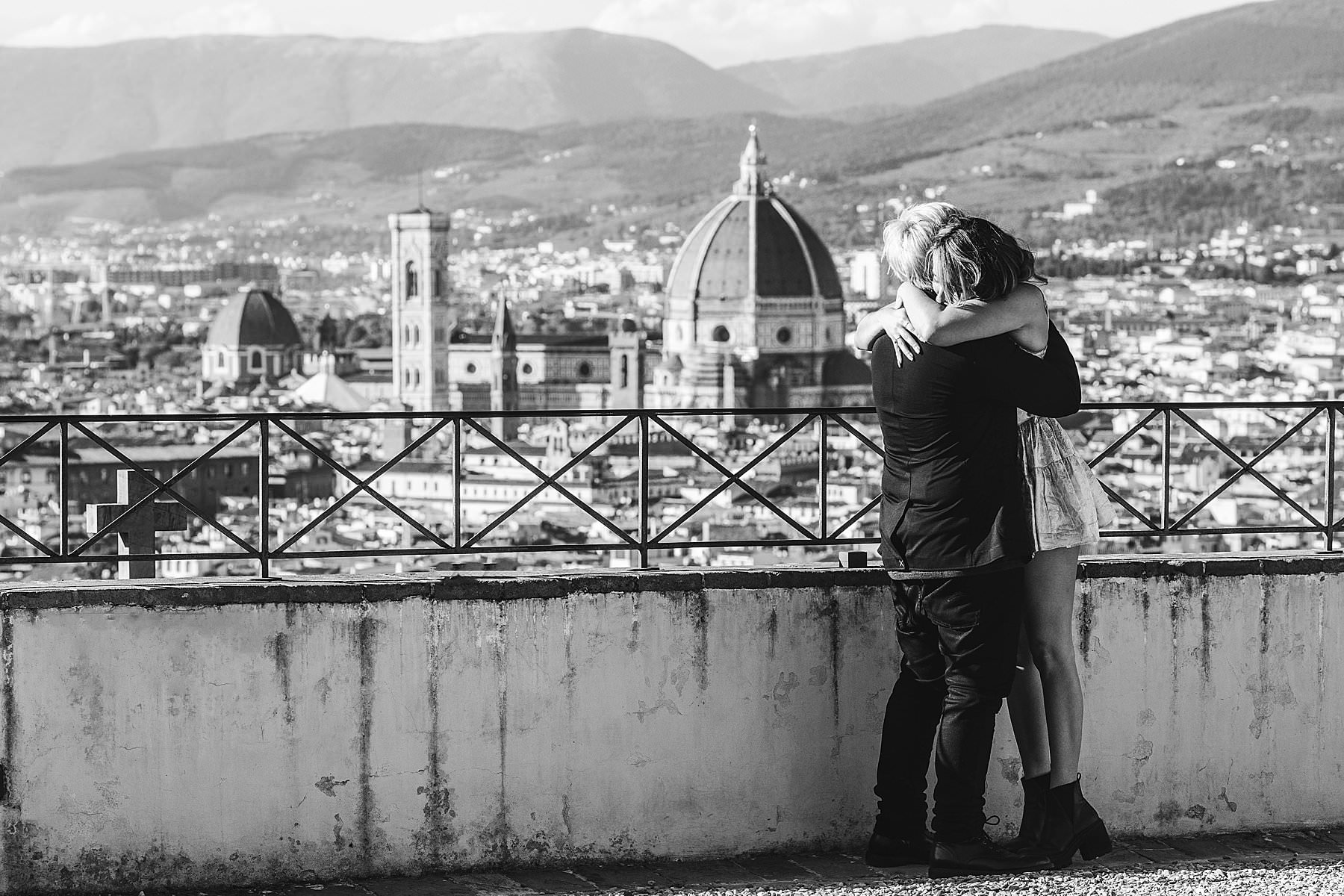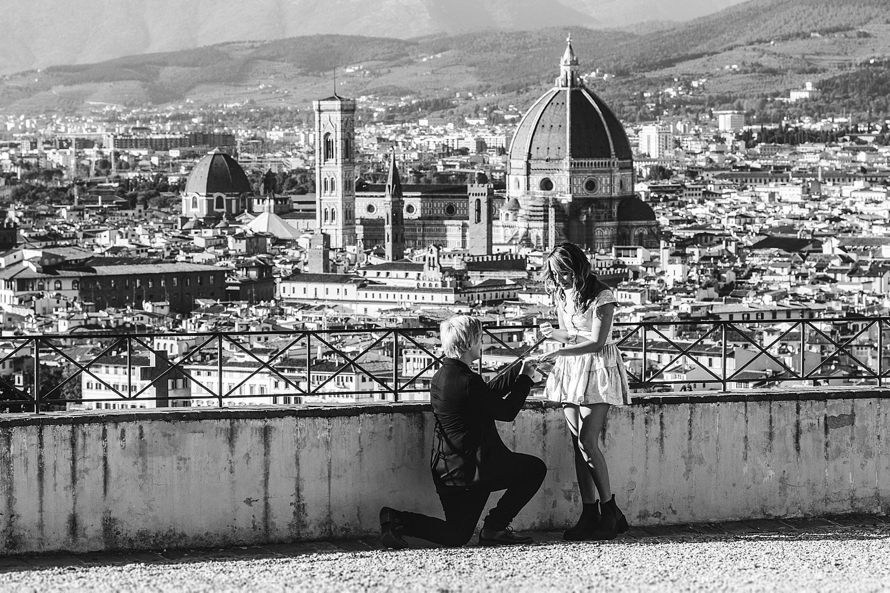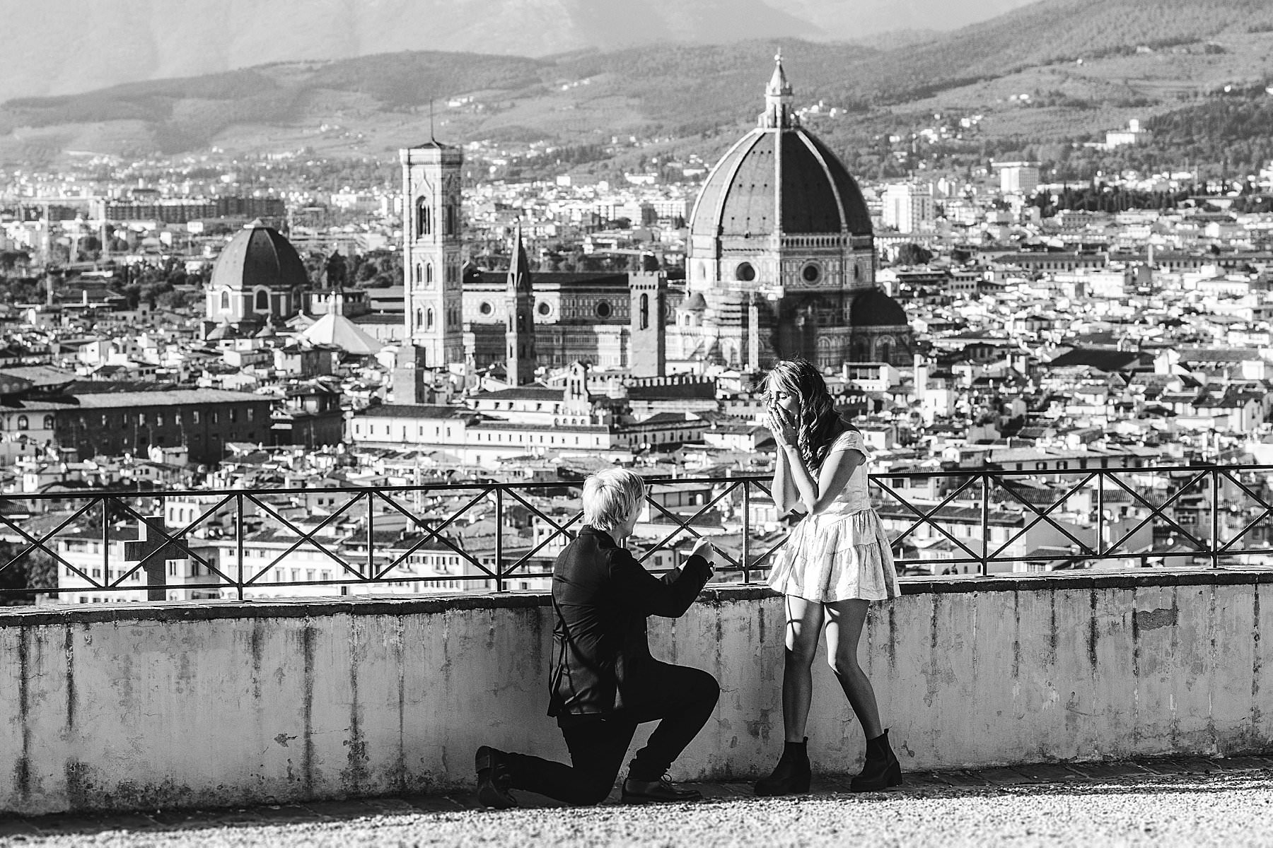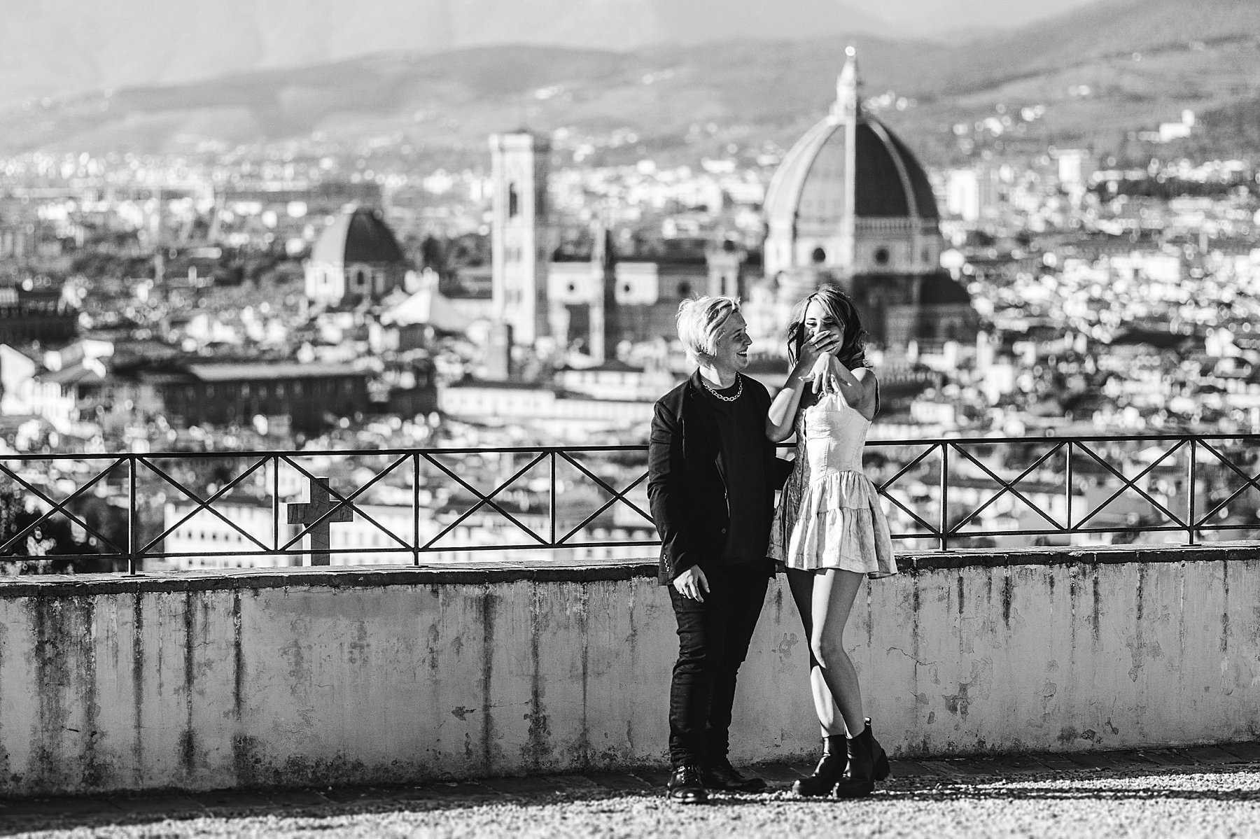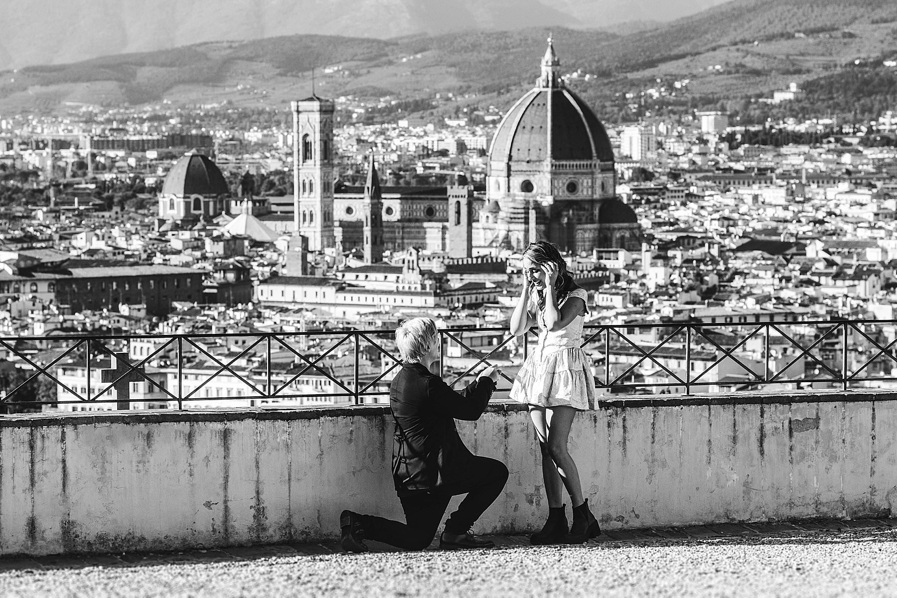 Brady, a young man from California, was looking for a photographer for his proposal in Florence. He wanted to surprise his girlfriend Susy kneeling in front of the best view of the city and of its Cathedral, for a guaranteed wow-factor.