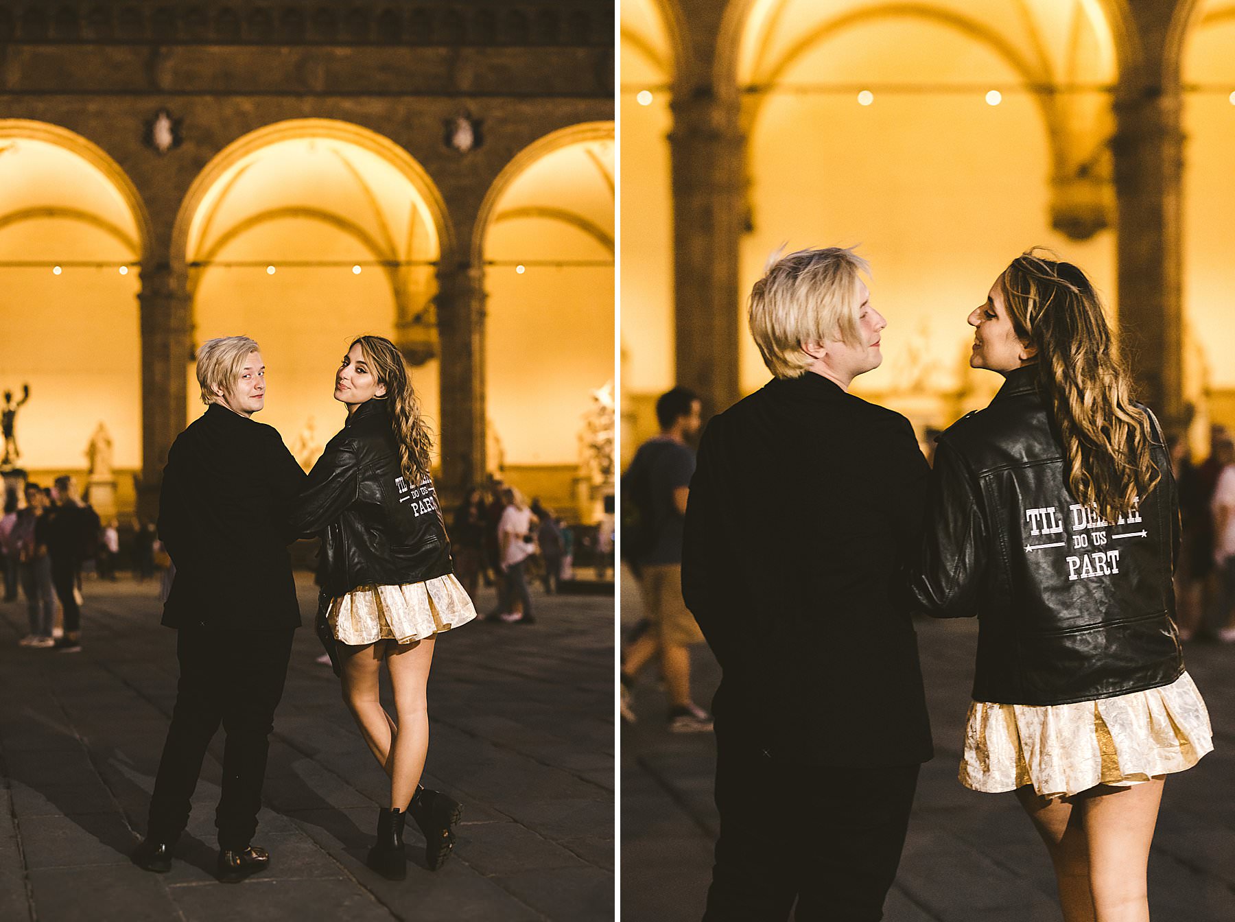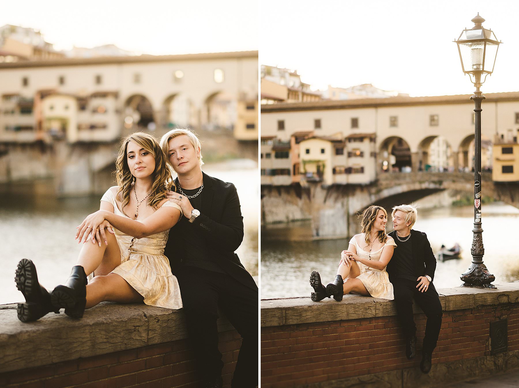 After the proposal itself, it was time for the surprise engagement photos: we started where we were, overlooking the beautiful Florence, for one hour of photo and video shooting. Then we moved to the heart of the city to continue the session in the locations desired by the couple, including the Uffizi Gallery, Ponte Vecchio, and Palazzo Vecchio. We took the last engagement photos after sunset: an extremely romantic conclusion of a special day.