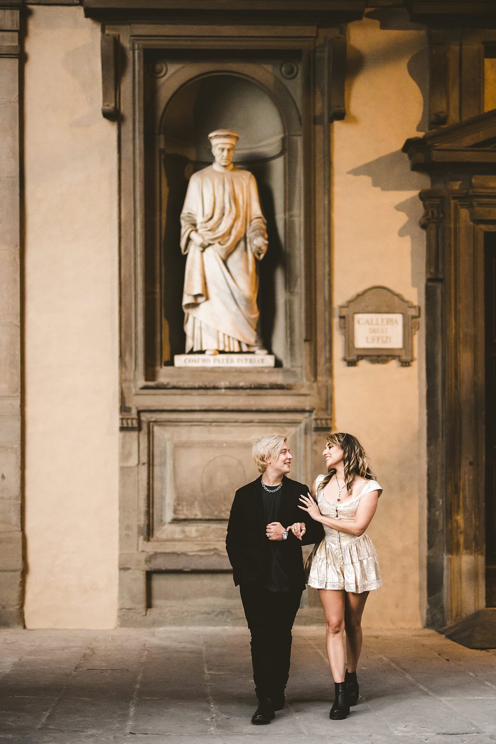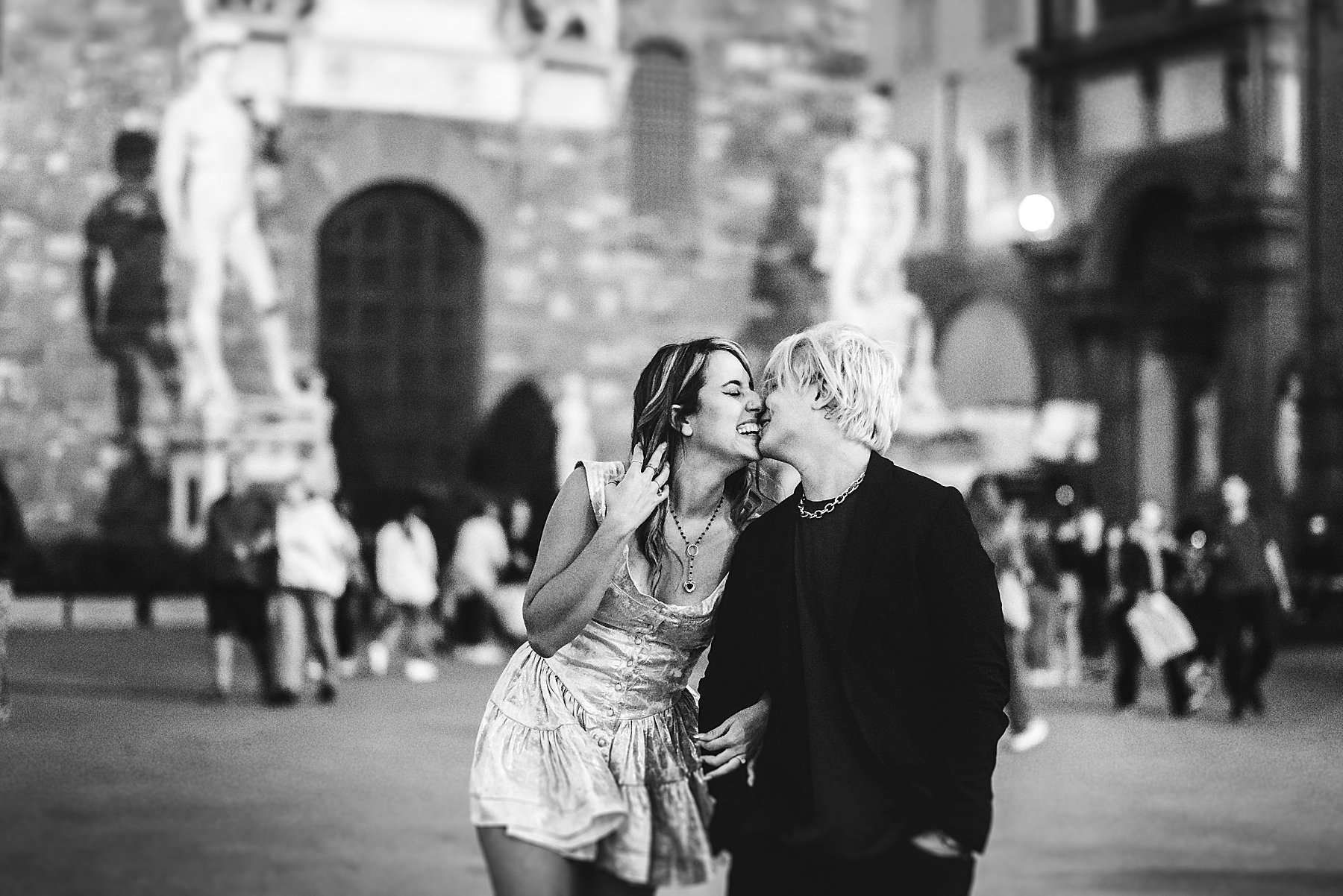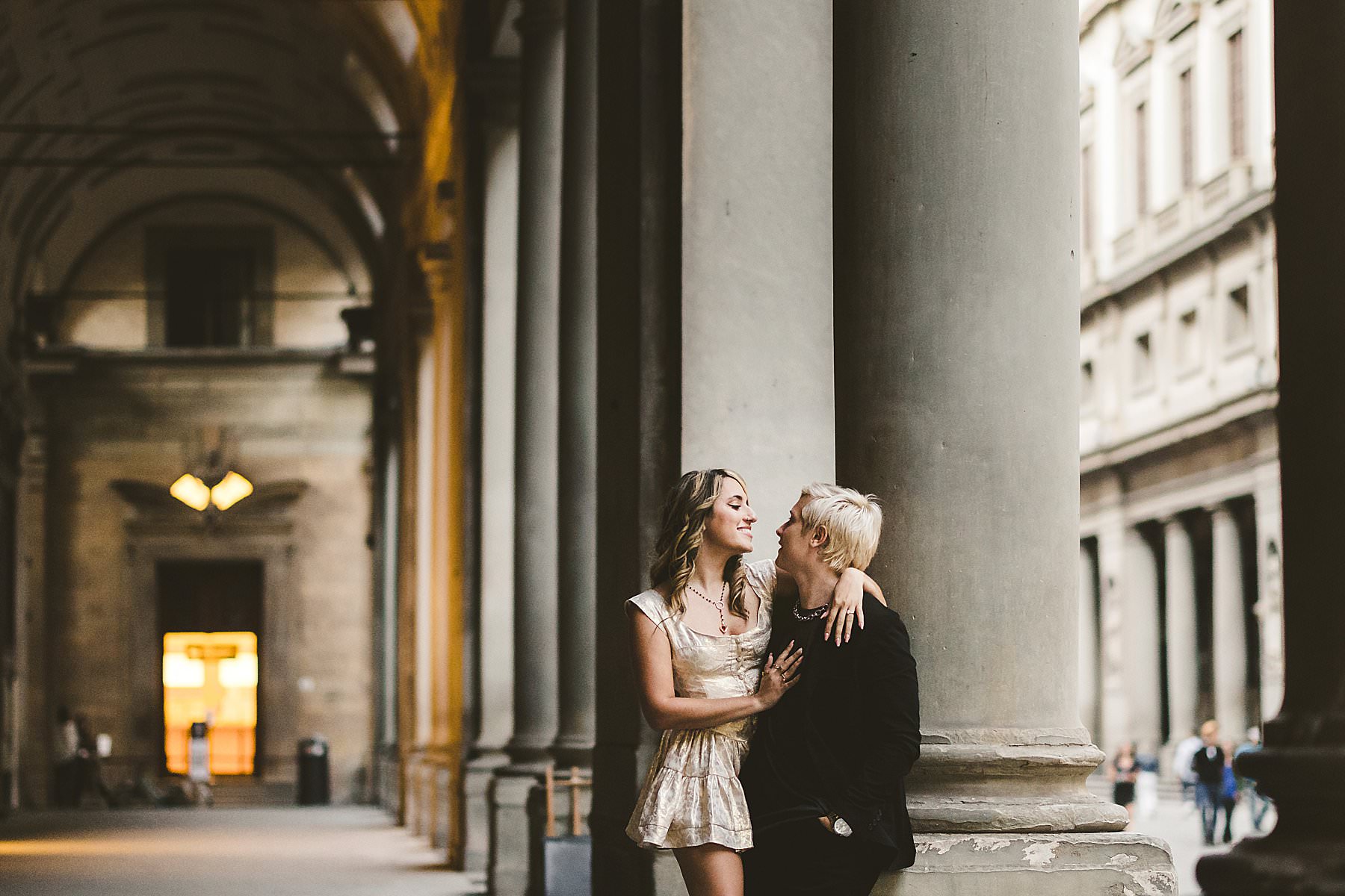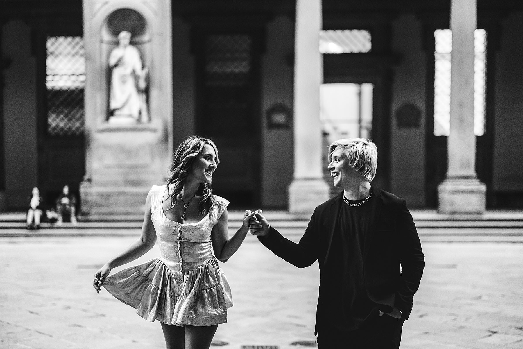 Sweet and fun couple portrait photo shoot in the historical center of Florence, Italy near Palazzo Vecchio and Uffizi Museum. Photo by the Italian elegant creative and modern proposal photographer in Tuscany based Florence, Italy
