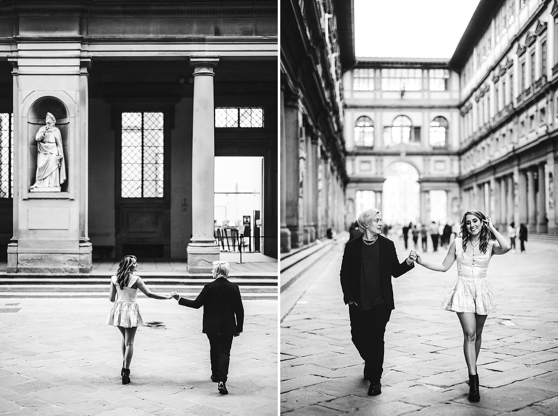 Unforgettable surprise proposal photo shoot with audio and video recording in Florence streets near Uffizi Art Gallery Museum, Italy. Photo by the Italian elegant creative and modern proposal photographer in Tuscany based Florence, Italy