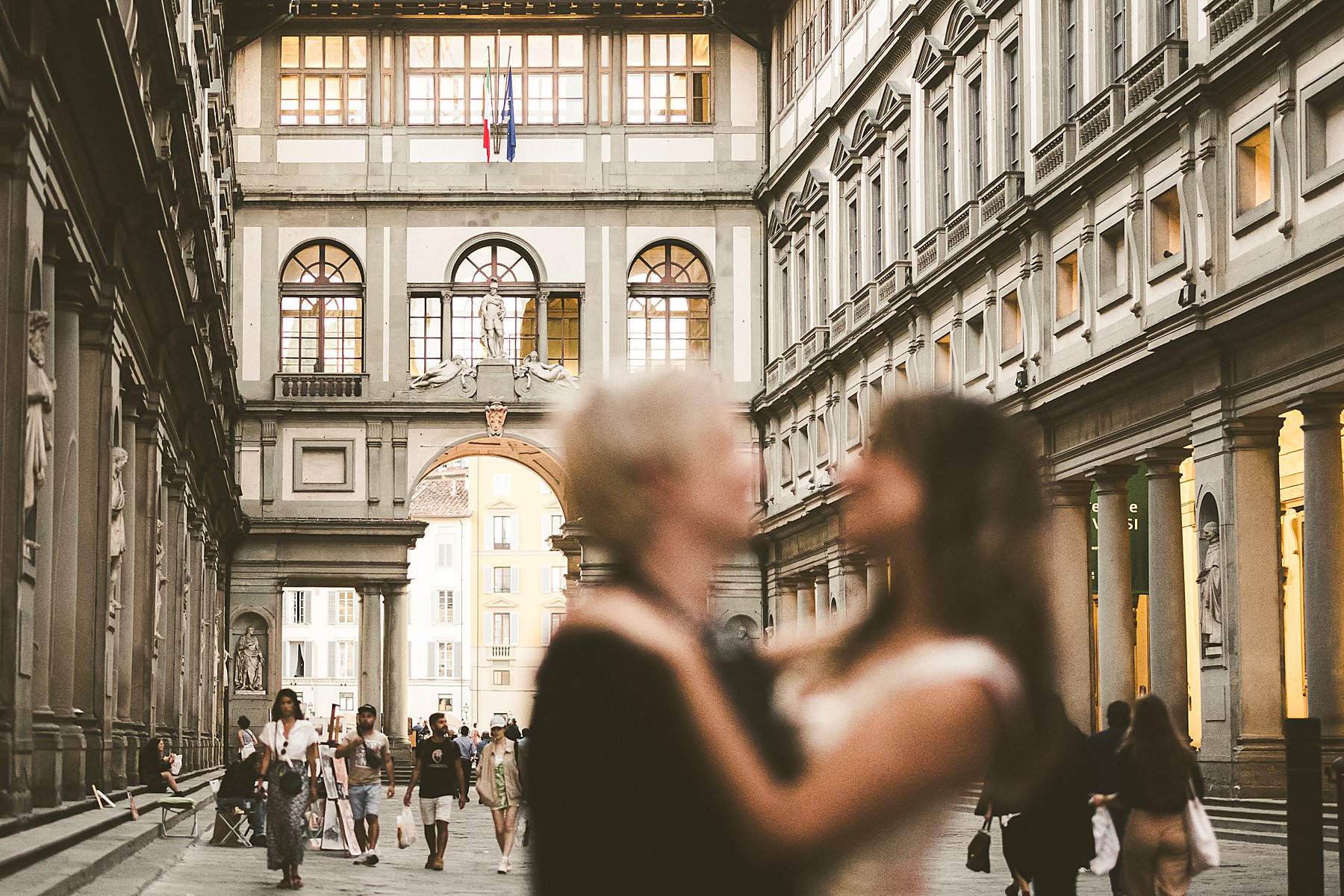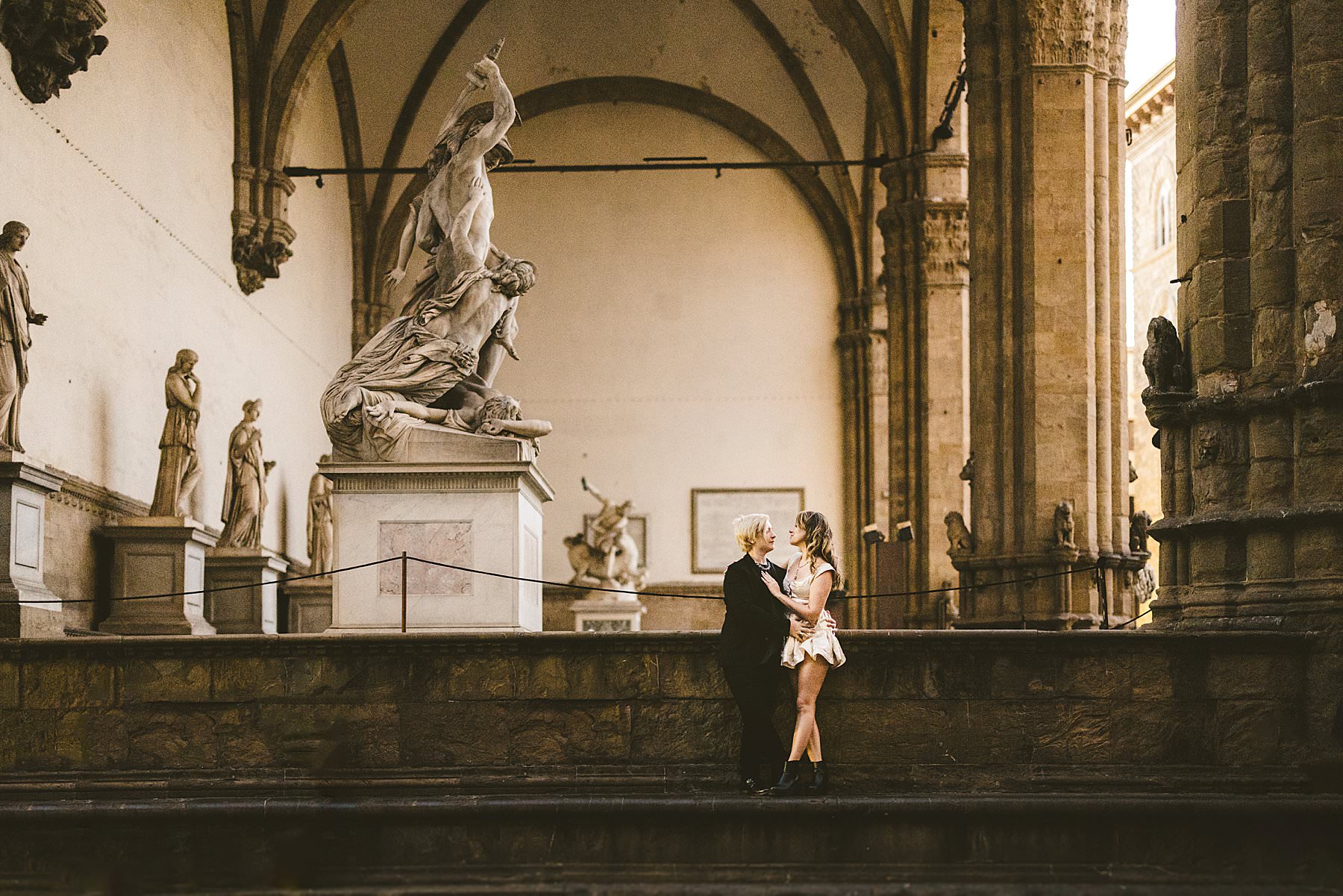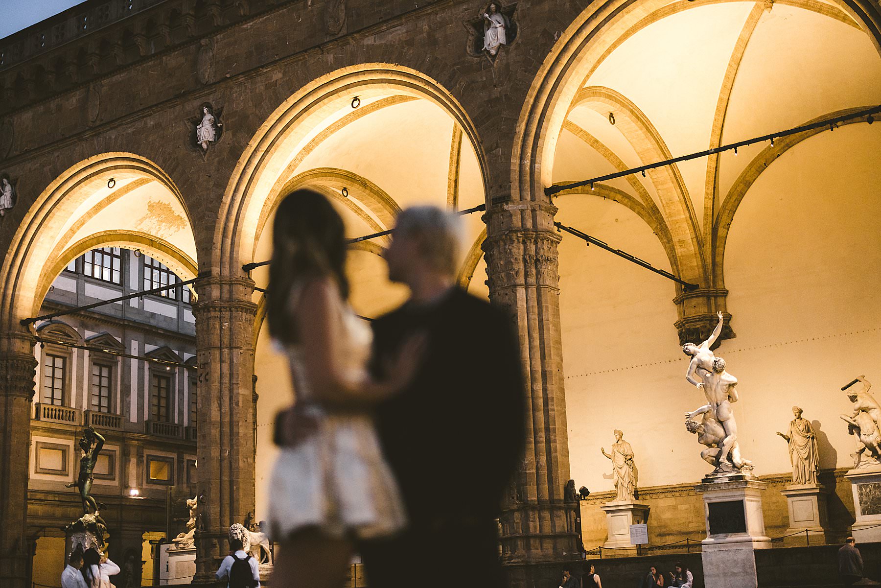 Sweet and romantic couple portrait photo shoot in the historical center of Florence, Italy near Palazzo Vecchio and Uffizi Museum. Photo by the Italian elegant creative and modern proposal photographer in Tuscany based Florence, Italy
