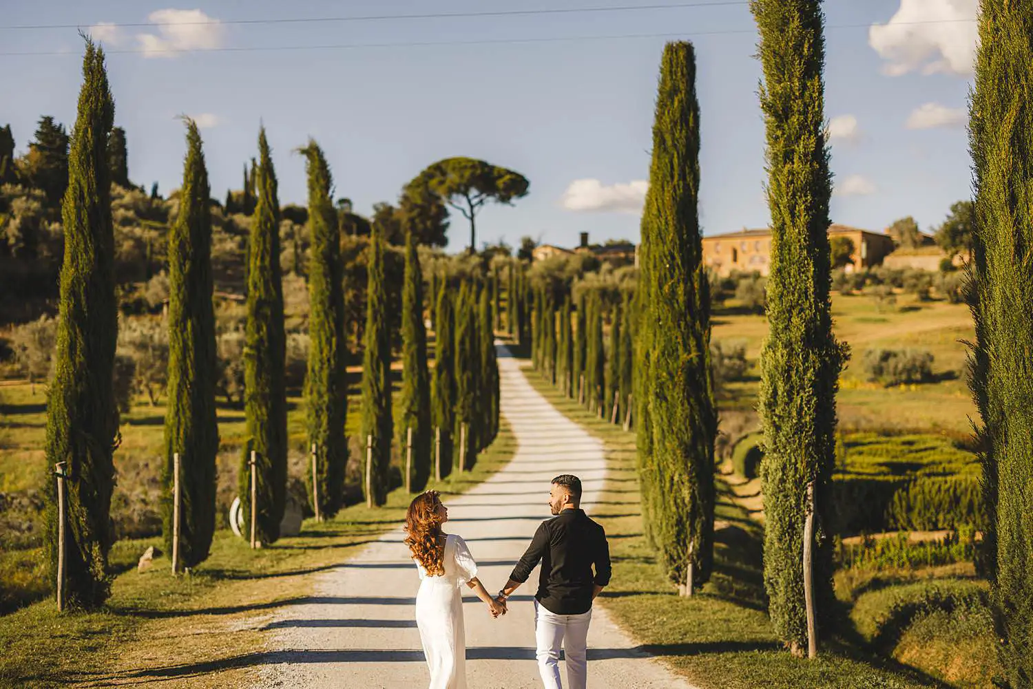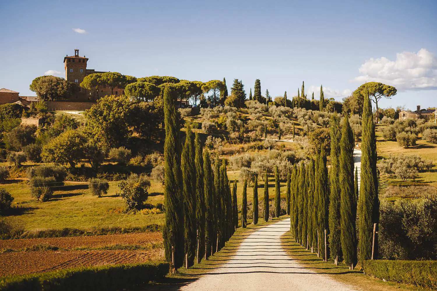 The iconic cypress-lined avenue leading to the estate is among the most beautiful and romantic spots in the Val d’Orcia. Framed by rolling hills, soft light and endless horizons, it offers an atmosphere of quiet elegance that makes it one of the best places to propose in Tuscany. Here, surrounded by nature and silence, the moment feels truly personal and timeless.
